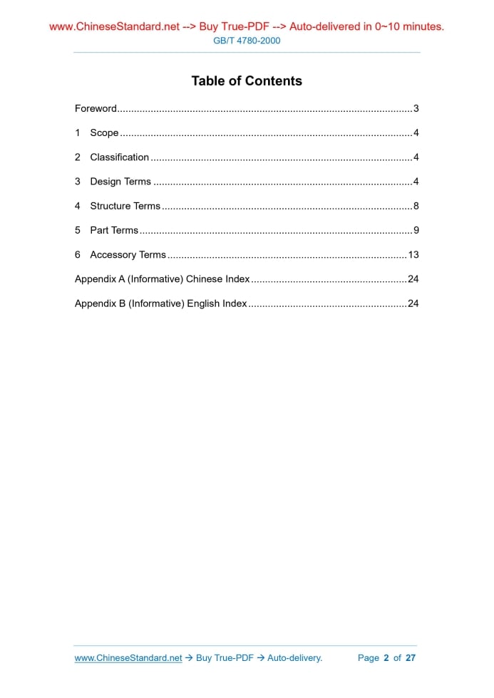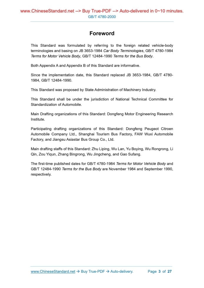 GB/T 4780-2000: Terms for motor vehicle body---This is an excerpt. Full copy of true-PDF in English version (including equations, symbols, images, flow-chart, tables, and figures etc.), auto-downloaded/delivered in 9 seconds, can be purchased online: https://www.ChineseStandard.net/PDF.aspx/GBT4780-2000GB NATIONAL STANDARD OF THE PEOPLE’S REPUBLIC OF CHINA ICS 43.040.60 T 26 Replacing GB/T 4780-1984 GB/T 12484-1990 Terms for Motor Vehicle Body Issued on: JUNE 10, 2000 Implemented on: JANUARY 01, 2001 Issued by. State Bureau of Quality and Technical Supervision Table of ContentsForeword. 3 1 Scope.. 4 2 Classification.. 4 3 Design Terms. 4 4 Structure Terms. 8 5 Part Terms. 9 6 Accessory Terms. 13 Appendix A (Informative) Chinese Index. 24 Appendix B (Informative) English Index.. 24ForewordThis Standard was formulated by referring to the foreign related vehicle-body terminologies and basing on JB 3653-1984 Car Body Terminologies, GB/T 4780-1984 Terms for Motor Vehicle Body, GB/T 12484-1990 Terms for the Bus Body. Both Appendix A and Appendix B of this Standard are informative. Since the implementation date, this Standard replaced JB 3653-1984, GB/T 4780- 1984, GB/T 12484-1990. This Standard was proposed by State Administration of Machinery Industry. This Standard shall be under the jurisdiction of National Technical Committee for Standardization of Automobile. Main Drafting organizations of this Standard. Dongfeng Motor Engineering Research Institute. Participating drafting organizations of this Standard. Dongfeng Peugeot Citroen Automobile Company Ltd., Shanghai Tourism Bus Factory, FAW Wuxi Automobile Factory, and Jiangsu Asiastar Bus Group Co., Ltd. Main drafting staffs of this Standard. Zhu Liping, Wu Lan, Yu Boying, Wu Rongrong, Li Qin, Zou Yiqun, Zhang Bingrong, Wu Jingcheng, and Gao Sufang. The first-time published dates for GB/T 4780-1984 Terms for Motor Vehicle Body and GB/T 12484-1990 Terms for the Bus Body are November 1984 and September 1990, respectively. Terms for Motor Vehicle Body 1 Scope This Standard specifies the terms and definitions of vehicle body. This Standard is applicable to the vehicle body of car, bus and truck. 2 Classification This Standard divides the vehicle body terms into design terms, structure terms, part terms and accessory terms; those that are applicable to car shall be expressed by the Letter A; those that are applicable to the bus shall be expressed by Letter B; while those that are applicable to the truck shall be expressed by Letter C. 3 Design Terms The design terms shall refer to Table 1. Table 1 -- Design Terms SN Terms Definitions Figure No. Applicable 3.1 Body The site for the driver’s operation and accommodating the passengers and goods. Its Main function is to provide safe, comfortable ride environment for the occupants; isolate the vibration and noise, not be affected by harsh weather. It includes main body, trim, compartment door, hardware, accessory, and other detachable structural A, B, C 3.2 Unitized body; integral body Integral body structure form without independent frame A, B 3.3 Semi-integral body Body and frame are rigidly connected; the structure form that the body is partially loaded A, B, C 3.4 Separate frame construction The form of body structure suspended on the frame A, B, C 3.5 One box type body The body of which the engine compartment, passenger space and luggage compartment form ONE space-shape Figure 1 A, B rear-view mirror, wiper, etc. 3.44 Check stop Mechanism limiting the opening degree of compartment door A, B, C 3.45 Adjuster As required by the use function, the total-name of adjustable parts on the body A, B, C 3.46 Anti-theft Device on the vehicle for anti-theft A, B, C 3.47 HVAC; climate control The assembly of parts used for adjusting the temperature, humidity, ventilation in the passenger space A, B, C 3.48 Restrains Total-name of restrains setting in the passenger space for controlling the movement of people and goods A, B, C 3.49 Door opening Net opening on the body cooperated with door A, B, C Table 1 – Completed SN Terms Definitions Figure No. Applicable 3.50 Door frame Closed frame composed of door opening A, B, C 3.51 Rocker Partial parts under the door frame A, B, C 3.52 Jacking point The supporting point on the body designed for assembling and maintaining the vehicle A, B, C 3.53 Seat belt anchor point Parts on the body or seat frame for mounting the anchor point seat belt assembly A, B, C 3.54 Seat anchor point Parts on the body for mounting the seats A, B, C 3.55 Emergency exit Exit for the occupants to evacuate in an emergency; It includes emergency door, emergency window and escape hatch 3.56 Gang way Walking space for the passenger travels from certain (row) seat to other (row) seat or to the edge of topmost step plate of the passenger door. It excludes. a) space about 300mm before the seat; b) space above the step plate or stair; c) space occupying by seat 3.57 Access passage Passage from passenger door or emergency door to the gang way B 3.58 Interior trim Trim inside of the body A, B, C 3.59 Exterior trim Trim outside of the body A, B, C 3.60 Waist line; belt line It is located under the side window, the shape feature line penetrated from front to rear Figure 3 A, B, C 3.61 Opening line Boundary line on the door, hood, luggage compartment cover, and the cover panel Figure 3 A, B, C 3.62 Wheel opening; wheel arch Opening on the body side for the wheel loading and unloading, as well as steering Figure 3 A, B, C 4.17 Connecting panel Panel for connecting A, B, C 4.18 Support Component for supporting A, B, C 4.19 Bracket Component fixing the cantilever part A, B, C 4.20 Grill guard Fence-shaped component for protecting and isolating A, B, C 4.21 Pad Component for isolating and shock absorbing A, B, C 4.22 Hinge Connecting component for the part that rotates around the axis A, B, C 4.23 Striker Part for locking A, B, C 4.24 Boot Shell structural for protecting and shielding against certain me