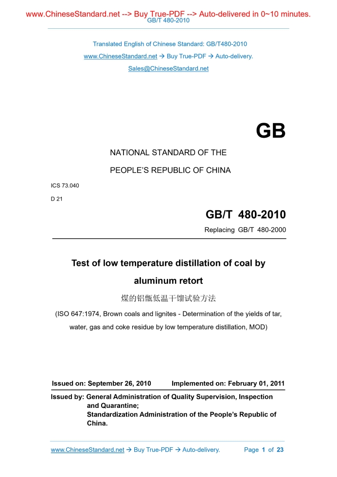 GB/T 480-2010: Test of low temperature distillation of coal by aluminum retort Delivery: 9 seconds. True-PDF full-copy in English & invoice will be downloaded + auto-delivered via email. See step-by-step procedure Status: Valid GB/T 480: Historical versions