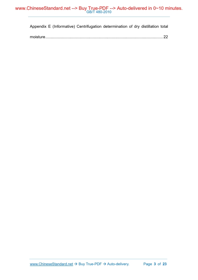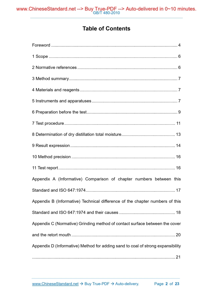 GB/T 480-2010: Test of low temperature distillation of coal by aluminum retort---This is an excerpt. Full copy of true-PDF in English version (including equations, symbols, images, flow-chart, tables, and figures etc.), auto-downloaded/delivered in 9 seconds, can be purchased online: https://www.ChineseStandard.net/PDF.aspx/GBT480-2010NATIONAL STANDARD OF THE PEOPLE’S REPUBLIC OF CHINA ICS 73.040 D 21 Replacing GB/T 480-2000 Test of low temperature distillation of coal by aluminum retort (ISO 647:1974, Brown coals and lignites - Determination of the yields of tar, water, gas and coke residue by low temperature distillation, MOD) ISSUED ON: SEPTEMBER 26, 2010 IMPLEMENTED ON: FEBRUARY 01, 2011 Issued by: General Administration of Quality Supervision, Inspection and Quarantine; Standardization Administration of the People’s Republic of China. Table of ContentsForeword ... 4 1 Scope ... 6 2 Normative references ... 6 3 Method summary ... 7 4 Materials and reagents ... 7 5 Instruments and apparatuses ... 7 6 Preparation before the test ... 9 7 Test procedure ... 11 8 Determination of dry distillation total moisture ... 13 9 Result expression ... 14 10 Method precision ... 16 11 Test report ... 16 Appendix A (Informative) Comparison of chapter numbers between this Standard and ISO 647:1974 ... 17 Appendix B (Informative) Technical difference of the chapter numbers of this Standard and ISO 647:1974 and their causes ... 18 Appendix C (Normative) Grinding method of contact surface between the cover and the retort mouth ... 20 Appendix D (Informative) Method for adding sand to coal of strong expansibility ... 21 Appendix E (Informative) Centrifugation determination of dry distillation total moisture ... 22ForewordThis Standard modifies and adopts ISO 647:1974, Brown coals and lignites - Determination of the yields of tar, water, gas and coke residue by low temperature distillation (English version). This Standard is redrafted in accordance with ISO 647:1974. Compared with ISO 647:1974, there are some adjustments in the structure. Appendix A makes a comparison list of changes in chapter numbers between this Standard and ISO 647:1974. In consideration of China's national conditions, when this Standard is adopted, there are technical differences compared with ISO 647:1974; the terms which are involved in these differences have been marked by vertical single lines (|) on the outer page margins; Appendix B gives a list of corresponding technical differences and their causes. The main technical differences between this Standard and ISO 647:1974 are as follows: -- Remove the calculation method summary of each product yield; -- Retain only electrical heating for the type of heating; remove the gas heating method; -- Add technical requirements for moisture measuring tubes, condensers and balances; -- Add equipment drawings, air tightness inspection methods, and pretreatment methods for coal of strong expansibility; -- Add regulations for the export method of dry distillation products, the method for determining the water content in the condensate (dry distillation total moisture) and the calculation formula for the yield of each product; -- Remove the calculation of coal gas production rate; -- Add conversion and correction formulas for the dry ash-free basis coke residue yield result basis; -- Modify the precision for the determination of dry distillation product yield; This Standard replaces GB 480-2000, Test for carbonization of coal in aluminum retort; compared with GB/T 480-2000, the main technical changes, except editorial changes, are as follows: Test of low temperature distillation of coal by aluminum retort1 ScopeThis Standard specifies the method summary, instruments and apparatuses, test procedure and result expression of the test of low temperature distillation by aluminum retort. This Standard applies to brown coal and soft coal.2 Normative referencesThe terms in the following documents become the terms of this Standard by reference to this Standard. For dated references, all subsequent amendments (not including errata content) or revisions do not apply to this standard. However, parties to agreements that are based on this Standard are encouraged to study whether the latest versions of these documents can be used. For undated references, the latest edition applies to this Standard. GB/T 212, Proximate analysis of coal (GB/T 212-2008, ISO 11722:1999, Solid mineral fuels - Hard coal - Determination of moisture in the general analysis test sample by drying in nitrogen; ISO 1171:1997, Solid mineral fuels - Determination of ash; ISO 562:1998, Hard coal and coke - Determination of volatile matter, NEQ) GB/T 218, Determination of the carbonate carbon dioxide content in coal (GB/T 218-1996, eqv ISO 925:1997) GB 474, Preparation of coal sample (GB 474-2008, ISO 18283:2006, Hard coal and coke - Manual sampling, MOD) GB/T 19494.2, Mechanical sampling of coal - Part 2: Method for sample preparation (GB/T 19494.2-2004, ISO 13909-1:2001 Hard coal and coke - Mechanical sampling - Part 1: General introduction; ISO 13909-4:2001 Hard coal and coke - Mechanical sampling - Part 4: Coal - Preparation of test samples, NEQ)3 Method summaryHold the coal sample in the aluminum retort; use a certain temperature-rising program to heat to 510 °C, and maintain for a certain period of time; measure the yields of tar, pyrolysis water, coke residue and coal gas that are obtained after dry distillation.4 Materials and reagents4.1 Xylene or toluene: chemically pure. 4.2 Lubricating oil and selected flake graphite powder.5 Instruments and apparatuses5.1 Aluminum retort 5.1.1 Aluminum retort body (Figure 1), made of aluminum; 5.1.2 Aluminum retort cover (Figure 2), made of aluminum; 5.1.3 Delivery line (Figure 3), made of copper; 5.1.4 Connecting nut (Figure 4), made of steel. 5.2 Heating device: with temperature control device; specifications and performance shall meet the following requirements: a) The temperature shall 