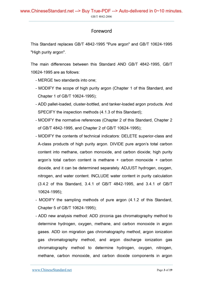 Similar standardsGB/T 4842-2006: Argon---This is an excerpt. Full copy of true-PDF in English version (including equations, symbols, images, flow-chart, tables, and figures etc.), auto-downloaded/delivered in 9 seconds, can be purchased online: https://www.ChineseStandard.net/PDF.aspx/GBT4842-2006ICS 71.100.20 G 86 GB National Standard of the People’s Republic of China Replacing GB/T 4842-1995, GB/T 10624-1995 Argon Issued on: SEPTEMBER 1, 2006 Implemented on: FEBRUARY 1, 2007 Issued by. General Administration of Quality Supervision, Inspection and Quarantine; Standardization Administration Committee. Table of ContentsForeword... 3 1 Scope... 6 2 Normative references... 6 3 Requirements... 7 4 Test methods... 8 5 Labeling, packaging, storage, and security... 11 6 Others... 12 Appendix A... 14 Appendix B... 18ForewordThis Standard replaces GB/T 4842-1995 "Pure argon" and GB/T 10624-1995 "High purity argon". The main differences between this Standard AND GB/T 4842-1995, GB/T 10624-1995 are as follows. - MERGE two standards into one; - MODIFY the scope of high purity argon (Chapter 1 of this Standard, and Chapter 1 of GB/T 10624-1995); - ADD pallet-loaded, cluster-bottled, and tanker-loaded argon products. And SPECIFY the inspection methods (4.1.3 of this Standard); - MODIFY the normative references (Chapter 2 of this Standard, Chapter 2 of GB/T 4842-1995, and Chapter 2 of GB/T 10624-1995); - MODIFY the contents of technical indicators. DELETE superior-class and A-class products of high purity argon. DIVIDE pure argon’s total carbon content into methane, carbon monoxide, and carbon dioxide; high purity argon’s total carbon content is methane + carbon monoxide + carbon dioxide, and it can be determined separately. ADJUST hydrogen, oxygen, nitrogen, and water content. INCLUDE water content in purity calculation (3.4.2 of this Standard, 3.4.1 of GB/T 4842-1995, and 3.4.1 of GB/T 10624-1995); - MODIFY the sampling methods of pure argon (4.1.2 of this Standard, Chapter 5 of GB/T 10624-1995); - ADD new analysis method. ADD zirconia gas chromatography method to determine hydrogen, oxygen, methane, and carbon monoxide in argon gases. ADD ion migration gas chromatography method, argon ionization gas chromatography method, and argon discharge ionization gas chromatography method to determine hydrogen, oxygen, nitrogen, methane, carbon monoxide, and carbon dioxide components in argon gases. ADD other methods for the determination of water. When there occurs a variety of analysis methods, add specified arbitration method (4.3 of this Standard); - DELETE the method of adopting ion migration gas chromatography method to determine nitrogen in argon gases, in previous standard (4.2 of GB/T 10624-1995); - ADD safety specifications (5.6 of this Standard); - ADD the Normative Appendix A. And INCLUDE the methods of adopting ion migration gas chromatography method, argon ionization gas chromatography method, and argon discharge ionization gas chromatography method to determine hydrogen, oxygen, nitrogen, methane, carbon monoxide, and carbon dioxide components in argon gases INTO this Appendix (Appendix A of this Standard). Appendix A and Appendix B of this Standard are normative. This Standard was proposed by China Petroleum and Chemical Industry Association. This Standard shall be centralized by the National Standardization Technical Committee of Gases. Main drafting organizations of this Standard. The Oxygen Co., Ltd. of Wuhan Iron and Steel Group. Kena Science and Technology Development Co., Ltd. of Dalian Institute of Chemical Physics, Chinese Academy of Sciences. Beijing Sys Ruitai Sciences and Technology Co., Ltd. and Southwest Research Institute of Chemical Industry. Main drafters of this Standard. Chen Wenyu, Wang Guiyue, Zhang Bingxin, and Zhou Pengyun. The previous versions replaced by this Standard are. GB 4842-1984, GB 4843-1984, GB 10624-1989, GB 10625-1989, GB/T 4842-1995, GB/T 10624-1995. Argon1 ScopeThis Standard specifies the requirements, test methods, packaging, labeling, storage, and security of pure argon and high purity argon. This Standard applies to the gaseous and liquid pure argon, and high purity argon extracted from the air and ammonia exhaust by cryogenic method; and pure argon and high purity argon obtained by purification method. They are mainly used in metal smelting and welding, semiconductor manufacturing, electric light, preparation of standard samples, scientific research and other industries. Molecular formula. Ar. Relative molecular mass. 39.948 (according to 2001 international relative atomic mass).2 Normative referencesThe provisions in following documents become the provisions of this Standard through reference in this Standard. For dated references, the subsequent amendments (excluding corrections) or revisions do not apply to this Standard, however, parties who reach an agreement based on this Standard are encouraged to study if the latest versions of these documents are applicable. For undated references, the latest edition of the referenced document applies. GB 190-1990 Labels for packages of dangerous goods GB/T 3723 Sampling of chemical products for industrial use - Safety in sampling GB 5099 Seamless steel gas cylinders (GB 5099-1994, neq ISO 4705. 1993) GB/T 5832.1 Determination of moisture in gases - Part 1.Electrolytic method GB/T 5832.2 Determination of moisture in gases - Part 2.Dew point method determination results, take the ion migration gas chromatography method as arbitration method. 4.3.5 It is allowed to determine the trace methane, carbon monoxide and carbon dioxide in pure argon and high purity argon according to the methods specified in GB/T 8984.1 or other equivalent methods. It is allowed to determine the total content of trace methane, carbon monoxide, and carbon dioxide in high purity argon according to the methods specified in GB/T 8984.2. When there exists dispute to the above determination results, take the methods specified in GB/T 898