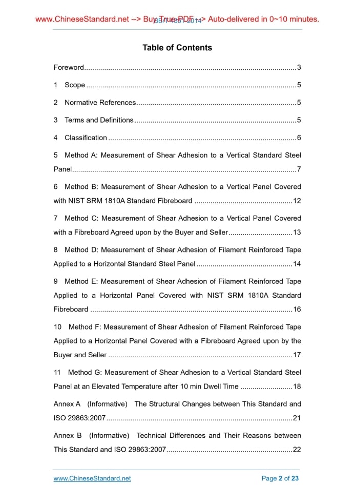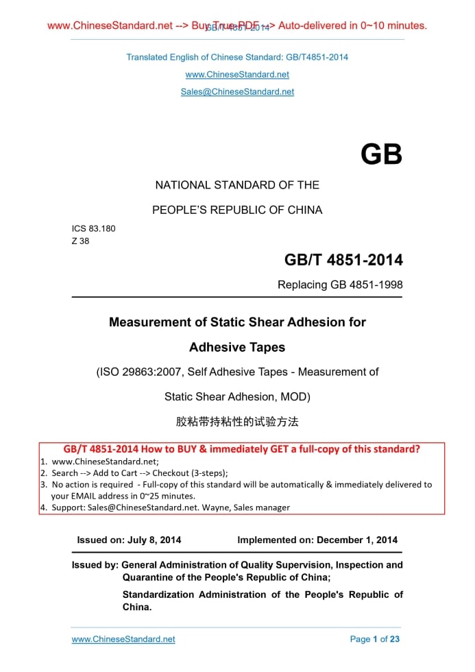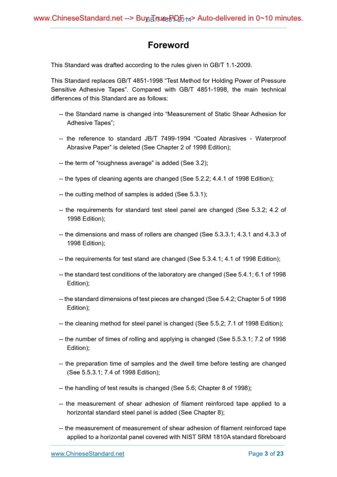 GB/T 4851-2014: Measurement of static shear adhesion for adhesive types---This is an excerpt. Full copy of true-PDF in English version (including equations, symbols, images, flow-chart, tables, and figures etc.), auto-downloaded/delivered in 9 seconds, can be purchased online: https://www.ChineseStandard.net/PDF.aspx/GBT4851-2014GB NATIONAL STANDARD OF THE PEOPLE’S REPUBLIC OF CHINA ICS 83.180 Z 38 Replacing GB 4851-1998 Measurement of Static Shear Adhesion for Adhesive Tapes (ISO 29863.2007, Self Adhesive Tapes - Measurement of Static Shear Adhesion, MOD) Issued on: JULY 8, 2014 Implemented on: DECEMBER 1, 2014 Issued by. General Administration of Quality Supervision, Inspection and Quarantine of the People's Republic of China; Standardization Administration of the People's Republic of China. Table of ContentsForeword ... 3 1 Scope ... 5 2 Normative References ... 5 3 Terms and Definitions ... 5 4 Classification ... 6 5 Method A. Measurement of Shear Adhesion to a Vertical Standard Steel Panel ... 7 6 Method B. Measurement of Shear Adhesion to a Vertical Panel Covered with NIST SRM 1810A Standard Fibreboard ... 12 7 Method C. Measurement of Shear Adhesion to a Vertical Panel Covered with a Fibreboard Agreed upon by the Buyer and Seller ... 13 8 Method D. Measurement of Shear Adhesion of Filament Reinforced Tape Applied to a Horizontal Standard Steel Panel ... 14 9 Method E. Measurement of Shear Adhesion of Filament Reinforced Tape Applied to a Horizontal Panel Covered with NIST SRM 1810A Standard Fibreboard ... 16 10 Method F. Measurement of Shear Adhesion of Filament Reinforced Tape Applied to a Horizontal Panel Covered with a Fibreboard Agreed upon by the Buyer and Seller ... 17 11 Method G. Measurement of Shear Adhesion to a Vertical Standard Steel Panel at an Elevated Temperature after 10 min Dwell Time ... 18 Annex A (Informative) The Structural Changes between This Standard and ISO 29863.2007 ... 21 Annex B (Informative) Technical Differences and Their Reasons between This Standard and ISO 29863.2007 ... 22ForewordThis Standard was drafted according to the rules given in GB/T 1.1-2009. This Standard replaces GB/T 4851-1998 “Test Method for Holding Power of Pressure Sensitive Adhesive Tapes”. Compared with GB/T 4851-1998, the main technical differences of this Standard are as follows. -- the Standard name is changed into “Measurement of Static Shear Adhesion for Adhesive Tapes”; -- the reference to standard JB/T 7499-1994 “Coated Abrasives - Waterproof Abrasive Paper” is deleted (See Chapter 2 of 1998 Edition); -- the term of “roughness average” is added (See 3.2); -- the types of cleaning agents are changed (See 5.2.2; 4.4.1 of 1998 Edition); -- the cutting method of samples is added (See 5.3.1); -- the requirements for standard test steel panel are changed (See 5.3.2; 4.2 of 1998 Edition); -- the dimensions and mass of rollers are changed (See 5.3.3.1; 4.3.1 and 4.3.3 of 1998 Edition); -- the requirements for test stand are changed (See 5.3.4.1; 4.1 of 1998 Edition); -- the standard test conditions of the laboratory are changed (See 5.4.1; 6.1 of 1998 Edition); -- the standard dimensions of test pieces are changed (See 5.4.2; Chapter 5 of 1998 Edition); -- the cleaning method for steel panel is changed (See 5.5.2; 7.1 of 1998 Edition); -- the number of times of rolling and applying is changed (See 5.5.3.1; 7.2 of 1998 Edition); -- the preparation time of samples and the dwell time before testing are changed (See 5.5.3.1; 7.4 of 1998 Edition); -- the handling of test results is changed (See 5.6; Chapter 8 of 1998); -- the measurement of shear adhesion of filament reinforced tape applied to a horizontal standard steel panel is added (See Chapter 8); -- the measurement of measurement of shear adhesion of filament reinforced tape applied to a horizontal panel covered with NIST SRM 1810A standard fibreboard Measurement of Static Shear Adhesion for Adhesive Tapes1 ScopeThis Standard specifies a series of test methods for the determination of the ability of an adhesive tape to remain adhered under a constant load applied parallel to the surfaces of the tape and substrate. This Standard applies to the measurement of static shear adhesion for adhesive tapes.2 Normative ReferencesThe following documents are essential to the application of this Standard. For dated references, only the dated editions apply to this Standard. For undated references, the latest edition (including all amendments) applies to this Standard. GB/T 2523-2008 Measuring Method of Surface Roughness and Peak Count for Cold-Rolled Metal Sheet (Strip) GB/T 3280-2007 Cold Rolled Stainless Steel Plate Sheet and Strip GB/T 22396 Terminology Relating to Pressure Sensitive Adhesive Products3 Terms and DefinitionsFor the purpose of this Standard, the following terms and definitions and those defined by GB/T 22396 apply to this Standard. 3.1 Static shear adhesion It is the resistance of the pressure sensitive adhesive against shear when forces are exerted parallel to the bonding surface. 3.2 Roughness average It is the arithmetic average deviations of surface roughness profile, i.e. the arithmetic average of surface roughness profile offset absolute values within the sampled length. 3.3 Test assembly It is the assembly formed after the adhesive tape to be tested is applied to the test -- diacetone alcohol (4-Hydroxy-4-methyl-2-pentanone), non–residual grade; -- methanol; -- methyl ethyl ketone; -- acetone; -- n-heptane; -- isopropyl alcohol; -- a mixture of n-heptane and a fluorinated hydrocarbon such as refrigerant (suitable when toxicity or flammability restrictions apply). Solvents shall be of general purpose chemical grade and held in a suitable dispensing system. 5.3 Apparatus 5.3.1 Test piece cutter A test piece cutter shall hold two single edge razor blades in parallel planes a precise distance apart, to form a cutter of exact test piece width; two cutters, 12 mm and 24 mm cutting width, shall be availa