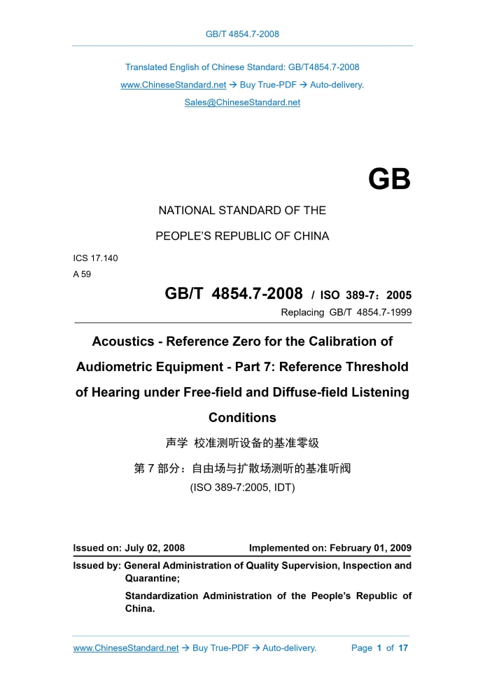GB/T 4854.7-2008: Acoustics -- Reference zero for the calibration of audiometric equipment -- Part 7: Reference threshold of hearing under free-field and diffuse-field listening conditions Delivery: 9 seconds. True-PDF full-copy in English & invoice will be downloaded + auto-delivered via email. See step-by-step procedure Status: Valid GB/T 4854.7: Historical versions