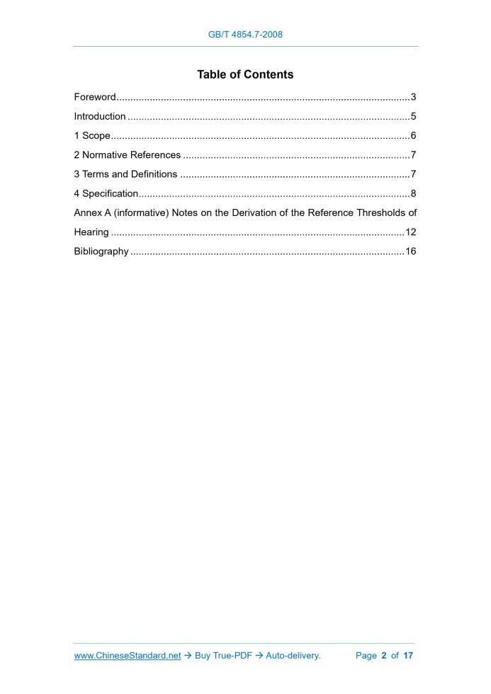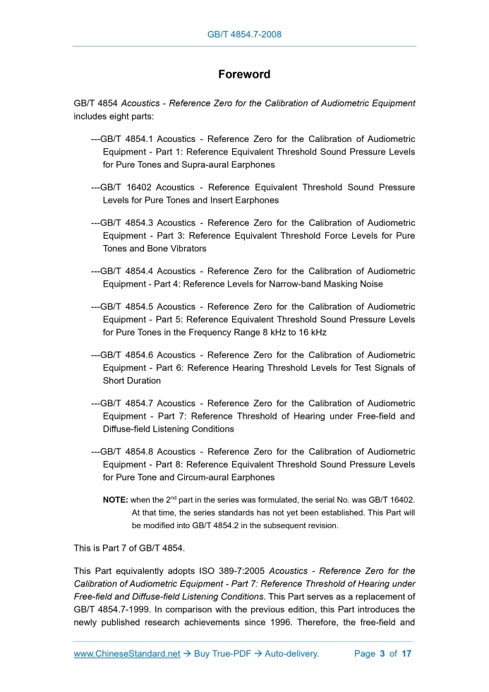 Similar standardsGB/T 4854.7-2008: Acoustics -- Reference zero for the calibration of audiometric equipment -- Part 7: Reference threshold of hearing under free-field and diffuse-field listening conditions---This is an excerpt. Full copy of true-PDF in English version (including equations, symbols, images, flow-chart, tables, and figures etc.), auto-downloaded/delivered in 9 seconds, can be purchased online: https://www.ChineseStandard.net/PDF.aspx/GBT4854.7-2008 GB NATIONAL STANDARD OF THE PEOPLE’S REPUBLIC OF CHINA ICS 17.140 A 59 GB/T 4854.7-2008 / ISO 389-7: 2005 Replacing GB/T 4854.7-1999 Acoustics - Reference Zero for the Calibration of Audiometric Equipment - Part 7: Reference Threshold of Hearing under Free-field and Diffuse-field Listening Conditions (ISO 389-7:2005, IDT) ISSUED ON: JULY 02, 2008 IMPLEMENTED ON: FEBRUARY 01, 2009 Issued by: General Administration of Quality Supervision, Inspection and Quarantine; Standardization Administration of the People’s Republic of China. Table of ContentsForeword ... 3 Introduction ... 5 1 Scope ... 6 2 Normative References ... 7 3 Terms and Definitions ... 7 4 Specification ... 8 Annex A (informative) Notes on the Derivation of the Reference Thresholds of Hearing ... 12 Bibliography ... 16ForewordGB/T 4854 Acoustics - Reference Zero for the Calibration of Audiometric Equipment includes eight parts: ---GB/T 4854.1 Acoustics - Reference Zero for the Calibration of Audiometric Equipment - Part 1: Reference Equivalent Threshold Sound Pressure Levels for Pure Tones and Supra-aural Earphones ---GB/T 16402 Acoustics - Reference Equivalent Threshold Sound Pressure Levels for Pure Tones and Insert Earphones ---GB/T 4854.3 Acoustics - Reference Zero for the Calibration of Audiometric Equipment - Part 3: Reference Equivalent Threshold Force Levels for Pure Tones and Bone Vibrators ---GB/T 4854.4 Acoustics - Reference Zero for the Calibration of Audiometric Equipment - Part 4: Reference Levels for Narrow-band Masking Noise ---GB/T 4854.5 Acoustics - Reference Zero for the Calibration of Audiometric Equipment - Part 5: Reference Equivalent Threshold Sound Pressure Levels for Pure Tones in the Frequency Range 8 kHz to 16 kHz ---GB/T 4854.6 Acoustics - Reference Zero for the Calibration of Audiometric Equipment - Part 6: Reference Hearing Threshold Levels for Test Signals of Short Duration ---GB/T 4854.7 Acoustics - Reference Zero for the Calibration of Audiometric Equipment - Part 7: Reference Threshold of Hearing under Free-field and Diffuse-field Listening Conditions ---GB/T 4854.8 Acoustics - Reference Zero for the Calibration of Audiometric Equipment - Part 8: Reference Equivalent Threshold Sound Pressure Levels for Pure Tone and Circum-aural Earphones NOTE: when the 2nd part in the series was formulated, the serial No. was GB/T 16402. At that time, the series standards has not yet been established. This Part will be modified into GB/T 4854.2 in the subsequent revision. This is Part 7 of GB/T 4854. This Part equivalently adopts ISO 389-7:2005 Acoustics - Reference Zero for the Calibration of Audiometric Equipment - Part 7: Reference Threshold of Hearing under Free-field and Diffuse-field Listening Conditions. This Part serves as a replacement of GB/T 4854.7-1999. In comparison with the previous edition, this Part introduces the newly published research achievements since 1996. Therefore, the free-field and Acoustics - Reference Zero for the Calibration of Audiometric Equipment - Part 7: Reference Threshold of Hearing under Free-field and Diffuse-field Listening Conditions1 ScopeThis Part specifies a reference threshold of hearing for the calibration of audiometric equipment used under the following conditions. a) The sound field in the absence of the listener consists of either a free progressive plane wave (free field) or a diffuse sound field. In the case of a free field, the source of sound is directly in front of the listener (frontal incidence). b) The sound signals are pure (sinusoidal) tones in the case of free-field conditions and one-third octave bands of (white or pink) noise in the case of diffuse-field conditions. c) The sound pressure level is measured in the absence of the listener at the position where the center of the listener’s head would be. d) Listening is binaural. NOTE 1: correction values for the threshold of hearing under free-field listening conditions and selected angles of sound incidence (45° and 90°) deviating from frontal incidence are given in GB/T 16296 for information. NOTE 2: other conditions are given in Bibliographic Reference [1]. The data are given in Table 1, in numerical form for the preferred frequencies in the one-third-octave series from 20 Hz to 16 kHz inclusive in accordance with GB/T 3240 and, in addition, for some intermediate audiometric frequencies up to 18 kHz. It should be emphasized that the threshold data differ from the audiometric zero specified in GB/T 4854.1 and GB/T 16402, since the latter refer to monaural listening through earphones with sound pressure levels referred to specified couplers and ear simulators. Direct comparison between the data in this Part, and GB/T 4854.1 or GB/T 16402 is therefore not appropriate. ......Source: Above contents are excerpted from the full-copy PDF -- translated/reviewed by: www.ChineseStandard.net / Wayne Zheng et al. Tips & Frequently Asked Questions:Question 1: How long will the true-PDF of English version of GB/T 4854.7-2008 be delivered?Answer: The full copy PDF of English version of GB/T 4854.7-2008 can be downloaded in 9 seconds, and it will also be emailed to you in 9 seconds (double mechanisms to ensure the delivery reliably), with PDF-invoice.Question 2: Can I share the purchased PDF of GB/T 4854.7-2008_English with my colleagues?Answer: Yes. The purchased PDF of GB/T 4854.7-2008_English will be deemed to be sold to your employer/organization who actually paid for it, including your colleagues and your employer's intranet.Question 3: Does