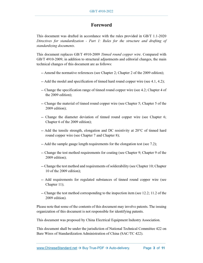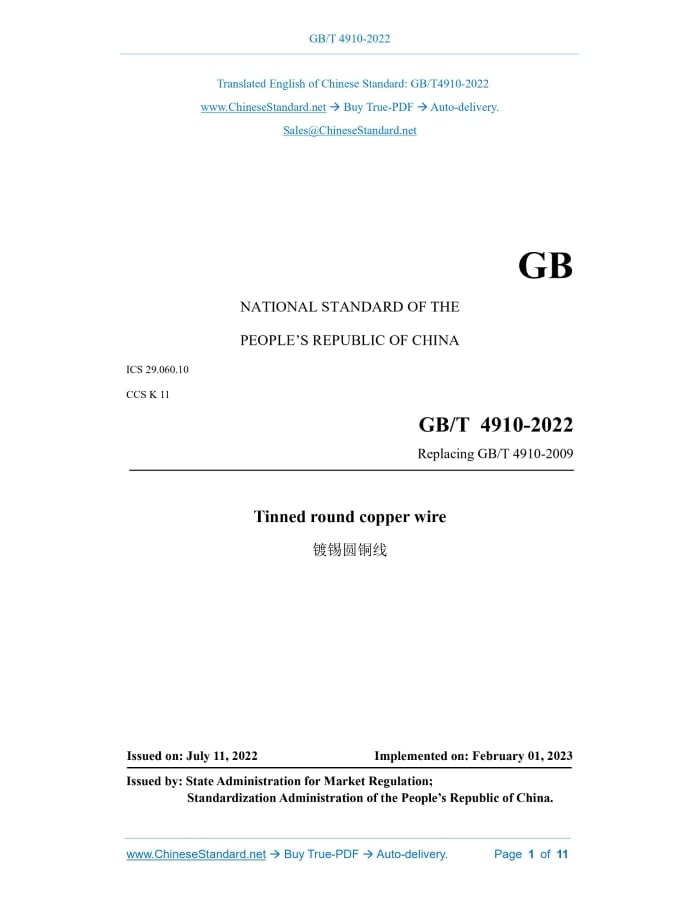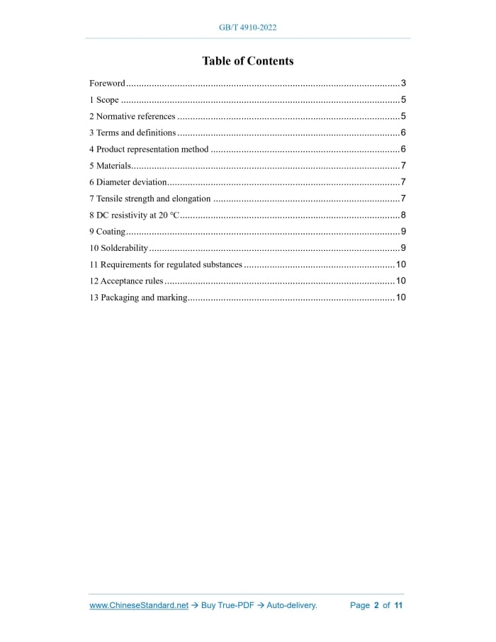 Similar standardsGB/T 4910-2022: Tinned round copper wire---This is an excerpt. Full copy of true-PDF in English version (including equations, symbols, images, flow-chart, tables, and figures etc.), auto-downloaded/delivered in 9 seconds, can be purchased online: https://www.ChineseStandard.net/PDF.aspx/GBT4910-2022GB NATIONAL STANDARD OF THE PEOPLE’S REPUBLIC OF CHINA ICS 29.060.10 CCS K 11 Replacing GB/T 4910-2009 Tinned round copper wire 镀锡圆铜线 ISSUED ON: JULY 11, 2022 IMPLEMENTED ON: FEBRUARY 01, 2023 Issued by: State Administration for Market Regulation; Standardization Administration of the People’s Republic of China. Table of ContentsForeword ... 3 1 Scope ... 5 2 Normative references ... 5 3 Terms and definitions ... 6 4 Product representation method ... 6 5 Materials ... 7 6 Diameter deviation ... 7 7 Tensile strength and elongation ... 7 8 DC resistivity at 20 ℃ ... 8 9 Coating ... 9 10 Solderability ... 9 11 Requirements for regulated substances ... 10 12 Acceptance rules ... 10 13 Packaging and marking ... 10ForewordThis document was drafted in accordance with the rules provided in GB/T 1.1-2020 Directives for standardization - Part 1: Rules for the structure and drafting of standardizing documents. This document replaces GB/T 4910-2009 Tinned round copper wire. Compared with GB/T 4910-2009, in addition to structural adjustments and editorial changes, the main technical changes of this document are as follows: -- Amend the normative references (see Chapter 2; Chapter 2 of the 2009 edition); -- Add the model and specification of tinned hard round copper wire (see 4.1, 4.2); -- Change the specification range of tinned round copper wire (see 4.2; Chapter 4 of the 2009 edition); -- Change the material of tinned round copper wire (see Chapter 5; Chapter 5 of the 2009 edition); -- Change the diameter deviation of tinned round copper wire (see Chapter 6; Chapter 6 of the 2009 edition); -- Add the tensile strength, elongation and DC resistivity at 20°C of tinned hard round copper wire (see Chapter 7 and Chapter 8); -- Add the sample gauge length requirements for the elongation test (see 7.2); -- Change the test method requirements for coating (see Chapter 9; Chapter 9 of the 2009 edition); -- Change the test method and requirements of solderability (see Chapter 10; Chapter 10 of the 2009 edition); -- Add requirements for regulated substances of tinned round copper wire (see Chapter 11); -- Change the test method corresponding to the inspection item (see 12.2; 11.2 of the 2009 edition). Please note that some of the contents of this document may involve patents. The issuing organization of this document is not responsible for identifying patents. This document was proposed by China Electrical Equipment Industry Association. This document shall be under the jurisdiction of National Technical Committee 422 on Bare Wires of Standardization Administration of China (SAC/TC 422). Tinned round copper wire1 ScopeThis document specifies the models, specifications, materials, diameter deviation, mechanical and electrical properties, coating, solderability, requirements for regulated substances, acceptance rules, packaging and marking of tinned round copper wire. This document applies to tinned round copper wires for connecting wires, cables and electronic equipment, including tinned soft round copper wires, solderable tinned soft round copper wires and tinned hard round copper wires.2 Normative referencesThe following documents, in whole or in part, are normatively referenced in this document and are indispensable to its application. For dated references, only the version corresponding to that date is applicable to this document; for undated references, the latest version (including all amendments) is applicable to this document. GB/T 728, Tin ingot GB/T 2423.28-2005, Basic environmental testing procedures for electric and electronic products - Part 2: Test methods - Test T: Soldering GB/T 3048.2, Test methods for electrical properties of electric cables and wires. Part 2: Test of electrical resistivity of metallic materials GB/T 3952, Copper drawing stock for electrical purpose GB/T 4909.2, Test methods for bare wires - Part 2: Measurement of dimensions GB/T 4909.3, Test methods for bare wires - Part 3: Tensile test GB/T 4909.9-2009, Test methods for bare wires - Part 9: Test for continuity of coating - Sodium polysulfide solution method GB/T 4909.10, Test methods for bare wires - Part 10: Test for continuity of coating - Ammonium persulphate solution method GB/T 4909.11, Test methods for bare wires - Part 11: Test for adherence of coating GB/T 4909.12, Test methods for bare wires - Part 12: Solderability test of coating - Solder globule method GB/T 26125, Electrical and electronic products - Determination of six regulated substances (lead, mercury, cadmium, hexavalent chromium, polybrominated biphenyls, polybrominated diphenyl ethers) GB/T 26572, Requirements of concentration limits for certain restricted substances in electrical and electronic products3 Terms and definitionsNo terms and definitions need to be defined in this document.4 Product representation method4.1 Models See Table 1 for the models of tinned round copper wires. 4.2 Specifications The specification of tinned round copper wire is indicated by the nominal diameter d, as shown in Table 2. 4.3 Representation method The tinned round copper wire is represented by model, specification and the number of this document. Example 1: TXR 0.500 GB/T 4910-2022 represents: tinned soft round copper wire, of nominal diameter 0.500 mm, in soft state.9 Coating9.1 The surface of the tin coating shall be smooth and continuous, and shall be free from defects affecting product performance. Check with normal vision. 9.2 The tin coating shall be continuous. As required by the buyer, the test for continuity of coating of the tinned round copper wire shall be carried out in accordance with GB/T 4909.9-2009 or GB/T 4909.10. When followi