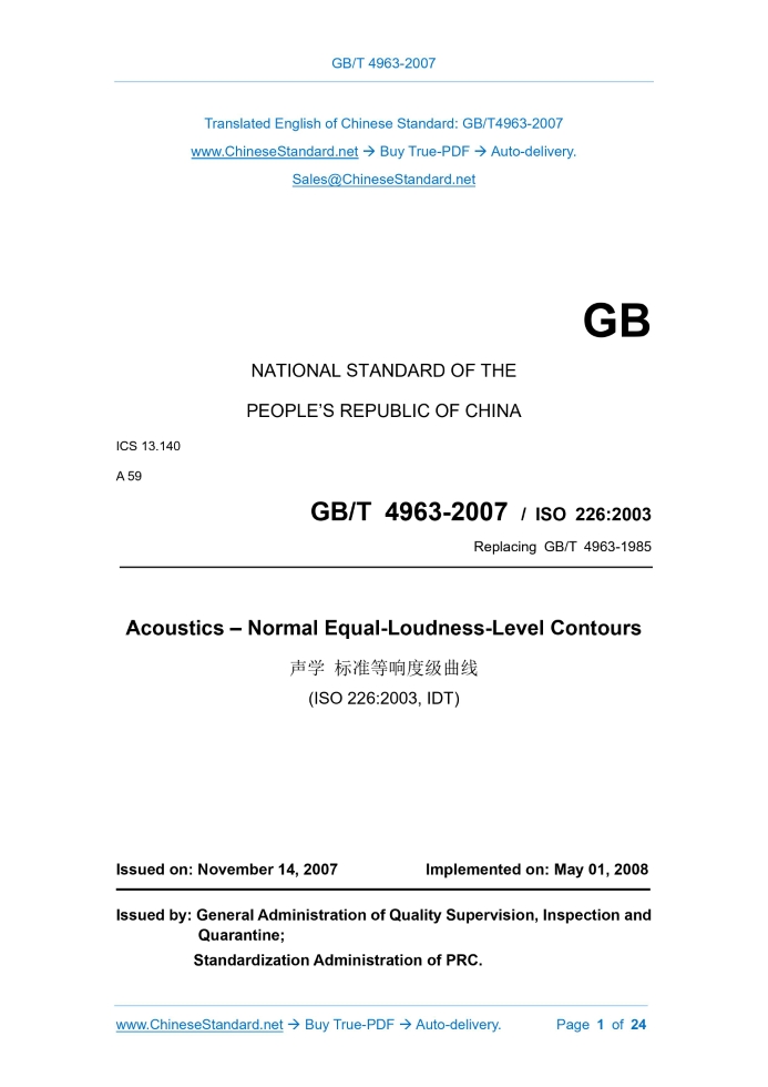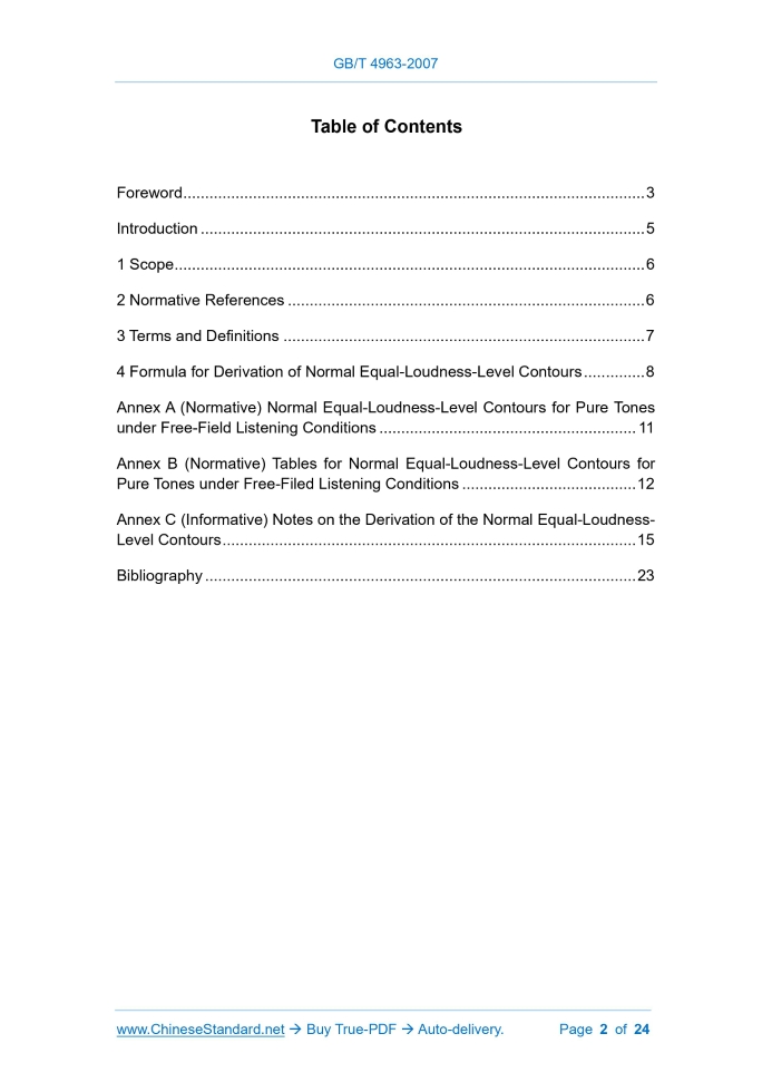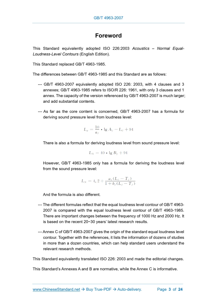 Similar standardsGB/T 4963-2007: Acoustics -- Normal equal-loudness-level contours---This is an excerpt. Full copy of true-PDF in English version (including equations, symbols, images, flow-chart, tables, and figures etc.), auto-downloaded/delivered in 9 seconds, can be purchased online: https://www.ChineseStandard.net/PDF.aspx/GBT4963-2007GB NATIONAL STANDARD OF THE PEOPLE’S REPUBLIC OF CHINA ICS 13.140 A 59 GB/T 4963-2007 / ISO 226:2003 Replacing GB/T 4963-1985 Acoustics – Normal Equal-Loudness-Level Contours (ISO 226:2003, IDT) ISSUED ON: NOVEMBER 14, 2007 IMPLEMENTED ON: MAY 01, 2008 Issued by: General Administration of Quality Supervision, Inspection and Quarantine; Standardization Administration of PRC. Table of ContentsForeword ... 3 Introduction ... 5 1 Scope ... 6 2 Normative References ... 6 3 Terms and Definitions ... 7 4 Formula for Derivation of Normal Equal-Loudness-Level Contours ... 8 Annex A (Normative) Normal Equal-Loudness-Level Contours for Pure Tones under Free-Field Listening Conditions ... 11 Annex B (Normative) Tables for Normal Equal-Loudness-Level Contours for Pure Tones under Free-Filed Listening Conditions ... 12 Annex C (Informative) Notes on the Derivation of the Normal Equal-Loudness- Level Contours ... 15 Bibliography ... 23ForewordThis Standard equivalently adopted ISO 226:2003 Acoustics – Normal Equal- Loudness-Level Contours (English Edition). This Standard replaced GB/T 4963-1985. The differences between GB/T 4963-1985 and this Standard are as follows: --- GB/T 4963-2007 equivalently adopted ISO 226: 2003, with 4 clauses and 3 annexes; GB/T 4963-1985 refers to ISO/R 226: 1961, with only 3 clauses and 1 annex. The capacity of the version referenced by GB/T 4963-2007 is much larger; and add substantial contents. --- As far as the core content is concerned, GB/T 4963-2007 has a formula for deriving sound pressure level from loudness level: There is also a formula for deriving loudness level from sound pressure level: However, GB/T 4963-1985 only has a formula for deriving the loudness level from the sound pressure level: And the formula is also different. --- The different formulas reflect that the equal loudness level contour of GB/T 4963- 2007 is compared with the equal loudness level contour of GB/T 4963-1985. There are important changes between the frequency of 1000 Hz and 2000 Hz. It is based on the recent 20~30 years’ latest research results. --- Annex C of GB/T 4963-2007 gives the origin of the standard equal loudness level contour. Together with the references, it lists the information of dozens of studies in more than a dozen countries, which can help standard users understand the relevant research methods. This Standard equivalently translated ISO 226: 2003 and made the editorial changes. This Standard’s Annexes A and B are normative, while the Annex C is informative. Acoustics – Normal Equal-Loudness-Level Contours1 ScopeThis International Standard specifies combinations of sound pressure levels and frequencies of pure continuous tones which are perceived as equally loud by human listeners. The specifications are based on the following conditions: a) the sound field in the absence of the listener consists of a free progressive plane wave; b) the source of sound is directly in front of the listener; c) the sound signals are pure tones; d) the sound pressure level is measured at the position where the centre of the listener’s head would be, but in the absence of the listener; e) listening is binaural; f) the listeners are otologically normal persons in the age range from 18 years to 25 years inclusive. The data are given in graphical form in Annex A and in numerical form in Annex B for the preferred frequencies in the one-third-octave series from 20 Hz to 12 500 Hz, inclusive, in accordance with GB/T 3240-1982.2 Normative ReferencesThe provisions in following documents become the provisions of this Standard through reference in this Standard. For dated references, the subsequent amendments (excluding corrigendum) or revisions do not apply to this Standard, however, parties who reach an agreement based on this Standard are encouraged to study if the latest versions of these documents are applicable. For undated references, the latest edition of the referenced document applies. GB/T 3240-1982 Preferred Frequencies for the Acoustical Measurement ......Source: Above contents are excerpted from the full-copy PDF -- translated/reviewed by: www.ChineseStandard.net / Wayne Zheng et al. Tips & Frequently Asked Questions:Question 1: How long will the true-PDF of English version of GB/T 4963-2007 be delivered?Answer: The full copy PDF of English version of GB/T 4963-2007 can be downloaded in 9 seconds, and it will also be emailed to you in 9 seconds (double mechanisms to ensure the delivery reliably), with PDF-invoice.Question 2: Can I share the purchased PDF of GB/T 4963-2007_English with my colleagues?Answer: Yes. The purchased PDF of GB/T 4963-2007_English will be deemed to be sold to your employer/organization who actually paid for it, including your colleagues and your employer's intranet.Question 3: Does the price include tax/VAT?Answer: Yes. Our tax invoice, downloaded/delivered in 9 seconds, includes all tax/VAT and complies with 100+ countries' tax regulations (tax exempted in 100+ countries) -- See Avoidance of Double Taxation Agreements (DTAs): List of DTAs signed between Singapore and 100+ countriesQuestion 4: Do you accept my currency other than USD?Answer: Yes. www.ChineseStandard.us -- GB/T 4963-2007 -- Click this link and select your country/currency to pay, the exact amount in your currency will be printed on the invoice. Full PDF will also be downloaded/emailed in 9 seconds.Question 5: Should I purchase the latest version GB/T 4963-2007?Answer: Yes. Unless special scenarios such as technical constraints or academic study, you should always prioritize to purchase the latest version GB/T 4963-2007 even if the enforcement date i