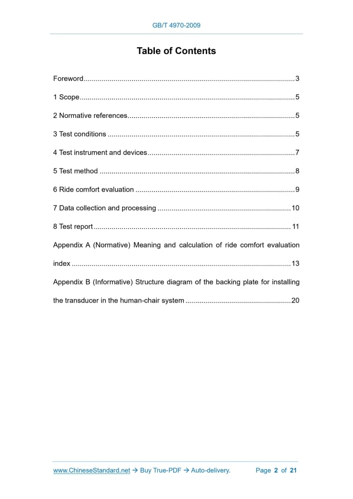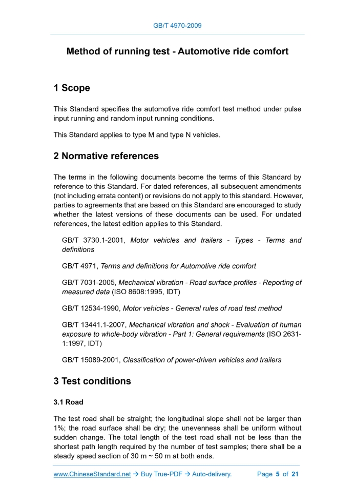 Similar standardsGB/T 4970-2009: Method of running test -- Automotive ride comfort---This is an excerpt. Full copy of true-PDF in English version (including equations, symbols, images, flow-chart, tables, and figures etc.), auto-downloaded/delivered in 9 seconds, can be purchased online: https://www.ChineseStandard.net/PDF.aspx/GBT4970-2009GB NATIONAL STANDARD OF THE PEOPLE’S REPUBLIC OF CHINA ICS 43.040.50 T 23 Replacing GB/T 5902-1986, GB/T 4970-1996 Method of running test - Automotive ride comfort (ISO 2631-1:1997, Mechanical vibration and stock - Evaluation of human exposure to whole-body vibration - Part 1: General requirements, NEQ) ISSUED ON: OCTOBER 30, 2009 IMPLEMENTED ON: JULY 01, 2010 Issued by: General Administration of Quality Supervision, Inspection and Quarantine; Standardization Administration of the People’s Republic of China. Table of ContentsForeword ... 3 1 Scope ... 5 2 Normative references ... 5 3 Test conditions ... 5 4 Test instrument and devices ... 7 5 Test method ... 8 6 Ride comfort evaluation ... 9 7 Data collection and processing ... 10 8 Test report ... 11 Appendix A (Normative) Meaning and calculation of ride comfort evaluation index ... 13 Appendix B (Informative) Structure diagram of the backing plate for installing the transducer in the human-chair system ... 20 Method of running test - Automotive ride comfort1 ScopeThis Standard specifies the automotive ride comfort test method under pulse input running and random input running conditions. This Standard applies to type M and type N vehicles.2 Normative referencesThe terms in the following documents become the terms of this Standard by reference to this Standard. For dated references, all subsequent amendments (not including errata content) or revisions do not apply to this standard. However, parties to agreements that are based on this Standard are encouraged to study whether the latest versions of these documents can be used. For undated references, the latest edition applies to this Standard. GB/T 3730.1-2001, Motor vehicles and trailers - Types - Terms and definitions GB/T 4971, Terms and definitions for Automotive ride comfort GB/T 7031-2005, Mechanical vibration - Road surface profiles - Reporting of measured data (ISO 8608:1995, IDT) GB/T 12534-1990, Motor vehicles - General rules of road test method GB/T 13441.1-2007, Mechanical vibration and shock - Evaluation of human exposure to whole-body vibration - Part 1: General requirements (ISO 2631- 1:1997, IDT) GB/T 15089-2001, Classification of power-driven vehicles and trailers3 Test conditions3.1 Road The test road shall be straight; the longitudinal slope shall not be larger than 1%; the road surface shall be dry; the unevenness shall be uniform without sudden change. The total length of the test road shall not be less than the shortest path length required by the number of test samples; there shall be a steady speed section of 30 m ~ 50 m at both ends. The pulse input running test road shall be a bituminous road surface or a cement road surface; the road surface grade is in accordance with the grade-A road surface specified in GB/T 7031-2005. The random input running test road shall be a bituminous road surface or a cement road surface; the specific test road surface grade is determined as required. 3.2 Wind speed The wind speed is not more than 5 m/s. 3.3 Automotive technology status 3.3.1 All automobile assemblies, parts, accessories and auxiliary devices (including tools and spare tires) shall be fully equipped as required and installed in the specified positions. The adjustment status shall meet the requirements of the vehicle design technical conditions. 3.3.2 The tire inflation pressure shall meet the requirements of the vehicle design technical conditions; the error shall not exceed ±3% of the specified inflation pressure. 3.4 Load of the vehicle The load of the vehicle is the rated maximum loading mass; other loading conditions can be tested as needed. The load shall be evenly distributed and firmly fixed. During the test, it shall not be shaken or overturned; the mass shall not be changed due to moisture, loss, etc. 3.5 Load of the human-chair system 3.5.1 The load of the test part shall be a real person whose height is 1.70 m ± 0.05 m and weight is 65 kg ± 5 kg. 3.5.2 The load of the non-test part shall comply with the relevant regulations in Table 1 of GB/T 12534-1990. 3.6 Seated position The occupants at the test part shall relax their whole body, wear a seat belt, and place their hands on their thighs naturally. The driver's hands shall be placed on the steering wheel naturally, and the seated position shall be kept unchanged during the test. Under normal circumstances, the occupants shall naturally lean on the backrest; otherwise, it shall be noted. 3.7 Test vehicle speed5 Test method5.1 The acceleration transducer is installed in the following locations: a) Type M vehicles: above the driver and the rear seat cushion on the same side; on the seat back; on the floor where the feet are supported; b) Type N vehicles: above the driver’s seat cushion; on the seat back; on the floor where the feet are supported; at the center of the compartment floor; on the compartment floor at a distance of 300 mm from the compartment sideboard on the same side as the driver and the compartment backboard. The vibration in three directions need be measured above the seat cushion, on the seat back, and on the floor where the feet are supported. The acceleration time history includes vertical (Z-axis) vibration, transverse (Y-axis) vibration and longitudinal (X-axis) vibration. The acceleration transducer on the compartment floor only needs to measure the vertical vibration. The layout of the transducer on the seat back is shown in Figure 2; the transducer on the floor where the feet are supported is arranged in the middle of the driver's (or occupant's) feet. The transducers which are installed above the seat cushion and on the seat back shall b