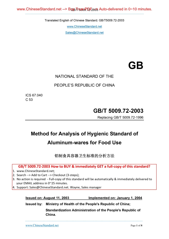 GB/T 5009.72-2003: Method for analysis of hygienic standard of aluminum-wares for food use Delivery: 9 seconds. True-PDF full-copy in English & invoice will be downloaded + auto-delivered via email. See step-by-step procedure Status: Valid GB/T 5009.72: Historical versions