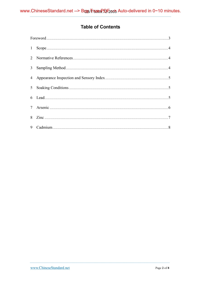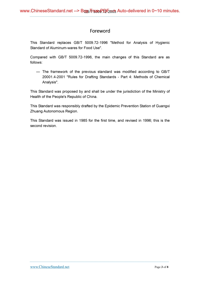 Similar standardsGB/T 5009.72-2003: Method for analysis of hygienic standard of aluminum-wares for food use---This is an excerpt. Full copy of true-PDF in English version (including equations, symbols, images, flow-chart, tables, and figures etc.), auto-downloaded/delivered in 9 seconds, can be purchased online: https://www.ChineseStandard.net/PDF.aspx/GBT5009.72-2003GB NATIONAL STANDARD OF THE PEOPLE’S REPUBLIC OF CHINA ICS 67.040 C 53 Replacing GB/T 5009.72-1996 Method for Analysis of Hygienic Standard of Aluminum-wares for Food Use Issued on: AUGUST 11, 2003 Implemented on: JANUARY 1, 2004 Issued by. Ministry of Health of the People's Republic of China; Standardization Administration of the People's Republic of China. Table of ContentsForeword... 3 1 Scope... 4 2 Normative References... 4 3 Sampling Method... 4 4 Appearance Inspection and Sensory Index... 5 5 Soaking Conditions... 5 6 Lead... 5 7 Arsenic... 6 8 Zinc... 7 9 Cadmium... 8ForewordThis Standard replaces GB/T 5009.72-1996 "Method for Analysis of Hygienic Standard of Aluminum-wares for Food Use". Compared with GB/T 5009.72-1996, the main changes of this Standard are as follows. — The framework of the previous standard was modified according to GB/T 20001.4-2001 "Rules for Drafting Standards - Part 4.Methods of Chemical Analysis". This Standard was proposed by and shall be under the jurisdiction of the Ministry of Health of the People's Republic of China. This Standard was responsibly drafted by the Epidemic Prevention Station of Guangxi Zhuang Autonomous Region. This Standard was issued in 1985 for the first time, and revised in 1996; this is the second revision. Method for Analysis of Hygienic Standard of Aluminum-Wares for Food Use1 ScopeThis Standard specifies the analysis methods for each hygienic index of various punched or cast aluminum cookers, wares for food use, and vessels that directly contact with foods. This Standard is applicable to the analysis for each hygienic index of various punched or cast aluminum cookers, wares for food use, and vessels that directly contact with foods.2 Normative ReferencesThe following standards contain provisions which, through reference in this text, constitute provisions of this Standard. For dated reference, subsequent amendments (excluding corrigendum) or revisions of these publications do not apply. However, the parties who enter into agreements based on this Standard are encouraged to investigate the possibility of applying the most recent editions of the standards. For undated references, the latest edition of the normative document referred to applies. GB/T 5009.11-2003 Determination of total arsenic and abio-arsenic in food GB/T 5009.14-2003 Determination of zinc in foods GB/T 5009.62-2003 Method for analysis of hygienic standard of ceramics for food containers GB 11333 Hygienic standard for aluminum-wares for food use3 Sampling MethodSample 0.1% of the product as the inspection specimen; for small-batch production, it shall not be less than 6 pieces for each time of sampling. Product name, batch number, and sampling date shall be noted respectively. Half of the samples are used for assay; and the other half are preserved two months for arbitrary analysis. 6.2.2 Analysis procedures 6.2.2.1 Take 25.00mL of refined aluminum sample soaking solution and 5.0 mL of lead standard working solution (equivalent to 5.0μg of lead); respectively place in two 25mL colorimetrical cylinders with stoppers; operate according to Article 6.2.2 of GB/T 5009.62-2003. 6.2.2.2 Take 2.00mL of recycled aluminum sample soaking solution and 10mL of lead standard working solution (equivalent to 10.00μg of lead); operate according to Article 6.2.2 of GB/T 5009.62-2003. 6.2.3 Result calculation The same as Article 6.2.3 in GB/T 5009.62-2003. Result expression. Refined aluminum report is less than or greater than 0.2 mg/L; recycled aluminum report is less than or greater than 5mg/L.7 Arsenic7.1 Principle, Reagent and Instrument The same as Method III in GB/T 5009.11-2003. 7.2 Analysis Procedures Take 25.0mL of sample soaking solution; add the soaking solution into the arsenic-measuring flask; add in 5mL of hydrochloric acid, 5mL of potassium iodide solution, and 5 drops of acidic stannous chloride solution; shake up; stand for 10 minutes; add 2g of arsenic-free metallic zinc; immediately install the arsenic-measuring tube that contains lead acetate cotton and mercuric bromide test paper; place in the dark under 25°C ~ 30°C for 1 hour; take out the mercuric bromide test paper; compare the test paper with the standard. The color spot shall not be deeper than that of the standard. Take 1.0mL of arsenic standard working solution (equivalent to 1.0 μg of arsenic); add into the arsenic-measuring flask; add 5mL of acetic acid (4%) to 25mL; the following, from "add in 5mL of hydrochloric acid", is operated at same time as the sample soaking solution; this is standard arsenic spot. 7.3 Result Expression Report is greater than or less than 0.04 mg/L. 8.6 Precision The absolute difference between two independently-measured results under repeatability condition shall not be greater than 10% of the arithmetic mean.9 Cadmium9.1 Atomic Absorption Spectrometry In accordance with Section 7.1 in GB/T 5009.62-2003. 9.2 Dithizone Method 9.2.1 Principle, reagent and instrument The same as Article 7.2.1~7.2.3 in GB/T 5009.62-2003. 9.2.2 Analysis procedures Take 2 125mL-separating funnels; add 0.1mL of cadmium standard working solution (equivalent to 1 μg of cadmium) and 50.0 mL of acetic acid (4%) into one separating funnel; add 50.0 mL of sample soaking solution into the other separating funnel; respectively add 2mL of potassium sodium tartrate solution, 10mL of sodium hydroxide-potassium cyanide solution, and 2mL of hydroxylamine hydrochloride solution into each separating funnel. The solution shall be shaken up after adding each kind of reagent. The following is operated according to Article 7.2.4 of GB/T 5009.62-2