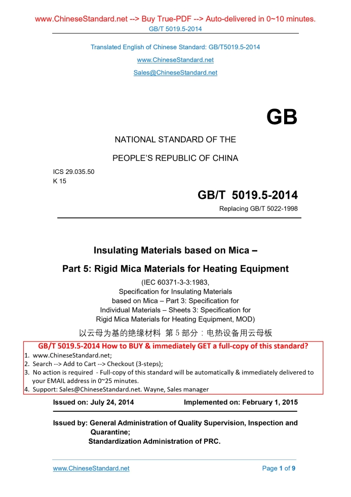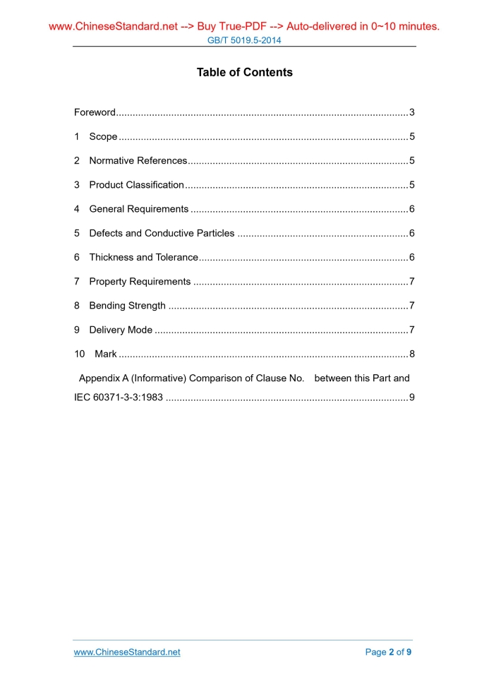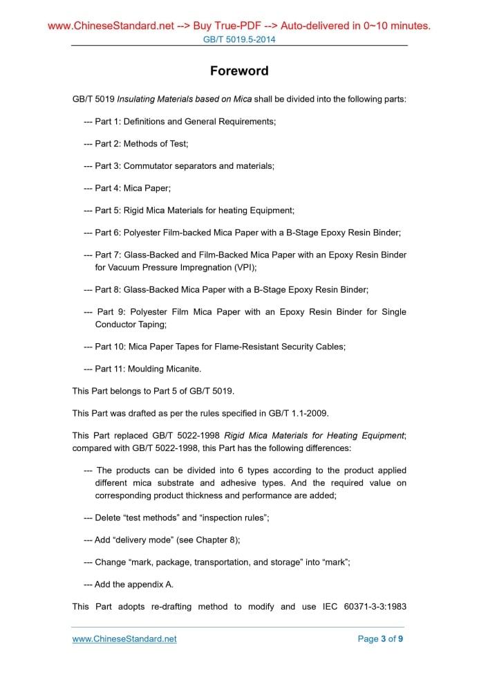 Similar standardsGB/T 5019.5-2014: Insulating materials based on mica -- Part 5: Rigid mica materials for heating equipment---This is an excerpt. Full copy of true-PDF in English version (including equations, symbols, images, flow-chart, tables, and figures etc.), auto-downloaded/delivered in 9 seconds, can be purchased online: https://www.ChineseStandard.net/PDF.aspx/GBT5019.5-2014 GB NATIONAL STANDARD OF THE PEOPLE’S REPUBLIC OF CHINA ICS 29.035.50 K 15 Replacing GB/T 5022-1998 Insulating Materials based on Mica – Part 5.Rigid Mica Materials for Heating Equipment (IEC 60371-3-3.1983, Specification for Insulating Materials based on Mica – Part 3.Specification for Individual Materials – Sheets 3.Specification for Rigid Mica Materials for Heating Equipment, MOD) Issued on: JULY 24, 2014 Implemented on: FEBRUARY 1, 2015 Issued by. General Administration of Quality Supervision, Inspection and Quarantine; Standardization Administration of PRC. Table of ContentsForeword... 3 1 Scope... 5 2 Normative References... 5 3 Product Classification... 5 4 General Requirements... 6 5 Defects and Conductive Particles... 6 6 Thickness and Tolerance... 6 7 Property Requirements... 7 8 Bending Strength... 7 9 Delivery Mode... 7 10 Mark... 8 Appendix A (Informative) Comparison of Clause No. between this Part and IEC 60371-3-3.1983... 9ForewordGB/T 5019 Insulating Materials based on Mica shall be divided into the following parts. --- Part 1.Definitions and General Requirements; --- Part 2.Methods of Test; --- Part 3.Commutator separators and materials; --- Part 4.Mica Paper; --- Part 5.Rigid Mica Materials for heating Equipment; --- Part 6.Polyester Film-backed Mica Paper with a B-Stage Epoxy Resin Binder; --- Part 7.Glass-Backed and Film-Backed Mica Paper with an Epoxy Resin Binder for Vacuum Pressure Impregnation (VPI); --- Part 8.Glass-Backed Mica Paper with a B-Stage Epoxy Resin Binder; --- Part 9.Polyester Film Mica Paper with an Epoxy Resin Binder for Single Conductor Taping; --- Part 10.Mica Paper Tapes for Flame-Resistant Security Cables; --- Part 11.Moulding Micanite. This Part belongs to Part 5 of GB/T 5019. This Part was drafted as per the rules specified in GB/T 1.1-2009. This Part replaced GB/T 5022-1998 Rigid Mica Materials for Heating Equipment; compared with GB/T 5022-1998, this Part has the following differences. --- The products can be divided into 6 types according to the product applied different mica substrate and adhesive types. And the required value on corresponding product thickness and performance are added; --- Delete “test methods” and “inspection rules”; --- Add “delivery mode” (see Chapter 8); --- Change “mark, package, transportation, and storage” into “mark”; --- Add the appendix A. This Part adopts re-drafting method to modify and use IEC 60371-3-3.1983 Insulating Materials based on Mica – Part 5.Rigid Mica Materials for Heating Equipment1 ScopeThis Part of GB/T 5019 specifies the classification, requirements, delivery mode and mark of the splitting-mica-and-mica-paper-based mica plate for electric heating equipment. This Part is applicable to the mica pate combining the splitting mica, mica paper and appropriate adhesive.2 Normative ReferencesThe following documents are essential to the application of this document. For the dated documents, only the versions with the dates indicated are applicable to this document; for the undated documents, only the latest version (including all the amendments) are applicable to this document. GB/T 5019.2-2009 Insulating Materials based on Mica – Part 2.Test Methods (IEC 60317-2.2004, MOD)3 Product ClassificationThe products shall be classified as per its composition and Table 1. Table 1 Mica Plate for Electric Heating Equipment Types Compositions HS1 HS2 HS3 HS4 HS5 HS6 Splitting white mica, organic adhesive Splitting golden mica, organic adhesive Splitting white mica, organic silicone resin adhesive Mica paper, organic adhesive Mica paper, organic silicone resin adhesive Mica paper, inorganic adhesive ......Source: Above contents are excerpted from the full-copy PDF -- translated/reviewed by: www.ChineseStandard.net / Wayne Zheng et al. |