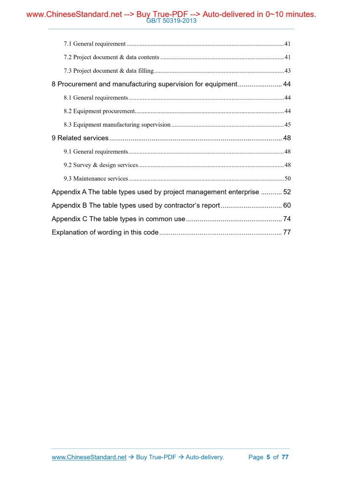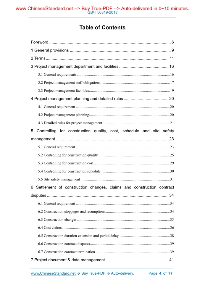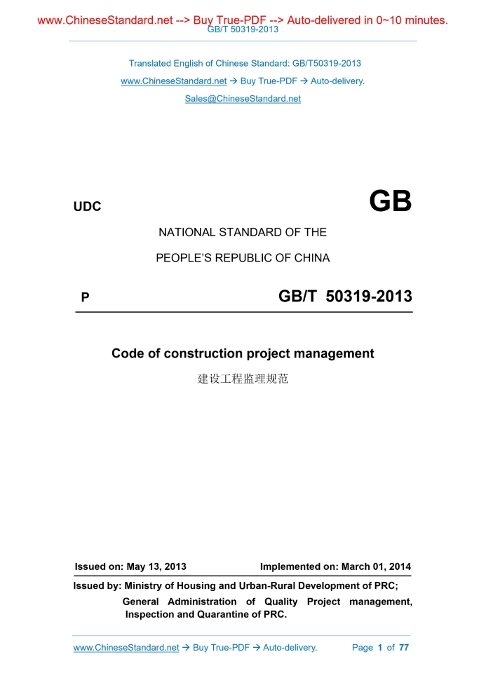 Similar standardsGB/T 50319-2013: Code of construction project management---This is an excerpt. Full copy of true-PDF in English version (including equations, symbols, images, flow-chart, tables, and figures etc.), auto-downloaded/delivered in 9 seconds, can be purchased online: https://www.ChineseStandard.net/PDF.aspx/GBT50319-2013UDC NATIONAL STANDARD OF THE PEOPLE’S REPUBLIC OF CHINA P GB/T 50319-2013 Code of construction project management Issued on. MAY 13, 2013 Implemented on. MARCH 01, 2014 Issued by. Ministry of Housing and Urban-Rural Development of PRC; General Administration of Quality Project management, Inspection and Quarantine of PRC. NATIONAL STANDARD OF THE PEOPLE’S REPUBLIC OF CHINA Code of construction project management Main drafting organization. Ministry of Housing and Urban-Rural Development of PRC Approved by. Ministry of Housing and Urban-Rural Development of PRC Date of implementation. March 01, 2014 2013 Beijing Announcement of Ministry of Housing and Urban- Rural Development of the People's Republic of China No.35 Table of ContentsForeword... 6 1 General provisions... 9 2 Terms... 11 3 Project management department and facilities... 16 4 Project management planning and detailed rules... 20 5 Controlling for construction quality, cost, schedule and site safety management... 23 6 Settlement of construction changes, claims and construction contract disputes... 34 7 Project document & data management... 41 8 Procurement and manufacturing supervision for equipment... 44 9 Related services... 48 Appendix A The table types used by project management enterprise... 52 Appendix B The table types used by contractor’s report... 60 Appendix C The table types in common use... 74 Explanation of wording in this code... 771 General provisions1.0.1 To standardize construction project management and related service activities, improve construction project management and related service levels, this Code is hereby developed. 1.0.2 This Code is applicable to the project management and related service activities of newly built, expanded, re-built construction project. 1.0.3 Before the implementation of construction project management, the construction organization shall entrust a project management department which has corresponding qualifications, conclude a construction project management contract with the project management department in written form. The contract shall include the scope, content, service period, remuneration of the project management work, as well as the relevant clauses on the obligations and liability for breach of contract of both parties. When the construction project management contract is concluded, if the construction organization entrusts the relevant services in such stages as survey, design, warranty as a whole, it shall specify the relevant scope of the service scope, content, service period, remuneration of the relevant services in the contract. 1.0.4 Before the commencement of construction, the building organization shall notify the construction organization in writing of the name of the project management department, the scope, content, authority of the project management, the name of the chief supervisory engineer. 1.0.5 Within the scope of construction project management work, the contact activities involving construction contracts between the building organization and the construction organization shall be carried out via the project management department. 1.0.6 The implementation of construction project management shall be based on the following main basis. 1.Laws, regulations and engineering construction standards; 2.Survey- design documents of construction project; 3.Project management contract and other contract documents of construction project. 1.0.7 Construction project management shall implement the system that the chief project management engineer assumes the responsibility. 1.0.8 Construction project management shall implement information management. 1.0.9 The project management department shall carry out construction project management and related service activities in a fair, independent, honest, scientific manner. 1.0.10 Construction project management and related service activities shall, in addition to complying with this Code, also comply with the relevant current national standards.2 Terms2.0.1 Construction project management enterprise The service institute which is established in accordance with the law and obtains the qualification certificate of engineering management enterprise issued by the competent construction department, is engaged in the construction project management and related service activities. 2.0.2 Construction project management The service activities of the project management department, as entrusted by the building organization and according to the laws and regulations, engineering construction standards, survey-design documents and contracts, in the construction phase, such as controlling the quality, cost, progress of the construction project; managing the contract and information; coordinating the relationship with the relevant parties of the project construction; fulfilling the legal obligations of the Safety production management law on construction project.3 Project management department and facilities3.1 General requirements 3.1.1 When the project management department implements project management, it shall arrange the project management department to station at the construction site. 3.1.2 The supervisory personnel of the project management department shall be composed of the chief project management engineer, specialty project management engineer, supervisor; its professional support and quantity shall meet the needs of construction project management work; if necessary, it may arrange the representative of the chief project management engineer.4 Project management planning and detailed rules4.1 General requirement 4.1.1 The project management planning shall, based on the actual situation o