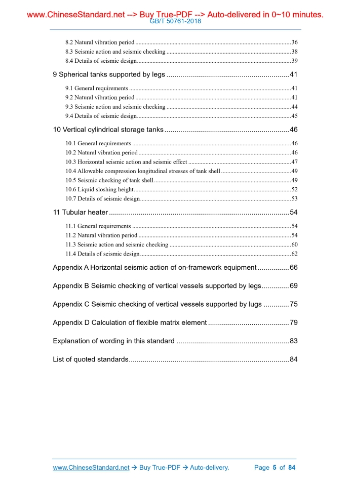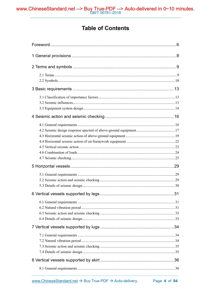 Similar standardsGB/T 50761-2018: Standard for seismic design of petrochemical steel equipment---This is an excerpt. Full copy of true-PDF in English version (including equations, symbols, images, flow-chart, tables, and figures etc.), auto-downloaded/delivered in 9 seconds, can be purchased online: https://www.ChineseStandard.net/PDF.aspx/GBT50761-2018GB NATIONAL STANDARD OF THE PEOPLE’S REPUBLIC OF CHINA UDC P GB/T 50761-2018 Standard for seismic design of petrochemical steel equipment Issued on: JANUARY 16, 2018 Implemented on: SEPTEMBER 01, 2018 Issued by. Ministry of Housing and Urban-Rural Development of PRC; General Administration of Quality Supervision, Inspection and Quarantine of PRC. Table of ContentsForeword... 6 1 General provisions... 8 2 Terms and symbols... 9 2.1 Terms... 9 2.2 Symbols... 10 3 Basic requirements... 13 3.1 Classification of importance factors... 13 3.2 Seismic influences... 13 3.3 Equipment system design... 14 4 Seismic action and seismic checking... 16 4.1 General requirements... 16 4.2 Seismic design response spectral of above-ground equipment... 17 4.3 Horizontal seismic action of above-ground equipment... 19 4.4 Horizontal seismic action of on-framework equipment... 22 4.5 Vertical seismic action... 23 4.6 Combination of loads... 24 4.7 Seismic checking... 25 5 Horizontal vessels... 29 5.1 General requirements... 29 5.2 Seismic action and seismic checking... 29 5.3 Details of seismic design... 30 6 Vertical vessels supported by legs... 31 6.1 General requirements... 31 6.2 Natural vibration period... 31 6.3 Seismic action and seismic checking... 33 6.4 Details of seismic design... 33 7 Vertical vessels supported by lugs... 34 7.1 General requirements... 34 7.2 Natural vibration period... 34 7.3 Seismic action and seismic checking... 35 7.4 Details of seismic design... 35 8 Vertical vessels supported by skirt... 36 8.1 General requirements... 36 8.2 Natural vibration period... 36 8.3 Seismic action and seismic checking... 38 8.4 Details of seismic design... 39 9 Spherical tanks supported by legs... 41 9.1 General requirements... 41 9.2 Natural vibration period... 41 9.3 Seismic action and seismic checking... 44 9.4 Details of seismic design... 45 10 Vertical cylindrical storage tanks... 46 10.1 General requirements... 46 10.2 Natural vibration period... 46 10.3 Horizontal seismic action and seismic effect... 47 10.4 Allowable compression longitudinal stresses of tank shell... 49 10.5 Seismic checking of tank shell... 49 10.6 Liquid sloshing height... 52 10.7 Details of seismic design... 53 11 Tubular heater... 54 11.1 General requirements... 54 11.2 Natural vibration period... 54 11.3 Seismic action and seismic checking... 60 11.4 Details of seismic design... 62 Appendix A Horizontal seismic action of on-framework equipment... 66 Appendix B Seismic checking of vertical vessels supported by legs... 69 Appendix C Seismic checking of vertical vessels supported by lugs... 75 Appendix D Calculation of flexible matrix element... 79 Explanation of wording in this standard... 83 List of quoted standards... 84 Standard for seismic design of petrochemical steel equipment1 General provisions1.0.1 In order to implement the national laws and regulations on earthquake prevention and disaster reduction, implement a prevention-oriented policy, mitigate the seismic damage by seismic-fortifying the petrochemical equipment, reduce economic loss, this standard is hereby formulated. 1.0.2 This standard is applicable to the seismic design of the petrochemical horizontal vessel, vertical vessels supported by legs, vertical vessels supported by lugs, vertical vessels supported by skirt, spherical tanks supported by legs, vertical cylindrical storage tanks, tubular heater, other steel equipment which are used in the area where the basic seismic acceleration not exceeding 0.40 g or seismic fortification intensity of 9 degrees or less. 1.0.3 For the petrochemical equipment which is subjected to the seismic design according to this standard, when it is impacted by the fortification earthquakes equivalent to the seismic fortification intensity of the area, the body, bracing member, anchoring structure shall not be damaged. 1.0.4 The design parameters of ground motion or the seismic fortification intensity shall be determined in accordance with the relevant provisions of the current national standard “Seismic ground motion parameter zonation map of China” GB 18306.For the construction site where the seismic safety evaluation is completed, it shall carry out the seismic fortification according to the approved design parameters of ground motion or the seismic fortification intensity. 1.0.5 The seismic design of petrochemical steel equipment shall, in addition to complying with this standard, also comply with the relevant current national standards.2 Terms and symbols2.1 Terms 2.1.1 Seismic design A specialized design for equipment that requires seismic fortification, including seismic calculations and seismic measures. 2.1.2 Seismic fortification intensity The seismic intensity which is approved according to the authority as specified by the state as a basis for seismic fortification of a region. 2.1.3 Seismic action The dynamic effects of equipment caused by ground motion, including horizontal seismic action and vertical seismic action. 2.1.4 Seismic effect Internal forces or deformations generated by the equipment under seismic action. 2.1.5 Design parameters of ground motion The time-history curve of acceleration of ground motion, the response spectrum of acceleration, the peak acceleration which are used for seismic design. 2.1.6 Design basic acceleration of ground motion The design value of the acceleration of ground motion which exceeds the probability of 10% in the 50-year design base period. 2.1.7 Characteristic period of ground motion In the seismic influence factor curve for seismic design, the period value corresponding to the starting point of the falling segment whi