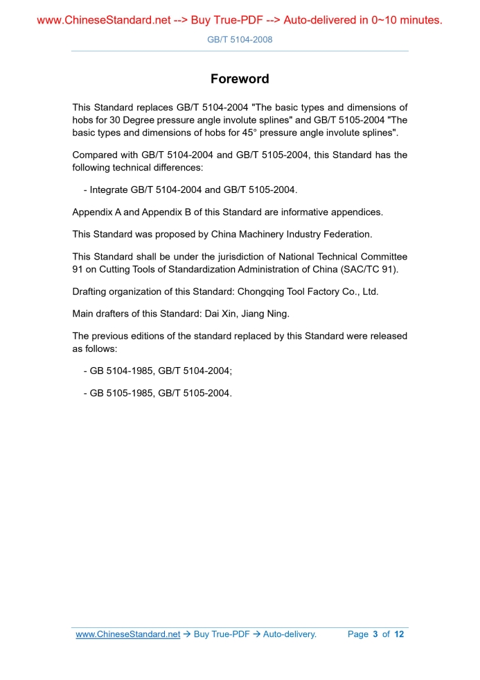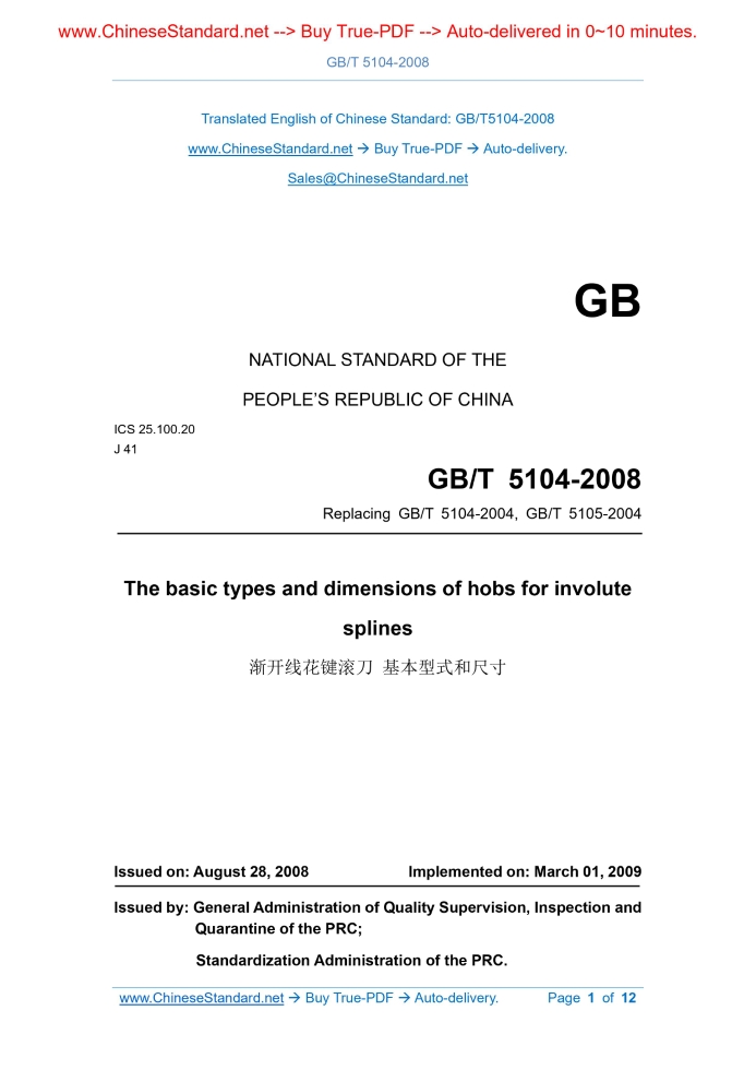 GB/T 5104-2008: The basic types and dimensions of hobs for involute splines Delivery: 9 seconds. True-PDF full-copy in English & invoice will be downloaded + auto-delivered via email. See step-by-step procedure Status: Valid GB/T 5104: Historical versions