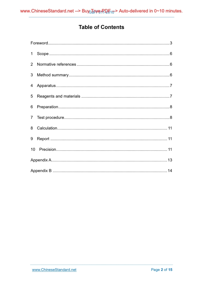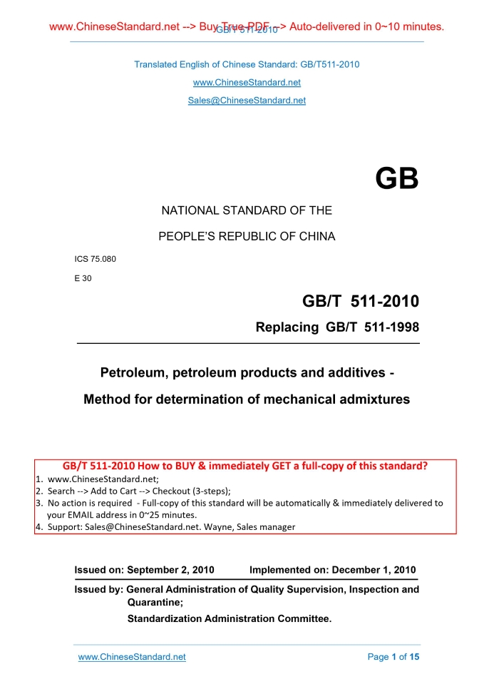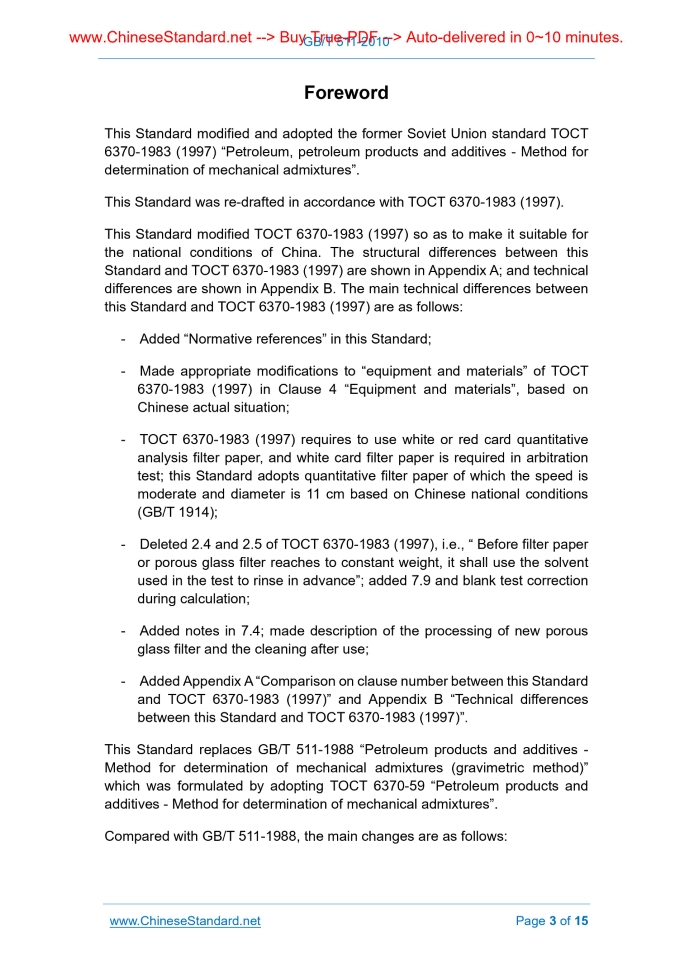 GB/T 511-2010: Petroleum, petroleum products and additives -- Method for determination of mechanical admixtures---This is an excerpt. Full copy of true-PDF in English version (including equations, symbols, images, flow-chart, tables, and figures etc.), auto-downloaded/delivered in 9 seconds, can be purchased online: https://www.ChineseStandard.net/PDF.aspx/GBT511-2010 GB NATIONAL STANDARD OF THE PEOPLE’S REPUBLIC OF CHINA ICS 75.080 E 30 Replacing GB/T 511-1998 Petroleum, petroleum products and additives - Method for determination of mechanical admixtures Issued on. SEPTEMBER 2, 2010 Implemented on. DECEMBER 1, 2010 Issued by. General Administration of Quality Supervision, Inspection and Quarantine; Standardization Administration Committee. Table of ContentsForeword... 3 1 Scope... 6 2 Normative references... 6 3 Method summary... 6 4 Apparatus... 7 5 Reagents and materials... 7 6 Preparation... 8 7 Test procedure... 8 8 Calculation... 11 9 Report... 11 10 Precision... 11 Appendix A... 13 Appendix B... 14ForewordThis Standard modified and adopted the former Soviet Union standard TOCT 6370-1983 (1997) “Petroleum, petroleum products and additives - Method for determination of mechanical admixtures”. This Standard was re-drafted in accordance with TOCT 6370-1983 (1997). This Standard modified TOCT 6370-1983 (1997) so as to make it suitable for the national conditions of China. The structural differences between this Standard and TOCT 6370-1983 (1997) are shown in Appendix A; and technical differences are shown in Appendix B. The main technical differences between this Standard and TOCT 6370-1983 (1997) are as follows. - Added “Normative references” in this Standard; - Made appropriate modifications to “equipment and materials” of TOCT 6370-1983 (1997) in Clause 4 “Equipment and materials”, based on Chinese actual situation; - TOCT 6370-1983 (1997) requires to use white or red card quantitative analysis filter paper, and white card filter paper is required in arbitration test; this Standard adopts quantitative filter paper of which the speed is moderate and diameter is 11 cm based on Chinese national conditions (GB/T 1914); - Deleted 2.4 and 2.5 of TOCT 6370-1983 (1997), i.e., “ Before filter paper or porous glass filter reaches to constant weight, it shall use the solvent used in the test to rinse in advance”; added 7.9 and blank test correction during calculation; - Added notes in 7.4; made description of the processing of new porous glass filter and the cleaning after use; - Added Appendix A “Comparison on clause number between this Standard and TOCT 6370-1983 (1997)” and Appendix B “Technical differences between this Standard and TOCT 6370-1983 (1997)”. This Standard replaces GB/T 511-1988 “Petroleum products and additives - Method for determination of mechanical admixtures (gravimetric method)” which was formulated by adopting TOCT 6370-59 “Petroleum products and additives - Method for determination of mechanical admixtures”. Compared with GB/T 511-1988, the main changes are as follows. - The name of this Standard was modified as “Petroleum, petroleum products and additives - Method for determination of mechanical admixtures”; - The application was modified as. petroleum, liquid petroleum products and additives; not applicable to lubricating grease and asphalt; - Modified porous glass filter specifications in this Standard based on TOCT 6370-1983 (1997); - In reagents, benzene was replaced by toluene, and ethanol-benzene mixed solvent (1.4) was replaced by ethanol- toluene mixed solvent (1.4); - For constant weight paper or porous glass filter, the oven temperature was modified from 105°C~110°C to 105°C±2°C; and the first drying time was modified from “not less than 1h” to “not less than 45 min”; - During preparation, this Standard deleted “when using filter paper, when using ethanol-benzene mixture or ethanol-ether mixture to continue rinsing in the test instead of distilled water, it shall use 50 mL of above- mentioned solvents to rinse the filter paper”; added the calculation of blank test correction in calculation equation; - Dilution ratio of sampling volume and solvent in this Standard was modified based on TOCT 6370-1983 (1997); - Solvent for rinsing in test procedures was modified based on TOCT 6370- 1983 (1997); - During determination of mechanical admixtures in petroleum, this Standard added “use silver nitrate solution to inspect chloride in filtrate”; - Precision was modified according to TOCT 6370-1983 (1997); requirements for repeatability is stricter; added reproducibility. Appendix A and Appendix B of this Standard are informative. This Standard was proposed by National Standardization Technical Committee on Petroleum Products and Lubricants. This Standard shall be under the jurisdiction of Petroleum Fuels and Lubricants Technical Committee of National Standardization Technical Committee on Petroleum Products and Lubricants. The drafting organization of this Standard. North-China Institute of China Petrochemical Sales Co., Ltd. Drafter of this Standard. Chen Chunhui. This Standard replaces the following previous standards. - GB/T 511-1965, GB/T 511-1977, GB/T 511-1988. Petroleum, petroleum products and additives - Method for determination of mechanical admixtures1 ScopeThis Standard specifies the method for determination of mechanical admixtures in petroleum, petroleum products and additives by using constant weight quantitative filter paper or porous glass filter to filter the sample. This Standard is applicable to determination of mechanical admixtures in petroleum, petroleum products and additives. This Standard is not applicable to lubricating grease and asphalt.2 Normative referencesThe following standards contain the provisions which, through reference in this Standard, constitute the provisions of this Standard. For dated references, subsequent amendments (excluding corrections) or revisions do not app