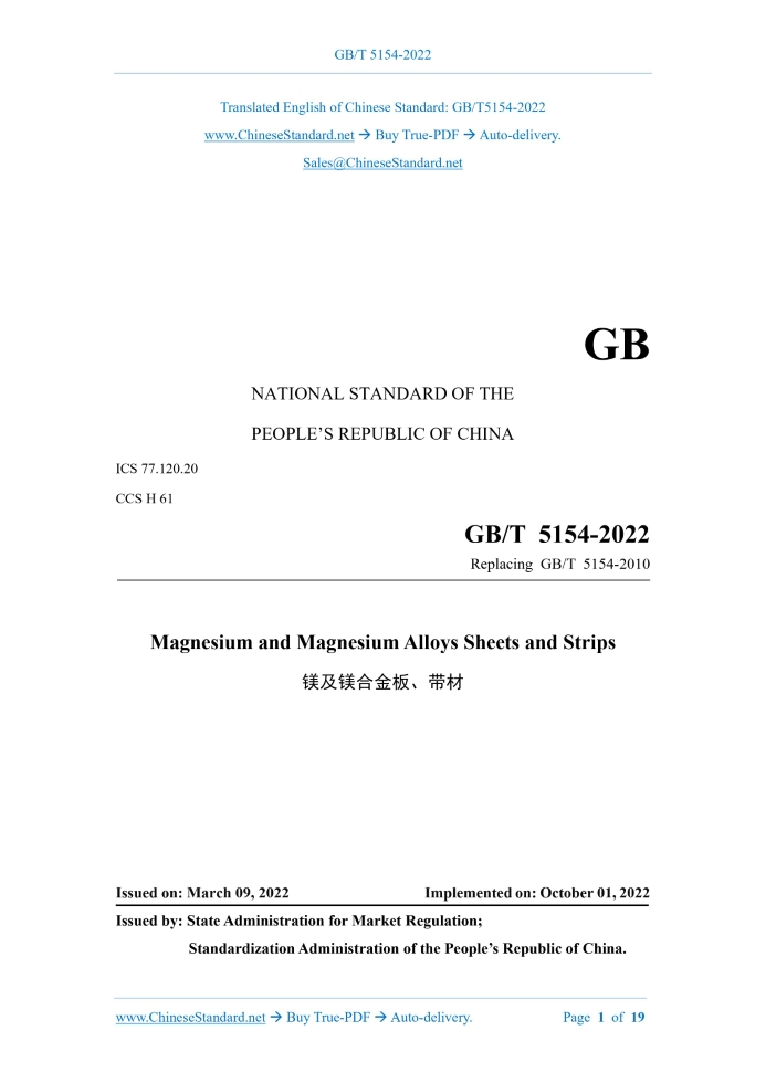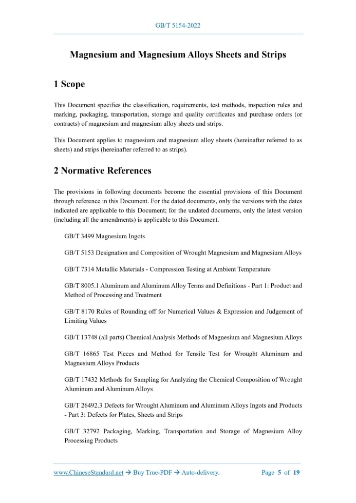 GB/T 5154-2022: Magnesium and magnesium alloys sheets and strips---This is an excerpt. Full copy of true-PDF in English version (including equations, symbols, images, flow-chart, tables, and figures etc.), auto-downloaded/delivered in 9 seconds, can be purchased online: https://www.ChineseStandard.net/PDF.aspx/GBT5154-2022NATIONAL STANDARD OF THE PEOPLE’S REPUBLIC OF CHINA ICS 77.120.20 CCS H 61 Replacing GB/T 5154-2010 Magnesium and Magnesium Alloys Sheets and Strips ISSUED ON: MARCH 09, 2022 IMPLEMENTED ON: OCTOBER 01, 2022 Issued by: State Administration for Market Regulation; Standardization Administration of the People’s Republic of China. Table of ContentsForeword ... 3 1 Scope ... 5 2 Normative References ... 5 3 Terms and Definitions ... 6 4 Classification ... 6 5 Requirements ... 8 6 Test Methods ... 11 7 Inspection Rules ... 12 8 Marking, Packaging, Transportation, Storage and Quality Certificate ... 15 9 Purchaser Order (or Contract) Contents ... 17 Appendix A (Informative) Old & New Designations and Old & New States ... 18 Bibliography ... 19 Magnesium and Magnesium Alloys Sheets and Strips1 ScopeThis Document specifies the classification, requirements, test methods, inspection rules and marking, packaging, transportation, storage and quality certificates and purchase orders (or contracts) of magnesium and magnesium alloy sheets and strips. This Document applies to magnesium and magnesium alloy sheets (hereinafter referred to as sheets) and strips (hereinafter referred to as strips).2 Normative ReferencesThe provisions in following documents become the essential provisions of this Document through reference in this Document. For the dated documents, only the versions with the dates indicated are applicable to this Document; for the undated documents, only the latest version (including all the amendments) is applicable to this Document. GB/T 3499 Magnesium Ingots GB/T 5153 Designation and Composition of Wrought Magnesium and Magnesium Alloys GB/T 7314 Metallic Materials - Compression Testing at Ambient Temperature GB/T 8005.1 Aluminum and Aluminum Alloy Terms and Definitions - Part 1: Product and Method of Processing and Treatment GB/T 8170 Rules of Rounding off for Numerical Values & Expression and Judgement of Limiting Values GB/T 13748 (all parts) Chemical Analysis Methods of Magnesium and Magnesium Alloys GB/T 16865 Test Pieces and Method for Tensile Test for Wrought Aluminum and Magnesium Alloys Products GB/T 17432 Methods for Sampling for Analyzing the Chemical Composition of Wrought Aluminum and Aluminum Alloys GB/T 26492.3 Defects for Wrought Aluminum and Aluminum Alloys Ingots and Products - Part 3: Defects for Plates, Sheets and Strips GB/T 32792 Packaging, Marking, Transportation and Storage of Magnesium Alloy Processing Products 6.1.3 The chemical composition sampling of sheets and strips shall comply with the provisions of GB/T 17432. 6.1.4 The determination of the analytical value shall adopt the rounding-off comparison method. The rounding-off rules of numerical values shall be carried out according to the relevant provisions of GB/T 8170. The rounding-off digits shall be consistent with the limit digits specified in GB/T 3499, GB/T 5153 and Table 2. 6.2 Dimensional deviation 6.2.1 The thickness is measured with a micrometer with an accuracy of 0.01mm or a measuring tool with the same accuracy. The sheets shall be measured within a range of no less than 115mm from the long-sided sheet corner and no less than 20mm from the edge of the sheet; the strip shall be measured thickness in the middle of the end. 6.2.2 The length and width shall be measured by a steel tape with an accuracy of 1mm or a measuring tool with the same accuracy. 6.2.3 When measuring the unevenness, the sheet shall be placed freely on the platform; and the gap between the sheet and the platform shall be measured. When there are several waves in a sheet, the height of the largest wave shall be measured. Edge waves can be measured with measuring tools such as feeler gauges, etc. 6.2.4 Dimensional measurements shall not be rounded-off. 6.3 Mechanical properties 6.3.1 The tensile test of sheet at the room temperature shall be carried out according to the method specified in GB/T 16865. 6.3.2 The compression test of sheet at the room temperature shall be carried out according to the method specified in GB/T 7314. 6.4 Appearance quality In natural scattered light, check the appearance quality visually or using a measuring tool.7 Inspection Rules7.1 Inspection and acceptance 7.1.1 The sheets and strips shall be inspected by the technical supervision department of the supplier to ensure that the product quality conforms to the provisions of this Document and the purchase order (or contract); and the quality certificate shall be filled out. 7.1.2 The purchaser shall inspect the received products according to the provisions of this 7.5.4 When the appearance quality of the product is unqualified, it shall be judged as unqualified.8 Marking, Packaging, Transportation, Storage and QualityCertificate 8.1 Marking 8.1.1 Product marking The sheets and strips that are inspected qualified shall be marked, which shall indicate: a) Designation; b) State; c) Specification; d) Batch No. (sheet No.). 8.1.2 Marking of package box There shall be marks on the two ends of the package box, which shall indicate: a) Name of supplier; b) Designation; c) State; d) Specification; e) Batch No. and net weight; f) The No. of this Document. 8.2 Packaging 8.2.1 The sheets are packed in wooden boxes; and the boxes shall be dry. Two layers of oil- impregnated paper shall be placed on the top and bottom of the sheet stack in the box; the entire sheet stack shall be wrapped with plastic cloth or moisture-proof paper; and the sheet shall not be exposed. 8.2.2 The packaging of the sheet shall be carried out in accordance with the provisions of GB/T 32792. 8.2.3 There shall be a packing list in each box, which shall indicate: a) the nam