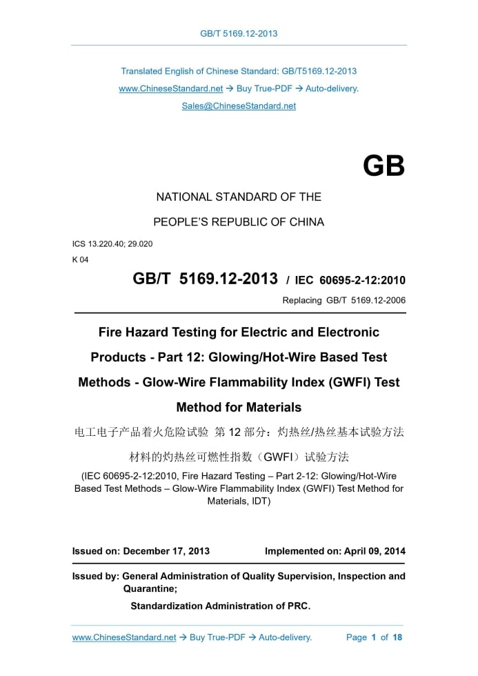 GB/T 5169.12-2013: Fire hazard testing for electric and electronic products -- Part 12: Glowing/hot-wire based test methods -- Glow-wire flammability index (GWFI) test method for materials Delivery: 9 seconds. True-PDF full-copy in English & invoice will be downloaded + auto-delivered via email. See step-by-step procedure Status: Valid GB/T 5169.12: Historical versions