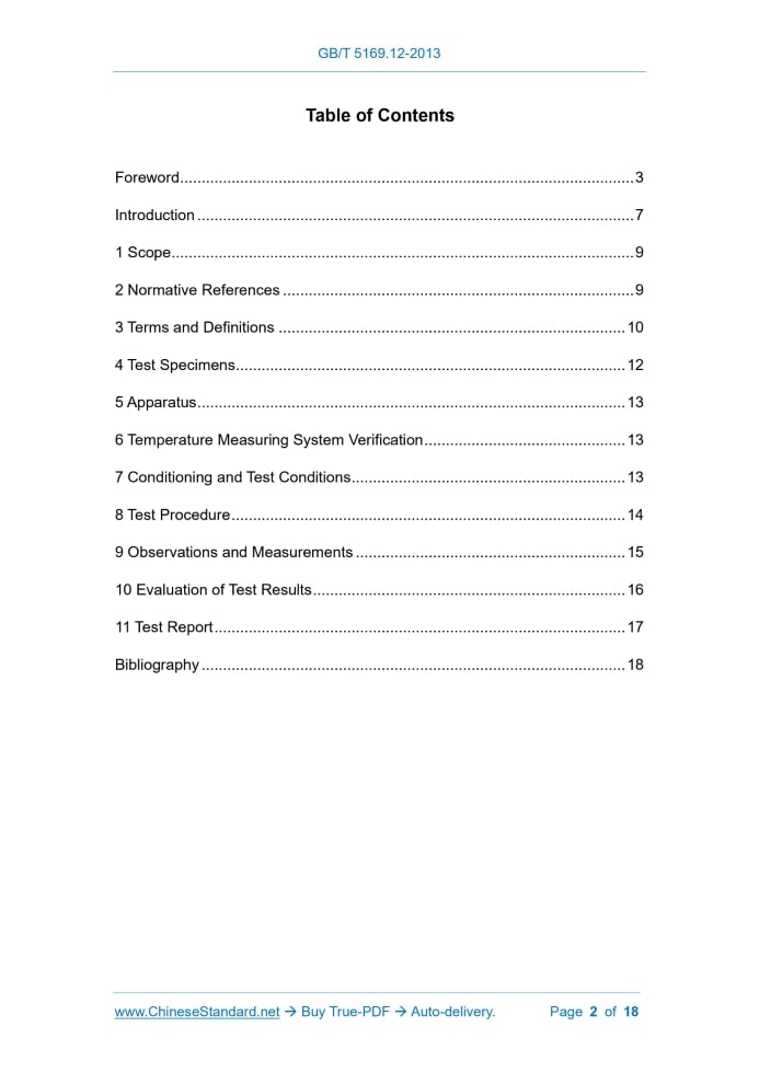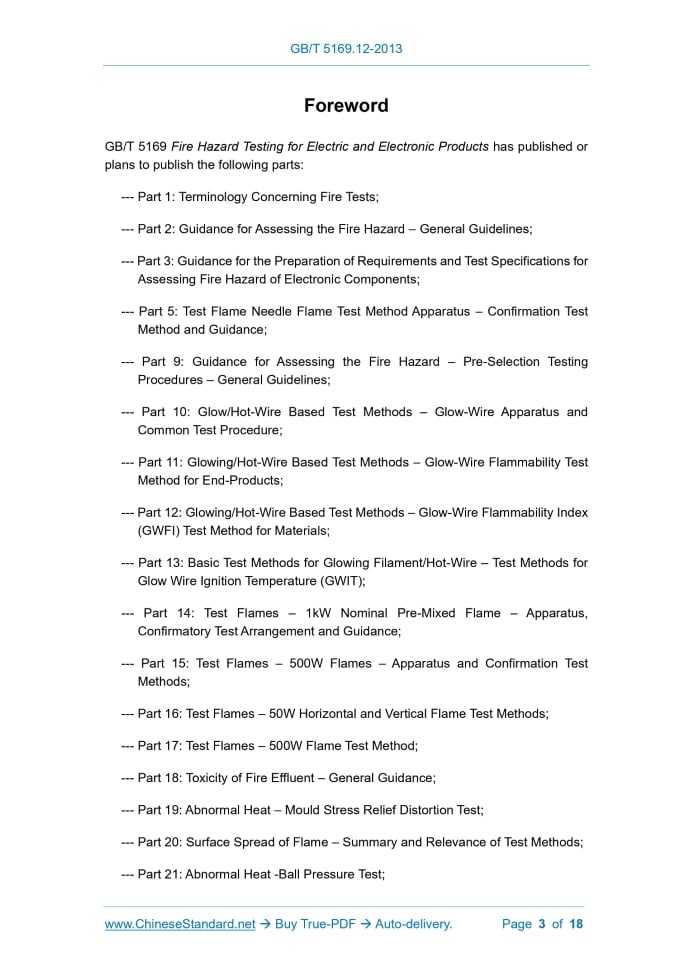 Similar standardsGB/T 5169.12-2013: Fire hazard testing for electric and electronic products -- Part 12: Glowing/hot-wire based test methods -- Glow-wire flammability index (GWFI) test method for materials---This is an excerpt. Full copy of true-PDF in English version (including equations, symbols, images, flow-chart, tables, and figures etc.), auto-downloaded/delivered in 9 seconds, can be purchased online: https://www.ChineseStandard.net/PDF.aspx/GBT5169.12-2013 GB NATIONAL STANDARD OF THE PEOPLE’S REPUBLIC OF CHINA ICS 13.220.40; 29.020 K 04 GB/T 5169.12-2013 / IEC 60695-2-12.2010 Replacing GB/T 5169.12-2006 Fire Hazard Testing for Electric and Electronic Products - Part 12.Glowing/Hot-Wire Based Test Methods - Glow-Wire Flammability Index (GWFI) Test Method for Materials (IEC 60695-2-12.2010, Fire Hazard Testing – Part 2-12.Glowing/Hot-Wire Based Test Methods – Glow-Wire Flammability Index (GWFI) Test Method for Materials, IDT) Issued on: DECEMBER 17, 2013 Implemented on: APRIL 09, 2014 Issued by. General Administration of Quality Supervision, Inspection and Quarantine; Standardization Administration of PRC. Table of ContentsForeword... 3 Introduction... 7 1 Scope... 9 2 Normative References... 9 3 Terms and Definitions... 10 4 Test Specimens... 12 5 Apparatus... 13 6 Temperature Measuring System Verification... 13 7 Conditioning and Test Conditions... 13 8 Test Procedure... 14 9 Observations and Measurements... 15 10 Evaluation of Test Results... 16 11 Test Report... 17 Bibliography... 18ForewordGB/T 5169 Fire Hazard Testing for Electric and Electronic Products has published or plans to publish the following parts. --- Part 1.Terminology Concerning Fire Tests; --- Part 2.Guidance for Assessing the Fire Hazard – General Guidelines; --- Part 3.Guidance for the Preparation of Requirements and Test Specifications for Assessing Fire Hazard of Electronic Components; --- Part 5.Test Flame Needle Flame Test Method Apparatus – Confirmation Test Method and Guidance; --- Part 9.Guidance for Assessing the Fire Hazard – Pre-Selection Testing Procedures – General Guidelines; --- Part 10.Glow/Hot-Wire Based Test Methods – Glow-Wire Apparatus and Common Test Procedure; --- Part 11.Glowing/Hot-Wire Based Test Methods – Glow-Wire Flammability Test Method for End-Products; --- Part 12.Glowing/Hot-Wire Based Test Methods – Glow-Wire Flammability Index (GWFI) Test Method for Materials; --- Part 13.Basic Test Methods for Glowing Filament/Hot-Wire – Test Methods for Glow Wire Ignition Temperature (GWIT); --- Part 14.Test Flames – 1kW Nominal Pre-Mixed Flame – Apparatus, Confirmatory Test Arrangement and Guidance; --- Part 15.Test Flames – 500W Flames – Apparatus and Confirmation Test Methods; --- Part 16.Test Flames – 50W Horizontal and Vertical Flame Test Methods; --- Part 17.Test Flames – 500W Flame Test Method; --- Part 18.Toxicity of Fire Effluent – General Guidance; --- Part 19.Abnormal Heat – Mould Stress Relief Distortion Test; --- Part 20.Surface Spread of Flame – Summary and Relevance of Test Methods; --- Part 21.Abnormal Heat -Ball Pressure Test; --- Part 22.Test Flames – 50W Flame – Apparatus and Confirmational Test Method; --- Part 23.Test Flames – 500W Vertical Flame Test Method for Tubular Polymeric Materials; --- Part 24.Guidance for Assessing the Fire Hazard – Insulating Liquids; --- Part 25.Smoke Obscuration – General Guidance; --- Part 26.Smoke Obscuration – Summary and Relevance of Test Methods; --- Part 27.Smoke Obscuration – Small-Scale Static Test – Description of the Apparatus; --- Part 28.Smoke Obscuration – Small-Scale Static Test – Materials; --- Part 29.Heat Release – General Guidance; --- Part 30.Heat Release – Summary and Relevance of Test Methods; --- Part 31.Surface Spread of Flame – General Guidance; --- Part 32.Heat Release – Heat Release of Insulating Liquid; --- Part 42.Test Flames – Confirmatory Tests – Guidance; --- Part 44.Guidance for Assessing the Fire Hazard – Fire Hazard Assessment. This Part is Part 12 of GB/T 5169. This Part was drafted as per the rules specified in GB/T 1.1-2009. This Part replaced GB/T 5169.12-2006 Fire Hazard Testing for Electric and Electronic Products - Part 12.Glowing/Hot-Wire Based Test Methods - Glow-Wire Flammability Test Method for Materials. Compared with GB/T 5169.12-2006, the major technical changes of this Standard are as follows. --- Modify the purpose of the test and the summary of how to use the test results (see Clause 1 of this Edition, Clause 1 of 2006 Edition); --- Add some terms and definitions (see Clause 3 of this Edition); --- Add the provisions for the density, melt fluidity, filler/reinforcing agent, and colour of the specimen (see 4.3 of this Edition); --- Modify the provisions on specimen conditioning and test conditions (see Clause 7 of this Edition; Clause 8 of 2006 Edition); ---Modify the scope of the test procedure; change the test severity level to the starting temperature of the test; transfer the test into the Clause of the test procedures; and add the method for determining the test temperature (see Clause 8 of this Edition; Clauses 6 and 10 of 2006 Edition); --- Modify the content of experimental observation and measurement; and transfer the initial measurement requirements into the Clause of observation and measurement (see Clause 9 of this Edition; Clauses 9 and 11 of 2006 Edition); --- Modify the evaluation method of test results (see Clause 10 of this Edition; Clause 12 of 2006 Edition); --- Modify the requirements for test report (see Clause 11 of this Edition; Clause 13 of 2006 Edition). This Part uses translation method to equivalently adopt IEC 60695-2-12.2010 Fire Hazard Testing – Part 2-12.Glowing/Hot-Wire Based Test Methods – Glow-Wire Flammability Index (GWFI) Test Method for Materials. The Chinese documents that have a consistent correspondence with the international documents cited in this Part are as follows. --- GB/