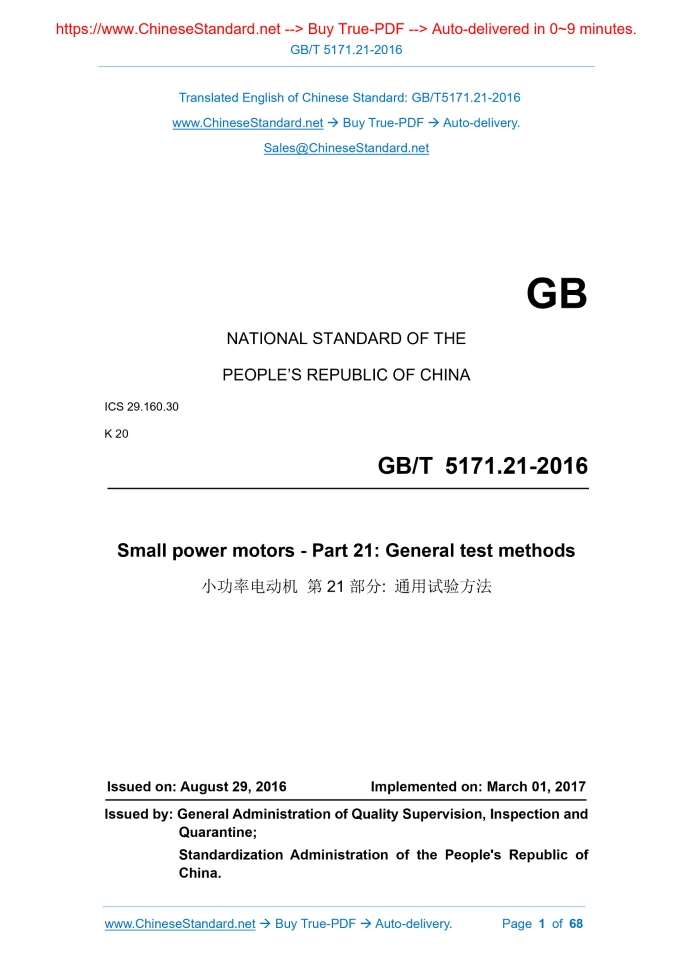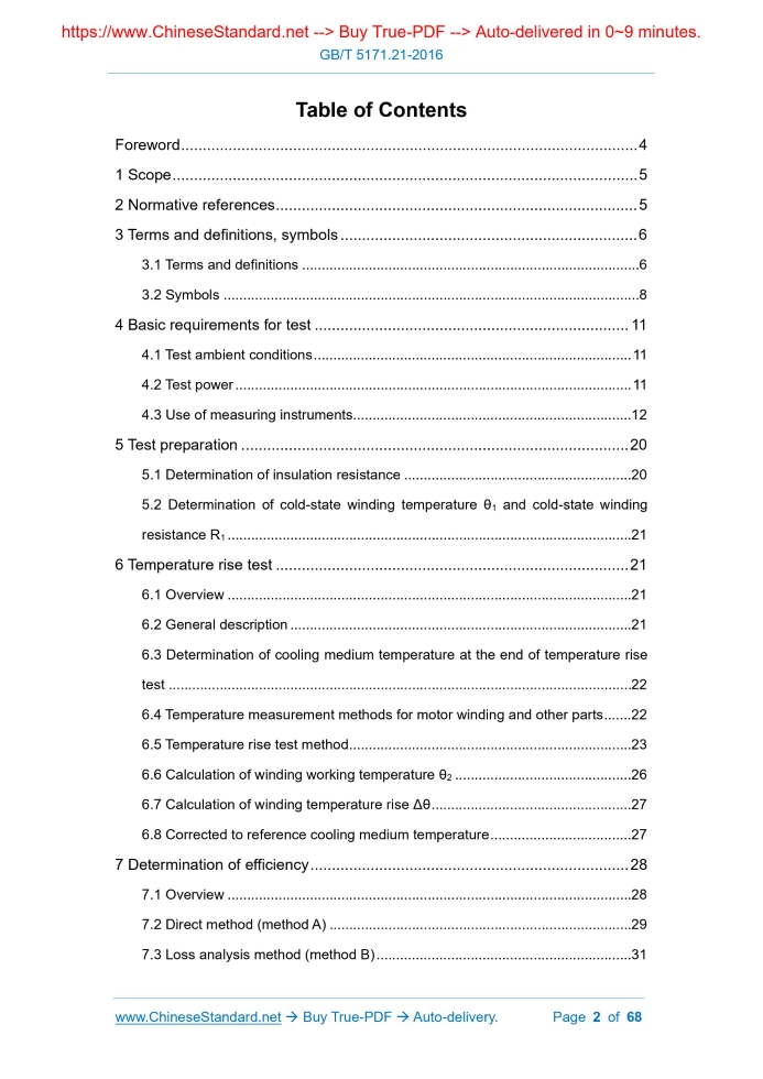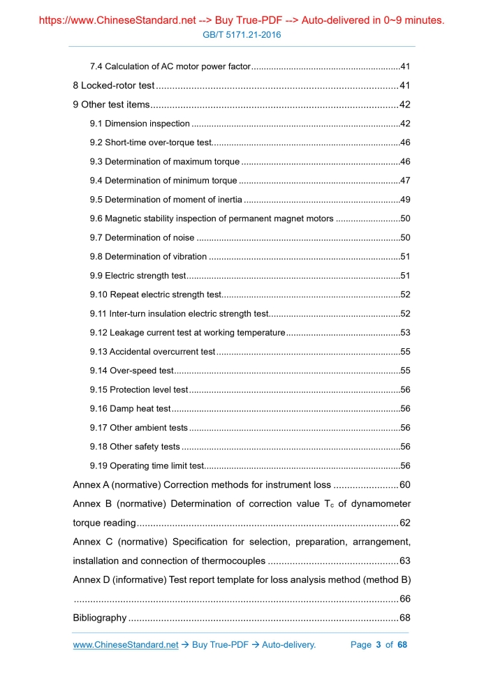 Similar standardsGB/T 5171.21-2016: Small power motors - Part 21: General test methods---This is an excerpt. Full copy of true-PDF in English version (including equations, symbols, images, flow-chart, tables, and figures etc.), auto-downloaded/delivered in 9 seconds, can be purchased online: https://www.ChineseStandard.net/PDF.aspx/GBT5171.21-2016GB NATIONAL STANDARD OF THE PEOPLE’S REPUBLIC OF CHINA ICS 29.160.30 K 20 Small power motors - Part 21.General test methods Issued on. AUGUST 29, 2016 Implemented on. MARCH 01, 2017 Issued by. General Administration of Quality Supervision, Inspection and Quarantine; Standardization Administration of the People's Republic of China. Table of ContentsForeword... 4 1 Scope... 5 2 Normative references... 5 3 Terms and definitions, symbols... 6 4 Basic requirements for test... 11 5 Test preparation... 20 6 Temperature rise test... 21 7 Determination of efficiency... 28 8 Locked-rotor test... 41 9 Other test items... 42 Annex A (normative) Correction methods for instrument loss... 60 Annex B (normative) Determination of correction value Tc of dynamometer torque reading... 62 Annex C (normative) Specification for selection, preparation, arrangement, installation and connection of thermocouples... 63 Annex D (informative) Test report template for loss analysis method (method B) ... 66 Bibliography... 681 ScopeThis Part of GB/T 5171 specifies terms and definitions, symbols involved in general test methods for small power motors, basic requirements for the test, test preparation, temperature rise test, efficiency determination, as well as locked-rotor test and other test methods. This Part is applicable to the products defined in GB/T 5171.1. The special test items and methods of various types of small power motors that are not specified in this Part need to be supplemented in the test method standards for this type of small power motors.2 Normative referencesThe following referenced documents are indispensable for the application of this document. For dated references, only the edition cited applies. For undated references, the latest edition of the referenced document (including any amendments) applies. GB 755, Rotating electrical machines - Rating and performance GB/T 1958, Geometrical Product Specifications (GPS) - Geometrical tolerance - Verification GB/T 2423 (all parts), Environmental testing - Part 2.Test methods GB/T 2828.1, Sampling procedures for inspection by attributes - Part 1. Sampling schemes indexed by acceptance quality limit (AQL) for lot-by-lot inspection GB/T 4942.1, Degrees of Protection Provided by the Integral Design of Rotating Electrical Machined (IP Code) - Classification GB/T 5171.1, Small Power Motors - Part 1.General Technical Requirements GB/T 10069.1, Measurement of airborne noise emitted by rotating electrical machines and the noise limits - Part 1.Method for the measurement of airborne noise emitted by rotating electrical machines GB/T 12113-2003, Methods of measurement of touch current and protective conductor current3 Terms and definitions, symbols3.1 Terms and definitions For the purposes of this document, the terms and definitions defined in GB/T 5171.1 and GB 12350 as well as the followings apply. 3.1.1 efficiency the ratio of output power to input power in the same unit, usually expressed as a percentage 3.1.2 dynamometer a device for measuring the torque applied to the rotating parts of the machine under test; the device can measure and display torque and speed, and is not limited to the bearing housing structure; the coaxial torque sensor can be used to directly measure the torque of the measured motor drive shaft 3.1.3 thermal equilibrium a state that the temperature rise of the heating parts of the motor does not exceed 1K within half an hour 3.1.4 temperature-rise test a test to determine the temperature rise of one or several parts of the motor, under specified operating conditions 3.1.9 operating time limit test a test to determine the normal operation period that the manufacturer guarantees to the user under the specified conditions 3.2 Symbols The following symbols apply to this document. cosφ - Power factor;4 Basic requirements for test4.1 Test ambient conditions Ambient temperature. 15°C~30°C Relative humidity. 45%~75% Atmospheric pressure. 86kPa~106kPa The ambient temperature during temperature rise and efficiency test. 20°C ± 5°C. For motors equipped with thermostats or thermal fuse, if in doubt, the ambient temperature during the temperature rise test is maintained at 23°C ± 2°C. 4.2 Test power 4.2.1 AC power The harmonic voltage factor (HVF) of the AC power supply used for the test shall not exceed 0.02.When conducting temperature rise and efficiency tests, the harmonic voltage factor (HVF) shall not exceed 0.015. 4.2.2 Three-phase AC power supply For three-phase AC power supply, in addition to meeting the requirements in 4.2.1, the negative sequence component of the three-phase voltage system shall be less than 0.5% of the positive sequence component, and the influence of zero sequence component shall be eliminated. The negative sequence component of the measuring current system can be used to replace the negative sequence component of the measuring voltage system. 4.2.3 DC power supply The DC power supply equipment used in the test shall not exceed 0.5% of the nominal source voltage and the output voltage tolerance of each output under half-rated load. For each output, within the specified load range and under the most unfavorable supply voltage, the load regulation rate is not more than 0.2%. 4.3 Use of measuring instruments 4.3.1 General The ambient conditions during the test shall be within the range recommended by the equipment manufacturer. If applicable, temperature corrections shall be made to the measured values according to the manufacturer's equipment instructions. 4.3.2 Measurement of electric quantity Unless otherwise specified, the accuracy of the electrical measuring instrume