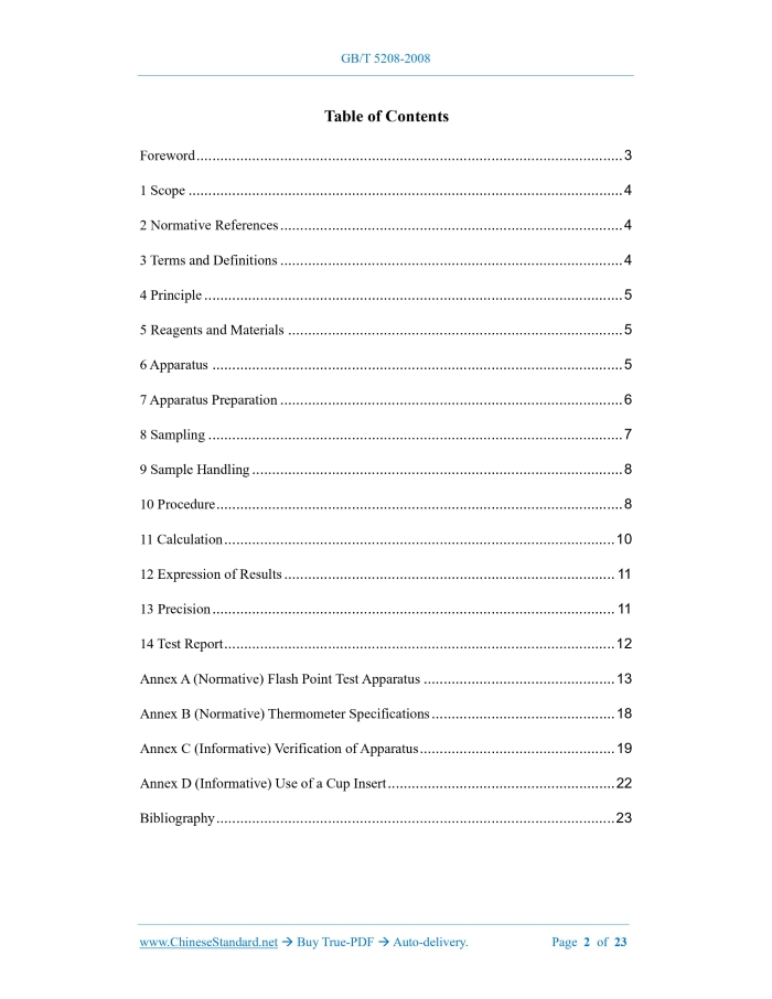 GB/T 5208-2008: Determination of flash point -- Rapid equilibrium closed cup method---This is an excerpt. Full copy of true-PDF in English version (including equations, symbols, images, flow-chart, tables, and figures etc.), auto-downloaded/delivered in 9 seconds, can be purchased online: https://www.ChineseStandard.net/PDF.aspx/GBT5208-2008GB NATIONAL STANDARD OF THE PEOPLE’S REPUBLIC OF CHINA ICS 87.040 G 50 GB/T 5208-2008 / ISO 3679:2004 Replacing GB/T 5208-1985, GB/T 7634-1987 Determination of Flash Point – Rapid Equilibrium Closed Cup Method (ISO 3679:2004, IDT) ISSUED ON: JUNE 04, 2008 IMPLEMENTED ON: DECEMBER 01, 2008 Issued by: General Administration of Quality Supervision, Inspection and Quarantine; Standardization Administration of the People’s Republic of China. Table of ContentsForeword ... 3 1 Scope ... 4 2 Normative References ... 4 3 Terms and Definitions ... 4 4 Principle ... 5 5 Reagents and Materials ... 5 6 Apparatus ... 5 7 Apparatus Preparation ... 6 8 Sampling ... 7 9 Sample Handling ... 8 10 Procedure ... 8 11 Calculation ... 10 12 Expression of Results ... 11 13 Precision ... 11 14 Test Report ... 12 Annex A (Normative) Flash Point Test Apparatus ... 13 Annex B (Normative) Thermometer Specifications ... 18 Annex C (Informative) Verification of Apparatus ... 19 Annex D (Informative) Use of a Cup Insert ... 22 Bibliography ... 23ForewordThis Standard equivalently adopts ISO 3679:2004 Determination of Flash Point – Rapid Equilibrium Closed Cup Method (English Version). This Standard replaced GB/T 5208-1985 Coatings - Flash Point Test - Rapid Equilibrium Method, and GB/T 7634-1987 Petroleum and Related Products - Determination of Lower Flashpoint - Rapid Equilibrium Method. The major technical differences between this Standard and GB/T 5208-1985 & GB/T 7634- 1987 are as follows: ---This standard combines the contents of the two standards; and its applicable products and test flash point range are wider than the original standard; --- The original two standards refer to ISO 1523:1983 and ISO 3679:1983; --- Add calibration method of the instrument; --- Add the technical requirements for the thermometer used for testing; --- Add the method of using the embedded cup; --- Add the relevant content of testing samples with a flash point greater than 100 °C; --- The expression of precision is different; --- Describe the operating procedures respectively according to the flash point no greater than 100°C and greater than 100°C; --- Give the requirements for flash point testing equipment in Annex A. This Standard’s Annexes A and B are normative, while Annexes C and D are informative. This Standard was proposed by China Petroleum and Chemical Industry Association. This Standard shall be under the jurisdiction of National Technical Committee on Paints & Pigments of Standardization Administration of China (SAC/TC 5). Drafting organization of this Standard: CNOOC Changzhou Paint & Coating industry Research Institute. Chief drafting staff of this Standard: Feng Shifang. GB/T 5208 was first-time published in 1985; GB/T 7634 was first-time published in 1987; it is thee first-time combined and revised hereby. Determination of Flash Point – Rapid Equilibrium Closed Cup Method1 ScopeThis Standard specifies a method for the determination of the closed cup flash point of paints (including water-borne paints), varnishes, paint binders, adhesives, solvents, petroleum, and related products having closed cup flash points within the range of -30°C ~ 300°C. When used in conjunction with the flash detector (A.1.6), this Standard is also suitable for the determination of the flash point of fatty acid methyl esters (FAME).2 Normative ReferencesThe provisions in following documents become the provisions of this Standard through reference in this Standard. For dated references, the subsequent amendments (excluding corrigendum) or revisions do not apply to this Standard, however, parties who reach an agreement based on this Standard are encouraged to study if the latest versions of these documents are applicable. For undated references, the latest edition of the referenced document applies. GB/T 3186 Paints Varnishes and Raw Materials for Paints and Varnishes - Sampling (GB/T 3186-2006, ISO 15528:2000, IDT) GB/T 20777 Paints and Varnishes - Examination and Preparation of Samples for Testing (GB/T 20777-2006, ISO 1513:1992, IDT) SY/T 5317 Petroleum Liquid - Automatic Pipeline Sampling (SY/T 5317-2006, ISO 3171:1988, IDT) ISO 3170 Petroleum Liquids – Manual Sampling3 Terms and DefinitionsFor the purposes of this Document, the following terms and definitions apply. 3.1 Flash point Lowest temperature of the test portion (as measured in the prescribed manner). corrected to a the instrument. 10.1.4 Do not confuse the true flash point with the bluish halo that sometimes surrounds the test flame at applications preceding that which causes the actual flash. NOTE: The optional flash detector (A.1.6) 1s not affected by the halo, and does not require the operator to closely observe the flash point test. 10.1.5 Record the ambient barometric pressure using a barometer (6.3) in the vicinity of the apparatus at the time of the test. NOTE: It is not cons1dered necessary to correct the barometric pressure reading to 0°C, although some barometers are designed to make this correct1on automatically. 10.2 Procedure for flash points up to and Including 100°C and for FAME at all temperatures 10.2.1 Charge a clean and dry syringe, adjusted to a temperature at least 10°C below the expected flash point, with a 2 ml test portion. Close the sample container immediately after withdrawal to minimize the loss of volatile components. 10.2.2 Carefully transfer the syringe to the filler orifice and discharge the test portion into the test cup by fully depressing the syringe plunger. Remove the syringe. 10.2.3 For solid or semi-solid samples, transfer a mass equivalent to approximately 2 ml directly into the test cu