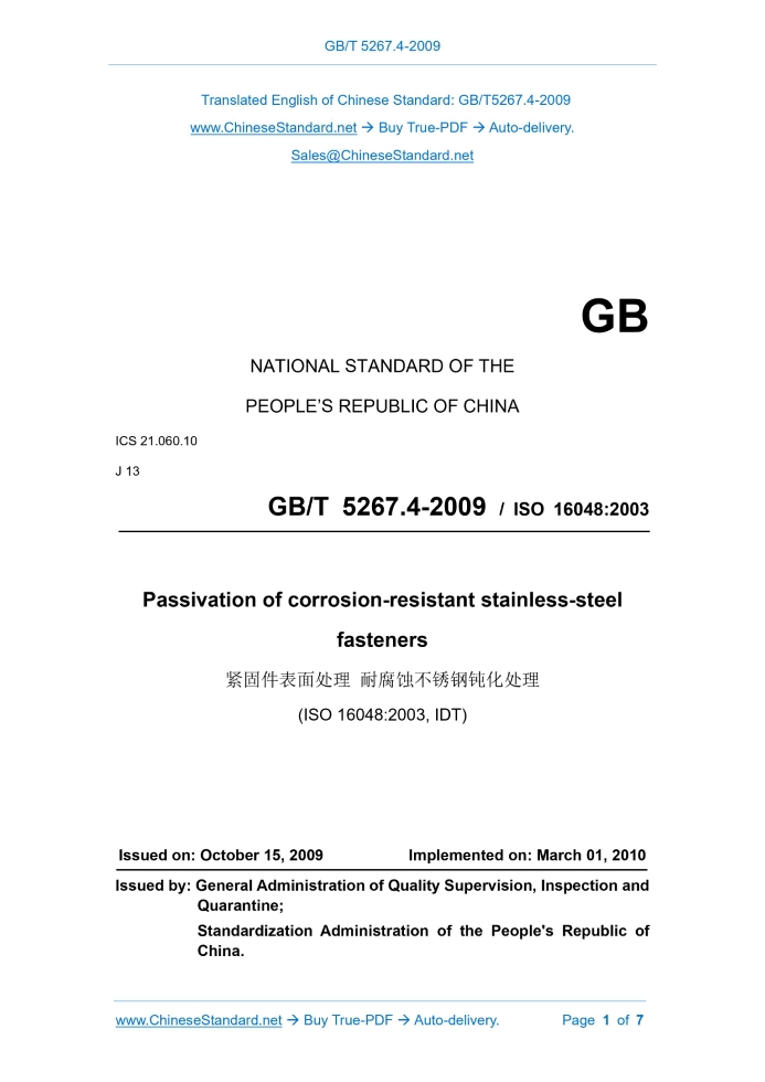 GB/T 5267.4-2009: Passivation of corrosion-resistant stainless-steel fasteners Delivery: 9 seconds. True-PDF full-copy in English & invoice will be downloaded + auto-delivered via email. See step-by-step procedure Status: Valid