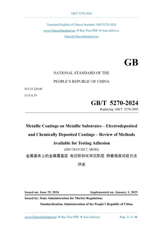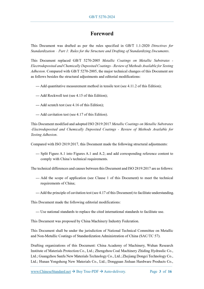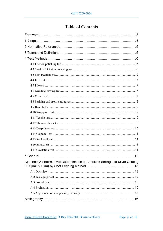 GB/T 5270-2024: Metallic coatings on metallic substrates - Electrodeposited and chemically deposited coatings - Review of methods available for testing adhesion---This is an excerpt. Full copy of true-PDF in English version (including equations, symbols, images, flow-chart, tables, and figures etc.), auto-downloaded/delivered in 9 seconds, can be purchased online: https://www.ChineseStandard.net/PDF.aspx/GBT5270-2024 GB NATIONAL STANDARD OF THE PEOPLE’S REPUBLIC OF CHINA ICS 25.220.40 CCS A 29 Replacing GB/T 5270-2005 Metallic Coatings on Metallic Substrates – Electrodeposited and Chemically Deposited Coatings – Review of Methods Available for Testing Adhesion (ISO 2819:2017, MOD) ISSUED ON: JUNE 29, 2024 IMPLEMENTED ON: JANUARY 1, 2025 Issued by: State Administration for Market Regulation; Standardization Administration of the People’s Republic of China. Table of ContentsForeword ... 3 1 Scope ... 5 2 Normative References ... 5 3 Terms and Definitions ... 5 4 Test Methods ... 6 4.1 Friction polishing test ... 6 4.2 Steel ball friction polishing test ... 6 4.3 Shot peening test ... 6 4.4 Peel test ... 7 4.5 File test ... 7 4.6 Grinding-sawing test ... 7 4.7 Chisel test ... 7 4.8 Scribing and cross-cutting test ... 8 4.9 Bend test ... 8 4.10 Wrapping Test ... 9 4.11 Tensile test ... 9 4.12 Thermal shock test ... 9 4.13 Deep-draw test ... 10 4.14 Cathode Test ... 11 4.15 Rockwell test ... 11 4.16 Scratch test ... 11 4.17 Cavitation test ... 11 5 General ... 12 Appendix A (Informative) Determination of Adhesion Strength of Silver Coating (100μm~600μm) by Shot Peening Method ... 13 A.1 Overview ... 13 A.2 Test equipment ... 13 A.3 Procedures ... 13 A.4 Evaluation ... 15 A.5 Adjustment of shot peening intensity ... 15 Bibliography ... 16ForewordThis Document was drafted as per the rules specified in GB/T 1.1-2020 Directives for Standardization – Part 1: Rules for the Structure and Drafting of Standardizing Documents. This Document replaced GB/T 5270-2005 Metallic Coatings on Metallic Substrates - Electrodeposited and Chemically Deposited Coatings - Review of Methods Available for Testing Adhesion. Compared with GB/T 5270-2005, the major technical changes of this Document are as follows besides the structural adjustments and editorial modifications: --- Add quantitative measurement method in tensile test (see 4.11.2 of this Edition); --- Add Rockwell test (see 4.15 of this Edition); --- Add scratch test (see 4.16 of this Edition); --- Add cavitation test (see 4.17 of this Edition). This Document modified and adopted ISO 2819:2017 Metallic Coatings on Metallic Substrates -Electrodeposited and Chemically Deposited Coatings - Review of Methods Available for Testing Adhesion. Compared with ISO 2819:2017, this Document made the following structural adjustments: --- Split Figure A.1 into Figures A.1 and A.2; and add corresponding reference content to comply with China’s technical requirements. The technical differences and causes between this Document and ISO 2819:2017 are as follows: --- Add the scope of application (see Clause 1 of this Document) to meet the technical requirements of China; --- Add the principle of cavitation test (see 4.17 of this Document) to facilitate understanding. This Document made the following editorial modifications: --- Use national standards to replace the cited international standards to facilitate use. This Document was proposed by China Machinery Industry Federation. This Document shall be under the jurisdiction of National Technical Committee on Metallic and Non-Metallic Coatings of Standardization Administration of China (SAC/TC 57). Drafting organizations of this Document: China Academy of Machinery, Wuhan Research Institute of Materials Protection Co., Ltd.; Zhengzhou Coal Machinery Zhiding Hydraulic Co., Ltd.; Guangzhou Sanfu New Materials Technology Co., Ltd.; Zhejiang Dongci Technology Co., Ltd.; Hunan Yongsheng New Materials Co., Ltd.; Dongguan Jinluan Hardware Products Co., Metallic Coatings on Metallic Substrates – Electrodeposited and Chemically Deposited Coatings – Review of Methods Available for Testing Adhesion Warning: When special methods for adhesion strength tests are specified in national standards for specific coatings, the methods described in this Document should be used first, and the prior agreement of both the supplier and the purchaser should be obtained.1 ScopeThis Document reviews the test methods for checking the adhesion strength of electrodeposited and chemically deposited coatings, which are limited to qualitative tests. This Document applies to the selection of test methods for adhesion strength of electrodeposited and chemically deposited coatings on metallic substrates. This Document does not describe some quantitative test methods for the adhesion strength of metallic coatings and substrates developed at different times. Because such tests require special equipment and considerable skills in operation, they are not suitable as quality control tests for product parts, but some quantitative test methods can play a role in research and development work.2 Normative ReferencesThere are no normative references for this Document.3 Terms and DefinitionsFor the purposes of this Document, there are no terms and definitions apply. The websites of the terminology databases used in standardization work maintained by ISO and IEC are as follows: --- ISO Online Browsing Platform: http://www.iso.org/obp; --- IEC Electronic Encyclopedia: http://www.electropedia.org/. the structure of the deposit coating. These methods are particularly suitable for deposit coatings of harder metals, such as nickel or chromium. In any case, the obtained results shall be carefully analyzed because the ductility of the deposit coating and the base metal is involved. 4.14 Cathode Test The coating specimen is placed in the solution as a cathode, and hydrogen is precipitated on the cathode. As hydrogen diffuses, pressure accumulates at any discontinuity 