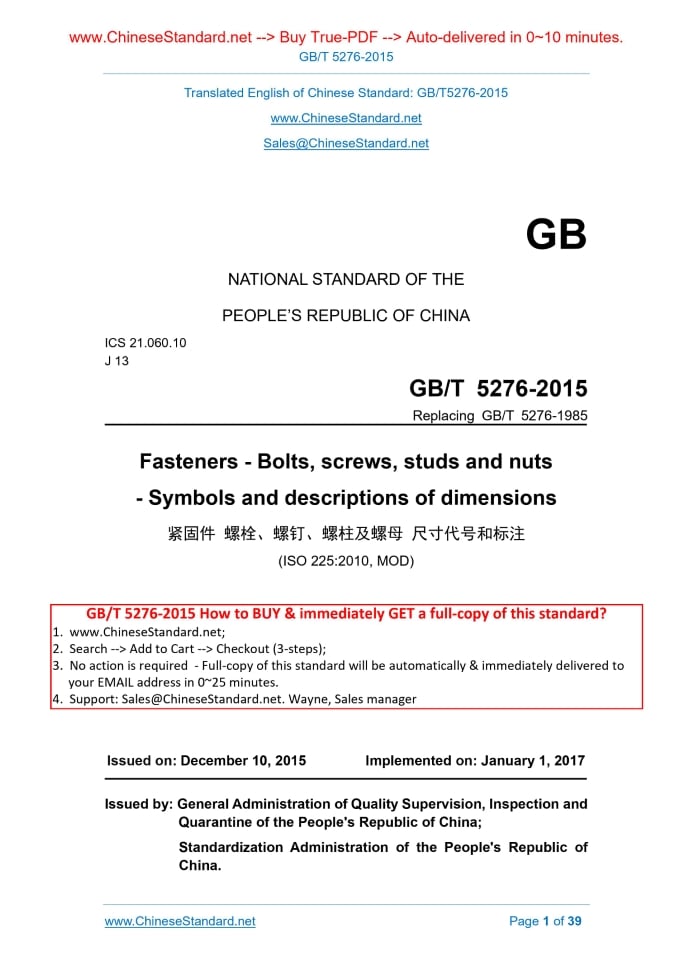 GB/T 5276-2015: Fasteners -- Bolts, screws, studs and nuts -- Symbols and descriptions of dimensions Delivery: 9 seconds. True-PDF full-copy in English & invoice will be downloaded + auto-delivered via email. See step-by-step procedure Status: Valid GB/T 5276: Historical versions