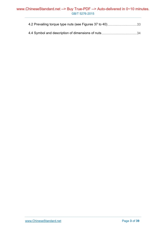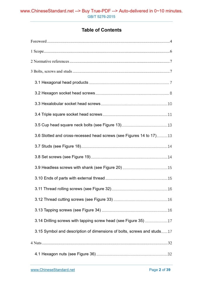 Similar standardsGB/T 5276-2015: Fasteners -- Bolts, screws, studs and nuts -- Symbols and descriptions of dimensions---This is an excerpt. Full copy of true-PDF in English version (including equations, symbols, images, flow-chart, tables, and figures etc.), auto-downloaded/delivered in 9 seconds, can be purchased online: https://www.ChineseStandard.net/PDF.aspx/GBT5276-2015 GB NATIONAL STANDARD OF THE PEOPLE’S REPUBLIC OF CHINA ICS 21.060.10 J 13 Replacing GB/T 5276-1985 Fasteners - Bolts, screws, studs and nuts - Symbols and descriptions of dimensions (ISO 225.2010, MOD) Issued on: DECEMBER 10, 2015 Implemented on: JANUARY 1, 2017 Issued by. General Administration of Quality Supervision, Inspection and Quarantine of the People's Republic of China; Standardization Administration of the People's Republic of China. Table of ContentsForeword ... 4 1 Scope ... 6 2 Normative references ... 7 3 Bolts, screws and studs ... 7 3.1 Hexagonal head products ... 7 3.2 Hexagon socket head screws ... 8 3.3 Hexalobular socket head screws ... 10 3.4 Triple square socket head screws ... 11 3.5 Cup head square neck bolts (see Figure 13) ... 13 3.6 Slotted and cross-recessed head screws (see Figures 14 to 17) ... 13 3.7 Studs (see Figure 18) ... 14 3.8 Set screws (see Figure 19) ... 14 3.9 Headless screws with shank (see Figure 20) ... 15 3.10 Ends of parts with external thread ... 15 3.11 Thread rolling screws (see Figure 32) ... 16 3.12 Thread cutting screws (see Figure 33) ... 16 3.13 Tapping screws (see Figure 34) ... 16 3.14 Drilling screws with tapping screw head (see Figure 35) ... 17 3.15 Symbol and description of dimensions of bolts, screws and studs ... 17 4 Nuts ... 32 4.1 Hexagon nuts (see Figure 36) ... 32 4.2 Prevailing torque type nuts (see Figures 37 to 40) ... 33 4.4 Symbol and description of dimensions of nuts ... 34ForewordThis Standard is drafted in accordance with the rules given in GB/T1.1-2009. This Standard replaces GB/T 5276-1985 “Fasteners - Bolts, screws, studs and nuts - Symbols and descriptions of dimensions”. Compared with GB/T 5276-1985, main changes of this standard are as follows. - In addition to terms used in the three official ISO languages (English, French and Russian), this Standard gives the equivalent terms in Chinese, German, Italian, Japanese, Spanish and Swedish; - ADD NOTE 2 in Clause 1; - SPECIFY the symbol (see Clause 3); - ADD parts of terms; - ADD terms in Italian, Japanese, Spanish and Swedish; - MODIFY parts of terms; - MODIFY symbols of Chinese, English, French, Russian and German. This Standard uses the re-drafting method to modify ISO 225.2010 “Fasteners - Bolts, screws, studs and nuts - Symbols and descriptions of dimensions” (English version). Compared with ISO 225. 2010, main changes of this standard are as follows. - In the reference, use China’s national standards to replace International standards (see Clause 2); - ADD the numbers of Table 1 and Table 2 (see Table 1 in 3.15, Table 2 in 4.4); - Terms in Chinese (Zh) is placed at the first line. This Standard is proposed by China Machinery Industry Federation. This Standard is under the jurisdiction of National Technical Committee on Fasteners of Standardization Administration of China (SAC/TC 85). Responsible drafting organization of this Standard. China Machine Productivity Promotion Center. Participating drafting organization of this Standard. Jinan Shida Fastener Co., Ltd. Fasteners - Bolts, screws, studs and nuts – Symbols and descriptions of dimensions1 ScopeThis Standard specifies the symbol, description and designation method for the dimensions of bolts, screws, studs and nuts. NOTE 1. The figures of the fasteners in this Standard are given only as examples. NOTE 2. In addition to terms used in the three official ISO languages (English, French and Russian), this Standard gives the equivalent terms in Chinese, German, Italian, Japanese, Spanish and Swedish; these are published under the responsibility of the member bodies for China (SAC), Germany (DIN), Italy (UNI), Japan (JISC), Spain (AENOR) and Sweden (SIS), and are given for information only. Only the terms given in the official language can be considered as ISO terms. Successive order of languages. zh. Chinese en. English fr. French ru. Russian de. German it. Italian ja. Japanese es. Spanish sv. Swedish NOTE 3. For the convenience of use, “Chinese terms” will be placed at the first place in this Standard. This Standard applies to the designation of drawings of bolts, screws, studs and nuts. ......Source: Above contents are excerpted from the full-copy PDF -- translated/reviewed by: www.ChineseStandard.net / Wayne Zheng et al. Tips & Frequently Asked Questions:Question 1: How long will the true-PDF of English version of GB/T 5276-2015 be delivered?Answer: The full copy PDF of English version of GB/T 5276-2015 can be downloaded in 9 seconds, and it will also be emailed to you in 9 seconds (double mechanisms to ensure the delivery reliably), with PDF-invoice.Question 2: Can I share the purchased PDF of GB/T 5276-2015_English with my colleagues?Answer: Yes. The purchased PDF of GB/T 5276-2015_English will be deemed to be sold to your employer/organization who actually paid for it, including your colleagues and your employer's intranet.Question 3: Does the price include tax/VAT?Answer: Yes. Our tax invoice, downloaded/delivered in 9 seconds, includes all tax/VAT and complies with 100+ countries' tax regulations (tax exempted in 100+ countries) -- See Avoidance of Double Taxation Agreements (DTAs): List of DTAs signed between Singapore and 100+ countriesQuestion 4: Do you accept my currency other than USD?Answer: Yes. www.ChineseStandard.us -- GB/T 5276-2015 -- Click this link and select your country/currency to pay, the exact amount in your currency will be printed on the invoice. Full PDF will also be downloaded/emailed in 9 seconds.Question 5: Should I purchase the latest version GB/T 5276-2015?Answer: Yes. Unless special s