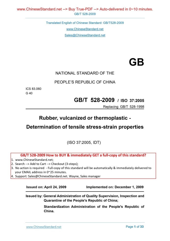 GB/T 528-2009: Rubber, vulcanized or thermoplastic -- Determination of tensile stress-strain properties Delivery: 9 seconds. True-PDF full-copy in English & invoice will be downloaded + auto-delivered via email. See step-by-step procedure Status: Valid GB/T 528: Historical versions