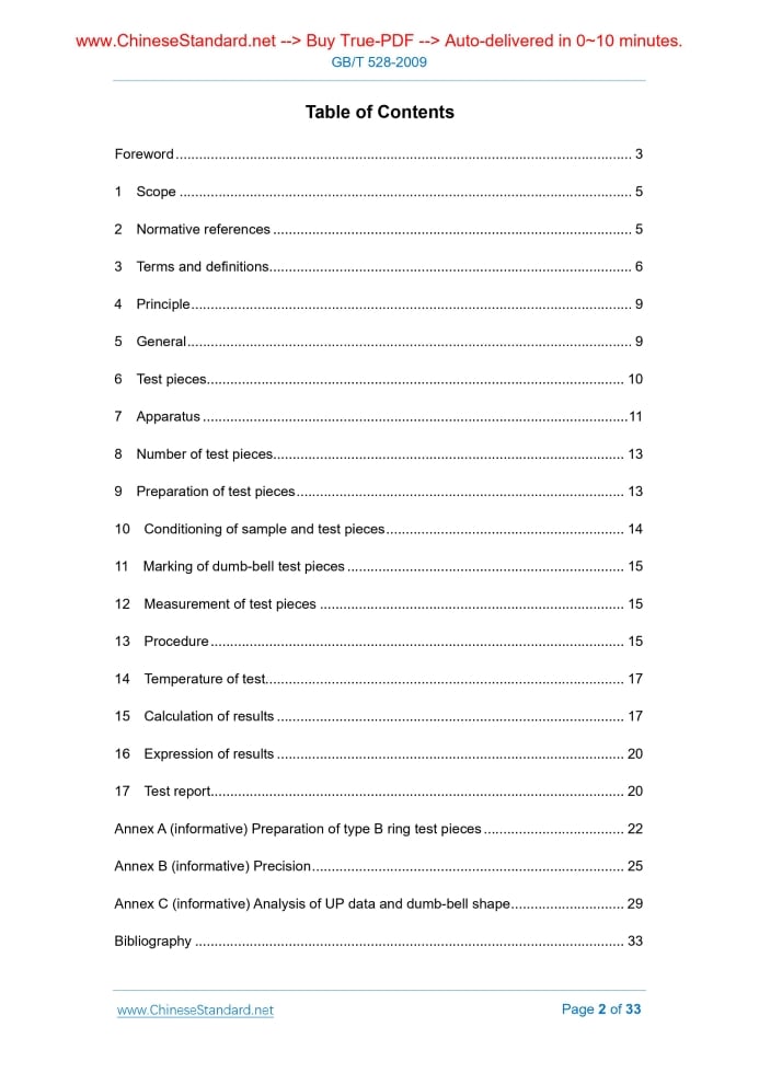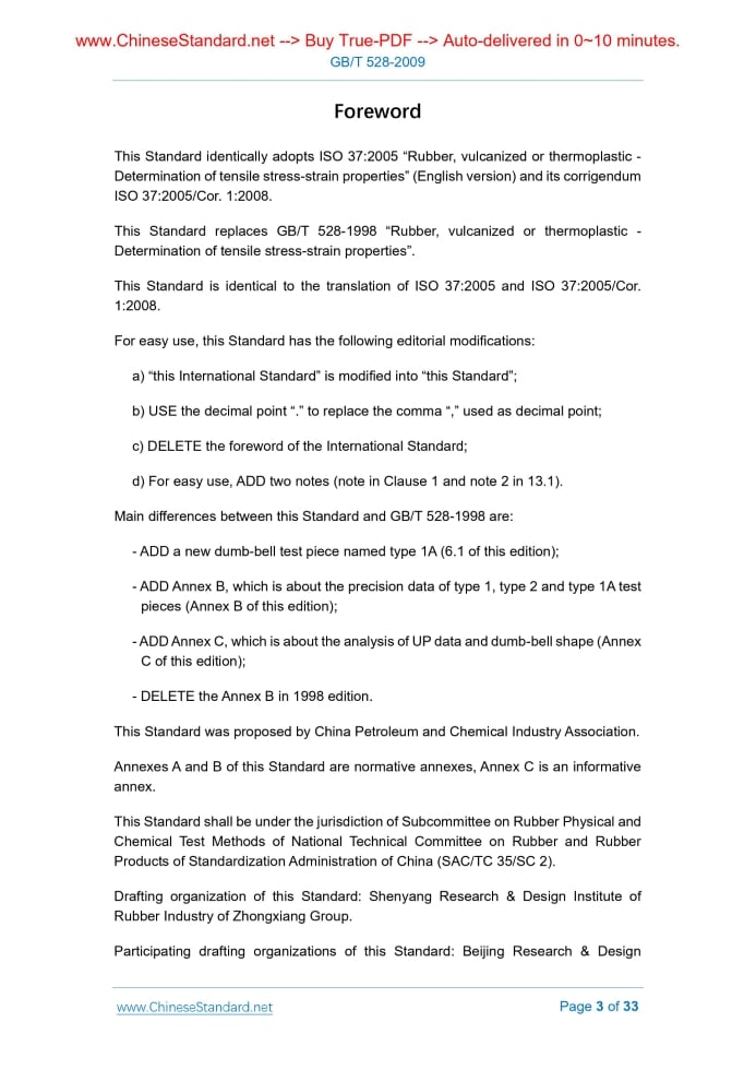 Similar standardsGB/T 528-2009: Rubber, vulcanized or thermoplastic -- Determination of tensile stress-strain properties---This is an excerpt. Full copy of true-PDF in English version (including equations, symbols, images, flow-chart, tables, and figures etc.), auto-downloaded/delivered in 9 seconds, can be purchased online: https://www.ChineseStandard.net/PDF.aspx/GBT528-2009 GB NATIONAL STANDARD OF THE PEOPLE’S REPUBLIC OF CHINA ICS 83.060 G 40 GB/T 528-2009 / ISO 37.2005 Replacing GB/T 528-1998 Rubber, vulcanized or thermoplastic - Determination of tensile stress-strain properties (ISO 37.2005, IDT) Issued on. APRIL 24, 2009 Implemented on. DECEMBER 1, 2009 Issued by. General Administration of Quality Supervision, Inspection and Quarantine of the People's Republic of China; Standardization Administration of the People's Republic of China. Table of ContentsForeword... 3 1 Scope... 5 2 Normative references... 5 3 Terms and definitions... 6 4 Principle... 9 5 General... 9 6 Test pieces... 10 7 Apparatus... 11 8 Number of test pieces... 13 9 Preparation of test pieces... 13 10 Conditioning of sample and test pieces... 14 11 Marking of dumb-bell test pieces... 15 12 Measurement of test pieces... 15 13 Procedure... 15 14 Temperature of test... 17 15 Calculation of results... 17 16 Expression of results... 20 17 Test report... 20 Annex A (informative) Preparation of type B ring test pieces... 22 Annex B (informative) Precision... 25 Annex C (informative) Analysis of UP data and dumb-bell shape... 29 Bibliography... 33ForewordThis Standard identically adopts ISO 37.2005 “Rubber, vulcanized or thermoplastic - Determination of tensile stress-strain properties” (English version) and its corrigendum ISO 37.2005/Cor. 1.2008. This Standard replaces GB/T 528-1998 “Rubber, vulcanized or thermoplastic - Determination of tensile stress-strain properties”. This Standard is identical to the translation of ISO 37.2005 and ISO 37.2005/Cor. 1.2008. For easy use, this Standard has the following editorial modifications. a) “this International Standard” is modified into “this Standard”; b) USE the decimal point “.” to replace the comma “,” used as decimal point; c) DELETE the foreword of the International Standard; d) For easy use, ADD two notes (note in Clause 1 and note 2 in 13.1). Main differences between this Standard and GB/T 528-1998 are. - ADD a new dumb-bell test piece named type 1A (6.1 of this edition); - ADD Annex B, which is about the precision data of type 1, type 2 and type 1A test pieces (Annex B of this edition); - ADD Annex C, which is about the analysis of UP data and dumb-bell shape (Annex C of this edition); - DELETE the Annex B in 1998 edition. This Standard was proposed by China Petroleum and Chemical Industry Association. Annexes A and B of this Standard are normative annexes, Annex C is an informative annex. This Standard shall be under the jurisdiction of Subcommittee on Rubber Physical and Chemical Test Methods of National Technical Committee on Rubber and Rubber Products of Standardization Administration of China (SAC/TC 35/SC 2). Drafting organization of this Standard. Shenyang Research & Design Institute of Rubber Industry of Zhongxiang Group. Participating drafting organizations of this Standard. Beijing Research & Design Institute of Rubber Industry, Chengde Precision Testing Machine Co., Ltd. Main drafters of this Standard. Fei Kanghong and Ji Lianzhong. Participating drafters of this Standard. Xie Junfang, Ding Xiaoying, Zhao Lingyun and Wang Xinhua. The previous edition of the standards replaced by this Standard are as follows. - GB/T 528-1992, GB/T 528-1998. Rubber, vulcanized or thermoplastic - Determination of tensile stress-strain properties Warning. Personnel using this Standard shall have practical experience in formal laboratory work. This Standard does not purport to address safety issues that may arise from the use of this Standard. It is the responsibility of the user to take appropriate safety and health measures and to ensure compliance with the relevant national regulations.1 ScopeThis Standard describes a method for the determination of the tensile stress-strain properties of vulcanized and thermoplastic rubbers.2 Normative referencesThe provisions in following documents become the provisions of this Standard through reference in this Standard. For dated references, the subsequent amendments (excluding corrigendum) or revisions do not apply to this Standard, however, parties who reach an agreement based on this Standard are encouraged to study if the latest versions of these documents are applicable. For undated references, the latest edition of the referenced document applies.3 Terms and definitionsFor the purposes of this Standard, the following terms and definitions apply. Tensile strain, expressed as a percentage of the test length, produced in the test piece by a tensile stress.4 PrincipleStandard test pieces, either dumb-bells or rings, are stretched in a tensile-testing machine at a constant rate of traverse of the driven grip or pulley. Readings of force and elongation are taken as required during the uninterrupted stretching of the test piece and when it breaks.5 GeneralDumb-bell and ring test pieces do not necessarily give the same values for their respective stress-strain properties. This is mainly because in stretched rings the stress is not uniform over the cross-section.6 Test piecesThe standard type B ring test piece shall have an internal diameter of 8.0 mm ± 0.1 mm. The median axial thickness and median radial width shall be 1.0 mm ± 0.1 mm. The radial width within any ring shall nowhere deviate from the median by more than 0.1 mm.7 ApparatusThe instrument for measuring the thickness of dumb-bell test pieces and the axial thickness of ring test pieces shall be in accordance with that used in method A of GB/T 2941. A calibrated cone gauge or other suitable equipment shall be used to measure the internal diameter of ring