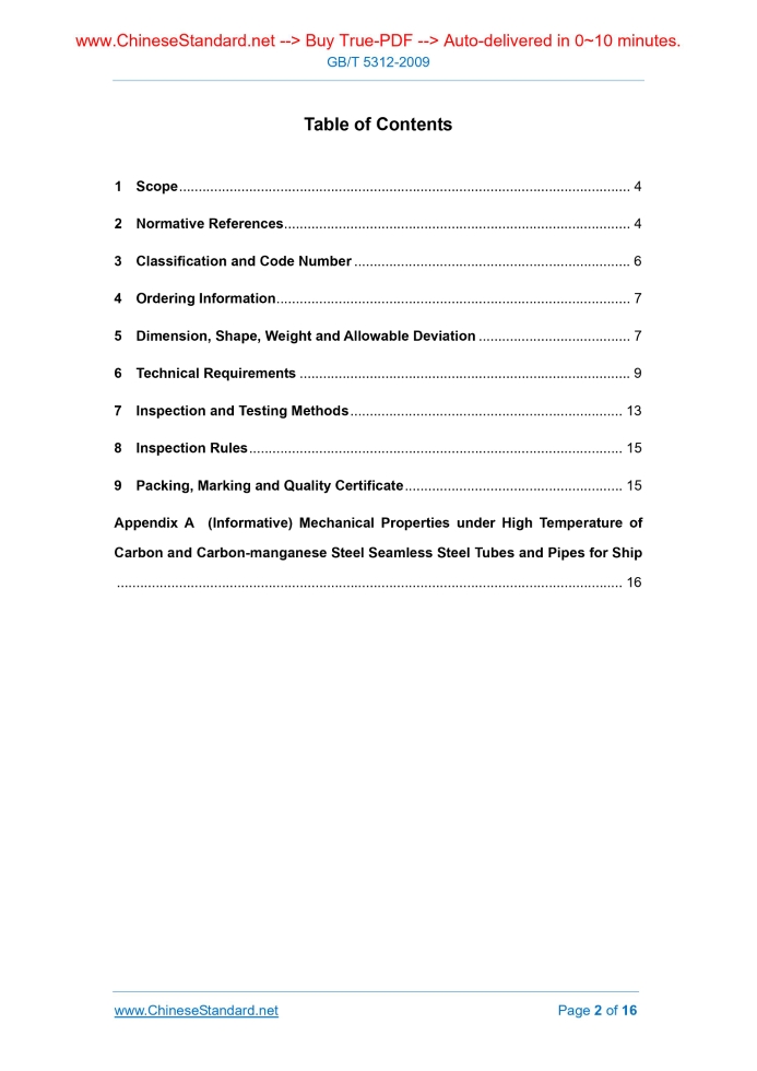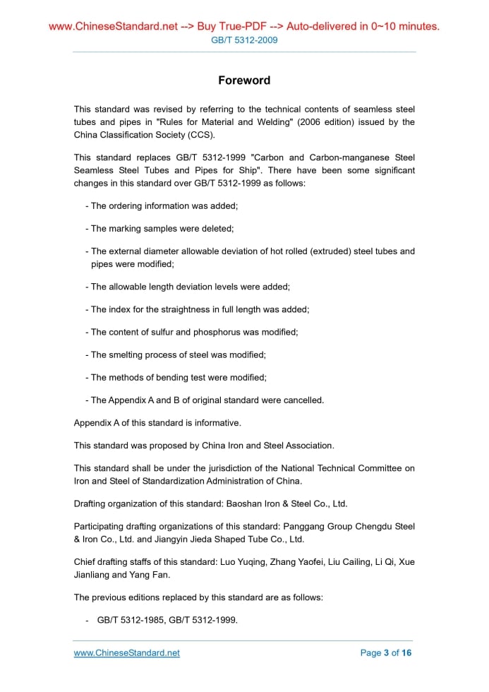 GB/T 5312-2009: Carbon and carbon-manganese steel seamless steel tubes and pipes for ship---This is an excerpt. Full copy of true-PDF in English version (including equations, symbols, images, flow-chart, tables, and figures etc.), auto-downloaded/delivered in 9 seconds, can be purchased online: https://www.ChineseStandard.net/PDF.aspx/GBT5312-2009GB NATIONAL STANDARD OF THE PEOPLE’S REPUBLIC OF CHINA ICS 77.140.75 H 48 Replacing GB/T 5312-1999 Carbon and Carbon-manganese Steel Seamless Steel Tubes and Pipes for Ship Issued on. OCTOBER 30, 2009 Implemented on. MAY 1, 2010 Issued by. General Administration of Quality Supervision, Inspection and Quarantine of the People's Republic of China; Standardization Administration of the People's Republic of China. Table of Contents1 Scope... 4 2 Normative References... 4 3 Classification and Code Number... 6 4 Ordering Information... 7 5 Dimension, Shape, Weight and Allowable Deviation... 7 6 Technical Requirements... 9 7 Inspection and Testing Methods... 13 8 Inspection Rules... 15 9 Packing, Marking and Quality Certificate... 15 Appendix A (Informative) Mechanical Properties under High Temperature of Carbon and Carbon-manganese Steel Seamless Steel Tubes and Pipes for Ship ... 16ForewordThis standard was revised by referring to the technical contents of seamless steel tubes and pipes in "Rules for Material and Welding" (2006 edition) issued by the China Classification Society (CCS). This standard replaces GB/T 5312-1999 "Carbon and Carbon-manganese Steel Seamless Steel Tubes and Pipes for Ship". There have been some significant changes in this standard over GB/T 5312-1999 as follows. - The ordering information was added; - The marking samples were deleted; - The external diameter allowable deviation of hot rolled (extruded) steel tubes and pipes were modified; - The allowable length deviation levels were added; - The index for the straightness in full length was added; - The content of sulfur and phosphorus was modified; - The smelting process of steel was modified; - The methods of bending test were modified; - The Appendix A and B of original standard were cancelled. Appendix A of this standard is informative. This standard was proposed by China Iron and Steel Association. This standard shall be under the jurisdiction of the National Technical Committee on Iron and Steel of Standardization Administration of China. Drafting organization of this standard. Baoshan Iron & Steel Co., Ltd. Participating drafting organizations of this standard. Panggang Group Chengdu Steel & Iron Co., Ltd. and Jiangyin Jieda Shaped Tube Co., Ltd. Chief drafting staffs of this standard. Luo Yuqing, Zhang Yaofei, Liu Cailing, Li Qi, Xue Jianliang and Yang Fan. The previous editions replaced by this standard are as follows. - GB/T 5312-1985, GB/T 5312-1999. Carbon and Carbon-manganese Steel Seamless Steel Tubes and Pipes for Ship1 ScopeThis standard specifies the classification, code number, dimension, shape, weight, technical requirements, testing method, inspection rules, packing, marking and quality certificate of carbon and carbon-manganese steel seamless steel tubes and pipes for ship (hereinafter referred to as steel tubes and pipes). This standard is applicable to the carbon and carbon-manganese steel seamless steel tubes and pipes used for Grade I and I pressure piping system, boilers and super-heaters for manufacturing ships.2 Normative ReferencesThe following standards contain the provisions which, through reference in this text, constitute the provisions of this standard. For dated reference, the subsequent modification or revisions of these publications do not apply. However, all parties who reach an agreement according to this standard are encouraged to study whether the latest edition of these documents is applicable. For undated references, the latest edition of the normative document is applicable to this standard. GB/T 222 Permissible Tolerances for Chemical Composition of Steel Products GB/T 223.5 Steel and Iron - Determination of Acid-soluble Silicon and Total Silicon Content - Reduced Molybdosilicate Spectrophotometric Method (GB/T 223.5-2008, ISO 4829-1.1986, ISO 4829-2.1988, MOD) GB/T 223.12 Methods for Chemical Analysis of Iron - Steel and Alloy The Sodium Carbonate Separation- Diphenyl Carbazide Photometric Method for the Determination of Chromium Content GB/T 223.26 Iron Steel and Alloy-Determination of Molybdenum Content-The Thiocyanate Spectrophotometric Method GB/T 223.53 Methods for Chemical Analysis of Iron - Steel and Alloy -The Flame Atomic Absorption Spectrophotometric Method for the Determination of Nickel Content GB/T 223.54 Methods for Chemical Analysis of Iron - Steel and Alloy--The Flame Atomic Absorption Spectrophotometric Method for the Determination of Nickel Content (GB/T 223.54-1987, eqv ISO/DIS 4940.1986) GB/T 223.59 Iron Steel and Alloy - Determination of Phosphorus Content - Bismuth Phosphomolybdate Blue Spectrophotometric Method and Antimony Phosphomolybdate Blue Spectrophotometric Method GB/T 223.63 Methods for Chemical Analysis of Iron - Steel and Alloy; The Sodium (Potassium) Periodate Photometric Method for the Determination of Manganese Content GB/T 223.68 Methods for Chemical Analysis of Iron - Steel and Alloy The Potassium Iodate Titration Method after Combustion in the Pipe Furnace for the Determination of Sulfur Content3 Classification and Code Number3.1 Steel tubes and pipes are classified into two categories according to the manufacturing methods. The categories and code numbers are as follows. 3.2 Steel tubes and pipes are classified into seamless steel tubes and pipes used for pressure piping system AND seamless steel tubes and pipes used for boilers and super-heaters, according to the functions. 3.2.1 Seamless steel tubes and pipes used for pressure piping system are classified into three grads according to the design pressure and temperature as shown in Table1. 3.2.3 Expression methods are as follows.4 Orderi