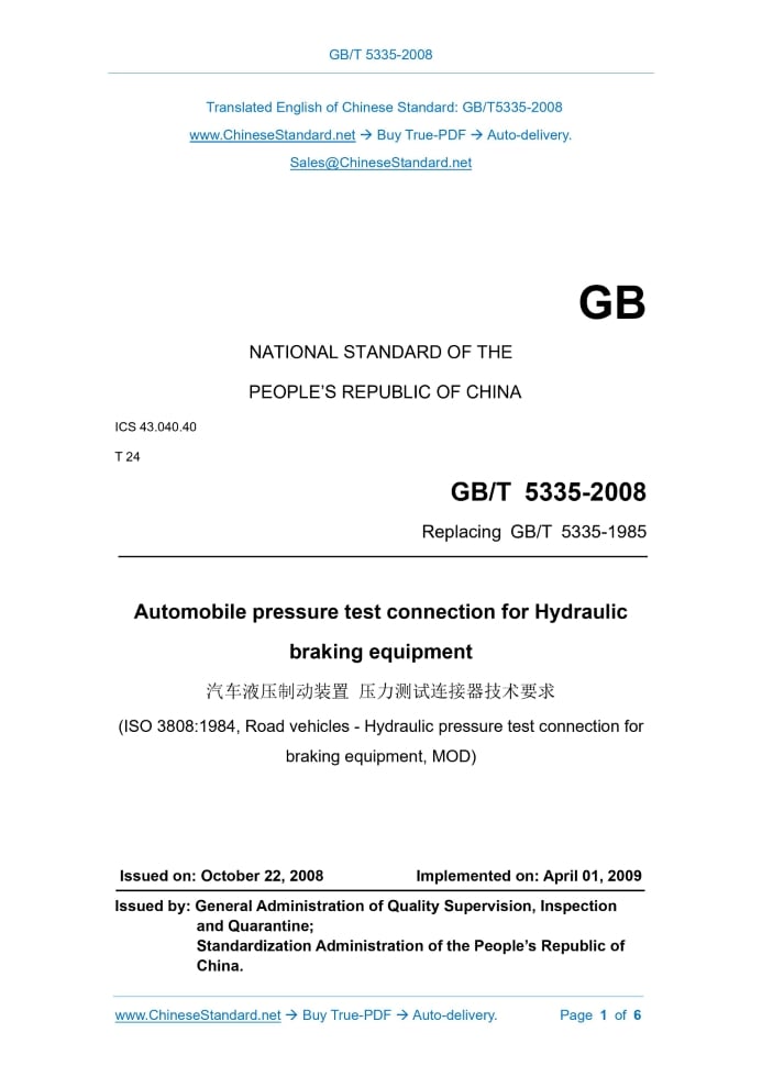 GB/T 5335-2008: Automobile pressure test connection for hydraulic braking equipment Delivery: 9 seconds. True-PDF full-copy in English & invoice will be downloaded + auto-delivered via email. See step-by-step procedure Status: Valid GB/T 5335: Historical versions