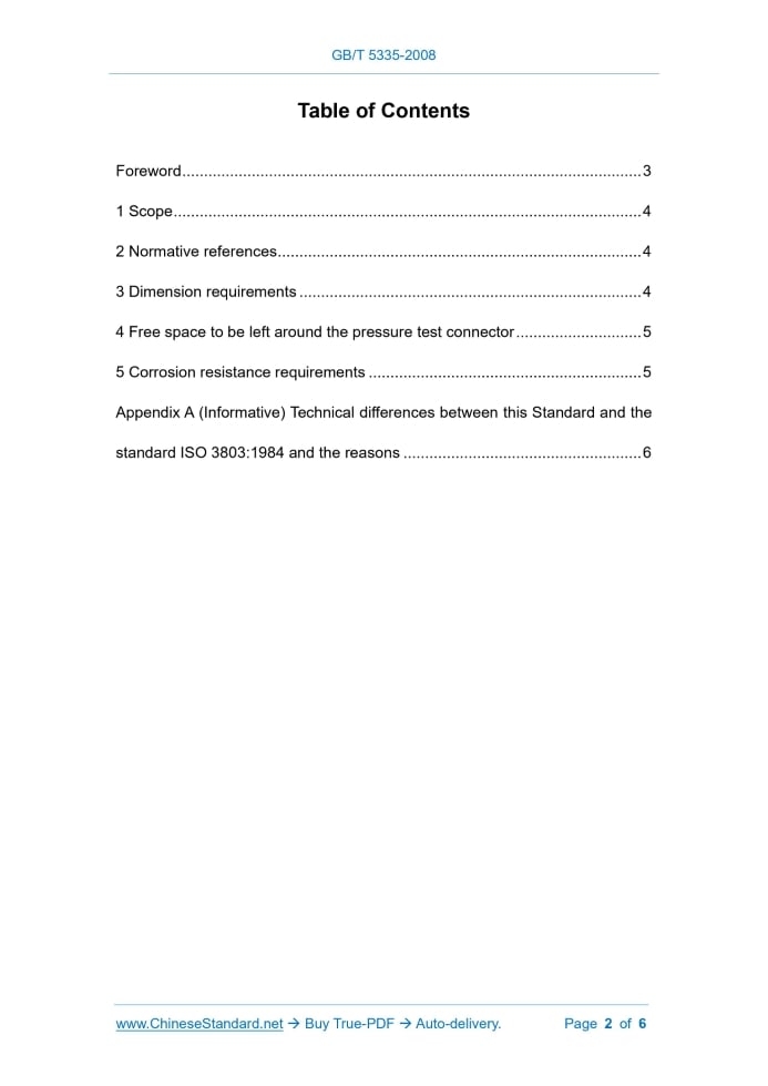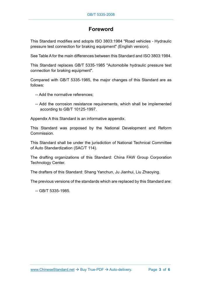 GB/T 5335-2008: Automobile pressure test connection for hydraulic braking equipment---This is an excerpt. Full copy of true-PDF in English version (including equations, symbols, images, flow-chart, tables, and figures etc.), auto-downloaded/delivered in 9 seconds, can be purchased online: https://www.ChineseStandard.net/PDF.aspx/GBT5335-2008GB NATIONAL STANDARD OF THE PEOPLE’S REPUBLIC OF CHINA ICS 43.040.40 T 24 Replacing GB/T 5335-1985 Automobile pressure test connection for Hydraulic braking equipment (ISO 3808:1984, Road vehicles - Hydraulic pressure test connection for braking equipment, MOD) ISSUED ON: OCTOBER 22, 2008 IMPLEMENTED ON: APRIL 01, 2009 Issued by: General Administration of Quality Supervision, Inspection and Quarantine; Standardization Administration of the People’s Republic of China. Table of ContentsForeword ... 3 1 Scope ... 4 2 Normative references ... 4 3 Dimension requirements ... 4 4 Free space to be left around the pressure test connector ... 5 5 Corrosion resistance requirements ... 5 Appendix A (Informative) Technical differences between this Standard and the standard ISO 3803:1984 and the reasons ... 6ForewordThis Standard modifies and adopts ISO 3803:1984 "Road vehicles - Hydraulic pressure test connection for braking equipment" (English version). See Table A for the main differences between this Standard and ISO 3803:1984. This Standard replaces GB/T 5335-1985 "Automobile hydraulic pressure test connection for braking equipment". Compared with GB/T 5335-1985, the major changes of this Standard are as follows: -- Add the normative references; -- Add the corrosion resistance requirements, which shall be implemented according to GB/T 10125-1997. Appendix A this Standard is an informative appendix. This Standard was proposed by the National Development and Reform Commission. This Standard shall be under the jurisdiction of National Technical Committee of Auto Standardization (SAC/T 114). The drafting organizations of this Standard: China FAW Group Corporation Technology Center. The drafters of this Standard: Shang Yanchun, Ju Jianhui, Liu Zhaoying. The previous versions of the standards which are replaced by this Standard are: -- GB/T 5335-1985. Automobile pressure test connection for Hydraulic braking equipment1 ScopeThis Standard specifies the main dimensions of the pressure test connector, the free space to be left around, and the corrosion resistance requirements for checking the reaction time and pressure value of the hydraulic braking equipment of automobile (except passenger cars and their variants). This Standard applies to hydraulic braking systems only.2 Normative referencesThe terms in the following documents become the terms of this Standard by reference to this Standard. For dated references, all subsequent amendments (not including errata content) or revisions do not apply to this standard. However, parties to agreements that are based on this Standard are encouraged to study whether the latest versions of these documents can be used. For undated references, the latest edition applies to this Standard. GB/T 10125-1997, Corrosion tests in artificial atmospheres - Salt spray tests (eqv ISO 9227:1990)3 Dimension requirements3.1 Figure 1 specifies the main dimensions of the pressure test connector joint. ......Source: Above contents are excerpted from the full-copy PDF -- translated/reviewed by: www.ChineseStandard.net / Wayne Zheng et al. Tips & Frequently Asked Questions:Question 1: How long will the true-PDF of English version of GB/T 5335-2008 be delivered?Answer: The full copy PDF of English version of GB/T 5335-2008 can be downloaded in 9 seconds, and it will also be emailed to you in 9 seconds (double mechanisms to ensure the delivery reliably), with PDF-invoice.Question 2: Can I share the purchased PDF of GB/T 5335-2008_English with my colleagues?Answer: Yes. The purchased PDF of GB/T 5335-2008_English will be deemed to be sold to your employer/organization who actually paid for it, including your colleagues and your employer's intranet.Question 3: Does the price include tax/VAT?Answer: Yes. Our tax invoice, downloaded/delivered in 9 seconds, includes all tax/VAT and complies with 100+ countries' tax regulations (tax exempted in 100+ countries) -- See Avoidance of Double Taxation Agreements (DTAs): List of DTAs signed between Singapore and 100+ countriesQuestion 4: Do you accept my currency other than USD?Answer: Yes. www.ChineseStandard.us -- GB/T 5335-2008 -- Click this link and select your country/currency to pay, the exact amount in your currency will be printed on the invoice. Full PDF will also be downloaded/emailed in 9 seconds.Question 5: Should I purchase the latest version GB/T 5335-2008?Answer: Yes. Unless special scenarios such as technical constraints or academic study, you should always prioritize to purchase the latest version GB/T 5335-2008 even if the enforcement date is in future. Complying with the latest version means that, by default, it also complies with all the earlier versions, technically.How to buy and download a true PDF of English version of GB/T 5335-2008?A step-by-step guide to download PDF of GB/T 5335-2008_EnglishStep 1: Visit website https://www.ChineseStandard.net (Pay in USD), or https://www.ChineseStandard.us (Pay in any currencies such as Euro, KRW, JPY, AUD).Step 2: Search keyword "GB/T 5335-2008". Step 3: Click "Add to Cart". If multiple PDFs are required, repeat steps 2 and 3 to add up to 12 PDFs to cart. Step 4: Select payment option (Via payment agents Stripe or PayPal). Step 5: Customize Tax Invoice -- Fill up your email etc. Step 6: Click "Checkout". Step 7: Make payment by credit card, PayPal, Google Pay etc. After the payment is completed and in 9 seconds, you will receive 2 emails attached with the purchased PDFs and PDF-invoice, respectively. Step 8: Optional -- Go to download PDF. Step 9: Optional -- Click Open/Download PDF to download PDFs and invoice. See screenshots for above steps: Ste