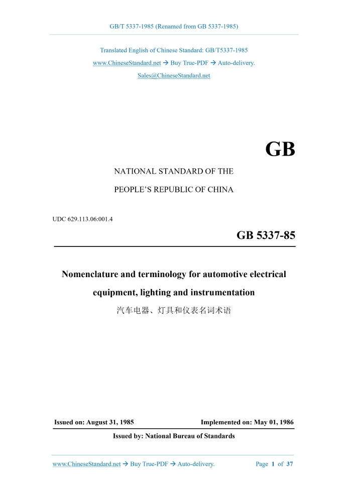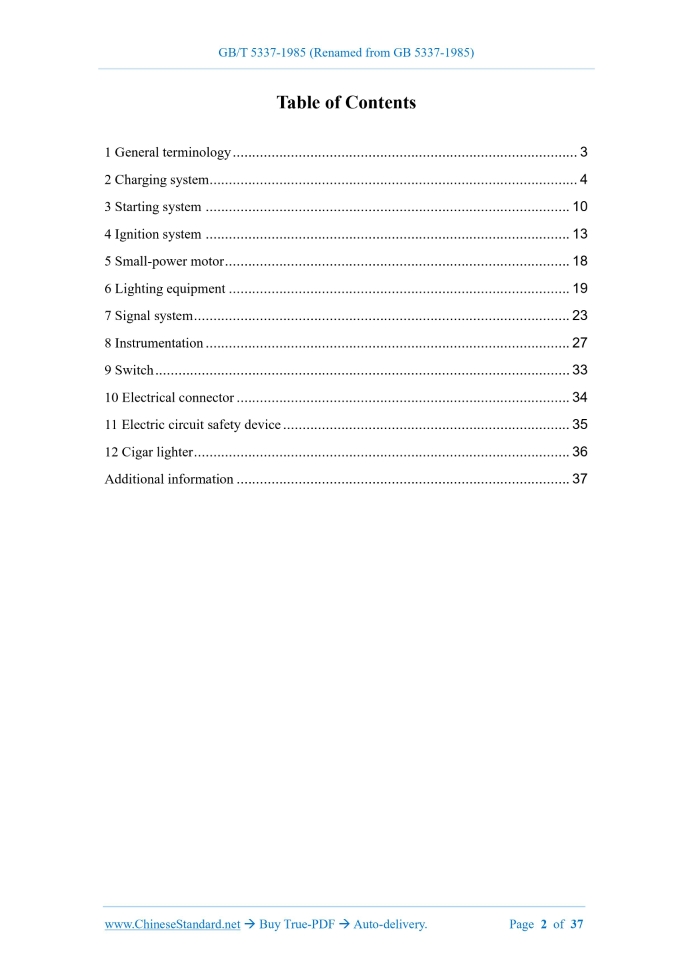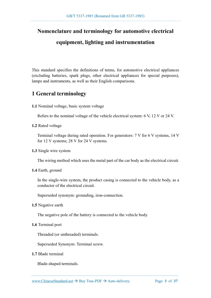 Similar standardsGB/T 5337-1985: Nomenclature and terminology for automotive electrical equipment, lighting and instrumentation---This is an excerpt. Full copy of true-PDF in English version (including equations, symbols, images, flow-chart, tables, and figures etc.), auto-downloaded/delivered in 9 seconds, can be purchased online: https://www.ChineseStandard.net/PDF.aspx/GBT5337-1985 NATIONAL STANDARD OF THE PEOPLE’S REPUBLIC OF CHINA UDC 629.113.06.001.4 GB 5337-85 Nomenclature and terminology for automotive electrical equipment, lighting and instrumentation Issued on. AUGUST 31, 1985 Implemented on. MAY 01, 1986 Issued by. National Bureau of Standards Table of Contents1 General terminology... 3 2 Charging system... 4 3 Starting system... 10 4 Ignition system... 13 5 Small-power motor... 18 6 Lighting equipment... 19 7 Signal system... 23 8 Instrumentation... 27 9 Switch... 33 10 Electrical connector... 34 11 Electric circuit safety device... 35 12 Cigar lighter... 36 Additional information... 37 Nomenclature and terminology for automotive electrical equipment, lighting and instrumentation This standard specifies the definitions of terms, for automotive electrical appliances (excluding batteries, spark plugs, other electrical appliances for special purposes), lamps and instruments, as well as their English comparisons.1 General terminology1.1 Nominal voltage, basic system voltage Refers to the nominal voltage of the vehicle electrical system. 6 V, 12 V or 24 V. 1.2 Rated voltage Terminal voltage during rated operation. For generators. 7 V for 6 V systems, 14 V for 12 V systems; 28 V for 24 V systems. 1.3 Single wire system The wiring method which uses the metal part of the car body as the electrical circuit. 1.4 Earth, ground In the single-wire system, the product casing is connected to the vehicle body, as a conductor of the electrical circuit. Superseded synonym. grounding, iron-connection. 1.5 Negative earth The negative pole of the battery is connected to the vehicle body. 1.6 Terminal post Threaded (or unthreaded) terminals. Superseded Synonym. Terminal screw. 1.7 Blade terminal Blade-shaped terminals.2 Charging system2.1 DC generator, dynamo The generator, which has a DC output current after, after commutated by the commutator. 2.6 Cut-in speed The generator speed, when the generator load is zero AND the terminal voltage reaches the rated voltage. 2.7 Load speed 2.13 Alternator regulator A device, that controls the output voltage of an alternator within a specified range OR is combined with other auxiliary devices. 2.13.1 Field relay A relay, which is used to automatically switch the alternator's field circuit on and off. Superseded synonym. anti-backflow relay. 2.13.2 Charge indicator relay A relay, which is used to automatically switch the battery's charge indicator on and off. 2.14.2.3 Accelerating winding A coil, which is used in a voltage regulator or current limiter, to increase the frequency of vibration of a contact. Superseded synonym. vibration coil. 2.14.2.7 Core Magnetic conductive parts, that cooperate with coils, to generate magnetic force. 2.14.2.8 Armature Magnetically conductive parts, that drive contacts by electromagnetic attraction. Superseded synonym. Vibrating arm, tongue. 2.14.2.9 Earth screw Superseded synonym. Ground screw.3 Starting system3.1 Starter, starting motor, cranking motor A DC motor of the starting engine, which is powered by a battery. Superseded synonym. starter motor, starter. 3.1.1 Overruning clutch Clutches that transmit torque in only one direction of rotation. Superseded synonym. clutch, one-way clutch, overrunning clutch. 3.1.1.1 Roller-type overrunning clutch A clutch, that transmits torque, when the rollers installed in the raceway of the one- way clutch are wedged. 3.1.4 Shift lever A shift lever, which is operated by an electromagnetic switch or a mechanical switch, to toggle the drive gear to mesh with the flywheel's gear ring. Superseded synonym. lever, moving fork. 3.1.5 Meshing spring The intermediate buffer spring, which is installed on the one-way clutch, when the shift lever pushes the drive gear to mesh with the flywheel's gear ring. 3.1.6 Return spring The spring that, when the electromagnetic force of the electromagnetic switch disappears, resets the electromagnetic switch and the drive gear. Superseded synonym. return spring.4 Ignition system4.1 Classical ignition system, conventional ignition system An ignition system, which is composed of an ignition coil, a circuit breaker with contacts (parallel with capacitors), a corresponding power supply. Superseded synonym. Battery ignition system. 4.1.1 Ignition coil An induction coil in an ignition system, that generates high voltage electricity. 4.1.1.5 Low tension terminal 4.1.2 Ignition distributor A device, which turns on and off the primary circuit of the ignition system, so that the ignition coil generates high-voltage electricity, AND distributes it to the spark plug on the corresponding cylinder, according to the ignition time and sequence required by the engine. 4.1.2.1 Breaker cam A flanged wheel, which is mounted on the ignition distributor's shaft, to periodically open and close the circuit breaker's contacts. 4.2 Semi-conductor ignition system, electronic ignition system, solid state ignition system Ignition systems, which use the semiconductor devices as switches. Superseded synonym. crystal ignition system. 4.3 Inductive ignition system An ignition system, that stores primary energy in an ignition coil. 4.4 Capacitor discharge ignition system Ignition system, that stores primary energy in capacitors. 4.5 Semi-conductor assisted ignition system Semiconductor ignition systems, which use the contact breaker. 4.6 Breakless ignition system Ignition system without contact breaker. 4.7 Distributorless ignition system An ignition system, that does not require a rotating high-voltage distributor. 4.8 Secondary available voltage The minimum voltage available at the spark