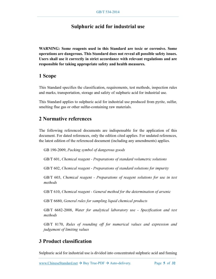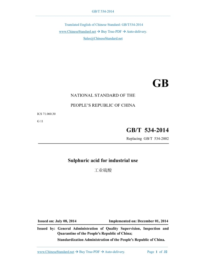 GB/T 534-2014: Sulphuric acid for industrial use Delivery: 9 seconds. True-PDF full-copy in English & invoice will be downloaded + auto-delivered via email. See step-by-step procedure Status: Valid GB/T 534: Historical versions
