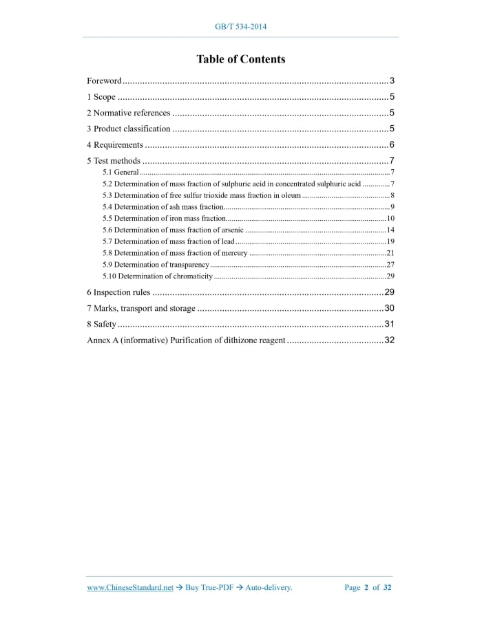 Similar standardsGB/T 534-2014: Sulphuric acid for industrial use---This is an excerpt. Full copy of true-PDF in English version (including equations, symbols, images, flow-chart, tables, and figures etc.), auto-downloaded/delivered in 9 seconds, can be purchased online: https://www.ChineseStandard.net/PDF.aspx/GBT534-2014GB NATIONAL STANDARD OF THE PEOPLE’S REPUBLIC OF CHINA ICS 71.060.30 G 11 Replacing GB/T 534-2002 Sulphuric acid for industrial use 工业硫酸 Issued on: JULY 08, 2014 Implemented on: DECEMBER 01, 2014 Issued by. General Administration of Quality Supervision, Inspection and Quarantine of the People's Republic of China; Standardization Administration of the People's Republic of China. Table of ContentsForeword... 3 1 Scope... 5 2 Normative references... 5 3 Product classification... 5 4 Requirements... 6 5 Test methods... 7 5.1 General... 7 5.2 Determination of mass fraction of sulphuric acid in concentrated sulphuric acid... 7 5.3 Determination of free sulfur trioxide mass fraction in oleum... 8 5.4 Determination of ash mass fraction... 9 5.5 Determination of iron mass fraction... 10 5.6 Determination of mass fraction of arsenic... 14 5.7 Determination of mass fraction of lead... 19 5.8 Determination of mass fraction of mercury... 21 5.9 Determination of transparency... 27 5.10 Determination of chromaticity... 29 6 Inspection rules... 29 7 Marks, transport and storage... 30 8 Safety... 31 Annex A (informative) Purification of dithizone reagent... 32 Sulphuric acid for industrial use WARNING. Some reagents used in this Standard are toxic or corrosive. Some operations are dangerous. This Standard does not reveal all possible safety issues. Users shall use it correctly in strict accordance with relevant regulations and are responsible for taking appropriate safety and health measures.1 ScopeThis Standard specifies the classification, requirements, test methods, inspection rules and marks, transportation, storage and safety of sulphuric acid for industrial use. This Standard applies to sulphuric acid for industrial use produced from pyrite, sulfur, smelting flue gas or other sulfur-containing raw materials.2 Normative referencesThe following referenced documents are indispensable for the application of this document. For dated references, only the edition cited applies. For undated references, the latest edition of the referenced document (including any amendments) applies. GB 190-2009, Packing symbol of dangerous goods GB/T 601, Chemical reagent - Preparations of standard volumetric solutions GB/T 602, Chemical reagent - Preparations of standard solutions for impurity GB/T 603, Chemical reagent - Preparations of reagent solutions for use in test methods GB/T 610, Chemical reagent - General method for the determination of arsenic GB/T 6680, General rules for sampling liquid chemical products GB/T 6682-2008, Water for analytical laboratory use - Specification and test methods GB/T 8170, Rules of rounding off for numerical values and expression and judgement of limiting values3 Product classificationSulphuric acid for industrial use is divided into concentrated sulphuric acid and fuming Keep away from light. 5.5.1.2.6 Iron (Fe) standard solution. 0.1mg/mL. 5.5.1.2.7 Iron (Fe) standard solution. 10μg/mL. Measure 10.00mL of iron standard solution (5.5.1.2.6) into a 100mL volumetric flask. Use water to dilute to the scale. Shake well. Prepare this solution when it is required. 5.5.1.3 Instruments Spectrophotometer. with 1cm cuvette. 5.5.1.4 Analysis steps 5.5.1.4.1 Drawing of working curve Take five 50mL volumetric flasks. Add 0mL, 2.50mL, 5.00mL, 7.50mL, 10.00mL of iron standard solution (5.5.1.2.7) respectively. Do the following for the solution in each volumetric flask. Add water to about 25mL. Add 2.5mL of hydroxylamine hydrochloride solution (5.5.1.2.3) and 5mL of acetic acid-sodium acetate buffer solution (5.5.1.2.4). After 5min, add 5mL of o-phenanthroline hydrochloric acid solution (5.5.1.2.5). Use water to dilute to the scale. Shake well. Leave it for 15min~30min to develop color. At the wavelength of 510nm, use a 1cm cuvette. Use the blank solution without iron standard solution as a reference. Use a spectrophotometer to determine the absorbance of the above solution. Take the mass of iron in the above solution (in micrograms) as the abscissa, and the corresponding absorbance value as the ordinate, to draw the working curve. Or calculate a linear regression equation based on the obtained absorbance value. 5.5.1.4.2 Determination Weigh 10g~20g of specimen, accurate to 0.01g. Put in a 50mL beaker. Evaporate to dryness on a sand bath (or temperature-controlled hotplate). Cool. Add 2mL of hydrochloric acid solution (5.5.1.2.2) and 25mL of water. Heat to dissolve the salt. Transfer to a 100mL volumetric flask. Use water to dilute to the scale. Shake well. Use a pipette to measure a certain volume of the test solution. Place it in a 50mL volumetric flask. Make the corresponding iron mass between 10μg~100μg. Add water to dilute to about 25mL. Then follow the steps in "Add 2.5mL of hydroxylamine hydrochloride solution (5.5.1.2.3)... develop color" in 5.5.1.4.1. At a wavelength of 510nm, use a 1cm cuvette. Use the blank solution without iron standard solution as a reference. Use a spectrophotometer to determine the absorbance of the test solution. Measure 10.00mL of iron standard solution (5.5.2.3.2) into a 100mL volumetric flask. Use water to dilute to the scale. Shake well. Prepare this solution when it is required. 5.5.2.4 Instruments 5.5.2.4.1 Dropping bottle. the capacity is about 30mL. 5.5.2.4.2 Atomic absorption spectrophotometer (with iron hollow cathode lamp). 5.5.2.5 Analysis steps 5.5.2.5.1 Drawing of working curve Take five 50mL volumetric flasks. Add 0mL, 1.00mL, 2.00mL, 3.00mL, 4.00mL of iron standard solution (5.5.2.3.3) respectively. Add 25mL of nitric acid solution (5.5.2.3.1) to each. Use water to dilute to the scale. Shake well. On an atomic absorption