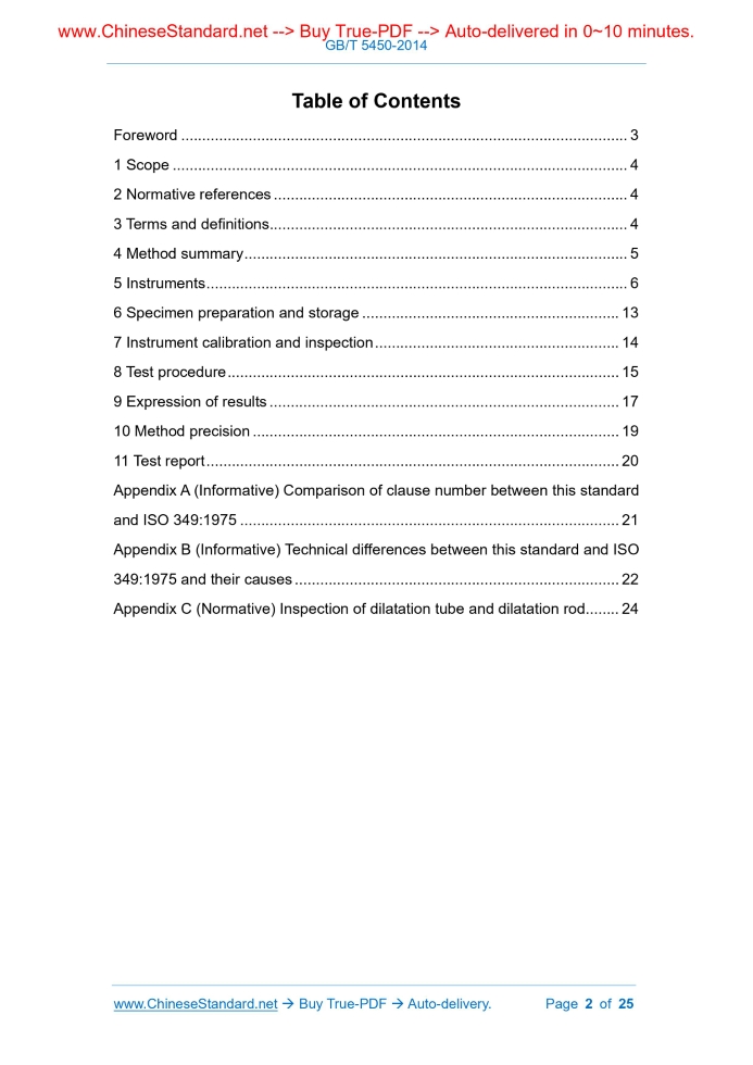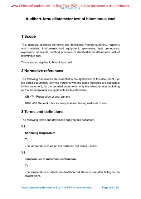 GB/T 5450-2014: Audibert-Arnu dilatometer test of bituminous coal---This is an excerpt. Full copy of true-PDF in English version (including equations, symbols, images, flow-chart, tables, and figures etc.), auto-downloaded/delivered in 9 seconds, can be purchased online: https://www.ChineseStandard.net/PDF.aspx/GBT5450-2014NATIONAL STANDARD OF THE PEOPLE’S REPUBLIC OF CHINA ICS 73.040 D 21 Replacing GB/T 5450-1997 Audibert-Arnu dilatometer test of bituminous coal (ISO 349.1975, Hard coal - Audibert-Arnu dilatometer test, MOD) Issued on. JUNE 09, 2014 Implemented on. OCTOBER 01, 2014 Issued by. General Administration of Quality Supervision, Inspection and Quarantine; Standardization Administration of PRC. Table of ContentsForeword... 3 1 Scope... 4 2 Normative references... 4 3 Terms and definitions... 4 4 Method summary... 5 5 Instruments... 6 6 Specimen preparation and storage... 13 7 Instrument calibration and inspection... 14 8 Test procedure... 15 9 Expression of results... 17 10 Method precision... 19 11 Test report... 20 Appendix A (Informative) Comparison of clause number between this standard and ISO 349.1975... 21 Appendix B (Informative) Technical differences between this standard and ISO 349.1975 and their causes... 22 Appendix C (Normative) Inspection of dilatation tube and dilatation rod... 24ForewordThis standard was drafted in accordance with the rules given in GB/T 1.1-2009. This standard replaces GB/T 5450-1997 "Audibert-Arnu dilatometer test of bituminous coal". Compared with GB/T 5450-1997, the main technical changes are as follows. - DELETE the description of the number of turns of the electric furnace wire in the original standard (see 4.1.2 of the 1997 edition); - MODIFY the contraction of adjustment lever to the tilt contraction (see Chapter 9.1; Chapter 7 of the 1997 edition); - It is stipulated that if the initial dilatation temperature is greater than 500 °C during tilt contraction, the initial dilatation temperature shall be reported as 500 °C (see 8.1). This standard uses the redrafting method to modify and adopt ISO 349.1975 "Hard coal - Audibert-Arnu dilatometer test". Compared with ISO349.1975, this standard has been structurally adjusted. Appendix A lists the comparison of clause number between this standard and ISO 349.1975. There are technical differences between this standard and ISO 349.1975.The terms involved in these differences have been marked by vertical single lines (I) on the outer margins of the corresponding page. Appendix B gives a list of corresponding technical differences and their causes. This standard was proposed by China Coal Industry Association. This standard shall be under the jurisdiction of the National Coal Standardization Technical Committee (SAC/TC 42). Drafting organization of this standard. Testing Research Branch of the Coal Science Research Institute. The main drafters of this standard. Chen Baohua, Li Hongtu, Xing Xiuyun. The previous editions of GB/T 5450-1997 are as follows. - GB/T 5450-1985. Audibert-Arnu dilatometer test of bituminous coal1 ScopeThis standard specifies the terms and definitions, method summary, reagents and materials, instruments and equipment, specimens, test procedures, expression of results, method precision of Audibert-Arnu dilatometer test of bituminous coal.2 Normative referencesThe following documents are essential to the application of this document. For the dated documents, only the versions with the dates indicated are applicable to this document; for the undated documents, only the latest version (including all the amendments) are applicable to this standard.3 Terms and definitionsThe following terms and definitions apply to this document. The temperature at which the dilatation rod stops moving. The percentage of maximum distance that the dilatation rod rises to the length of the coal pencil.4 Method summaryThe test coal sample is made into a coal pencil of a certain specification according to the prescribed method, placed in a standard caliber tube (dilatation tube), on which a steel rod (dilatation rod) that can slide freely in the tube is placed.5 InstrumentsThe electric furnace is composed of a shell with a base and a top cover as well as a metal furnace core. The furnace core is made of aluminum bronze metal block which can resist oxidation.6 Specimen preparation and storageThe prepared coal samples for general analysis and testing shall be packed in glass bottles with ground stoppers and placed in a cool place. The test shall be completed within 3 days after preparation.7 Instrument calibration and inspectionThe gauge can be used to check the wear of the forming mold used in the test. Meanwhile it can also be used to check the new forming mold. If it inserts the gauge from the large-diameter end of the forming mold being inspected, it can observe.8 Test procedureRemove the wire plug at the bottom of the dilatation tube. Use a metal rod with an axe-shaped head to remove the semi-coke in the tube. Then use a copper wire brush to clean the remaining semi-coke powder in the tube.9 Expression of resultsFigures 10 ~ 13 respectively show four types of recording curves for positive dilatation, negative dilatation, contraction only, tilt contraction in the bituminous coal dilatometer test.10 Method precisionThe repeatability limit and reproducibility critical difference of Audibert-Arnu dilatometer test of bituminous coal are as specified in Table 3.11 Test reportThe test result report shall include at least the following information. ......Source: Above contents are excerpted from the full-copy PDF -- translated/reviewed by: www.ChineseStandard.net / Wayne Zheng et al. Tips & Frequently Asked Questions:Question 1: How long will the true-PDF of English version of GB/T 5450-2014 be delivered?Answer: The full copy PDF of English version of GB/T 5450-2014 can be downloaded in 9 seconds, and it will also be emailed to you in 9 seconds (double mechanisms to ensure the delivery reliably), with P