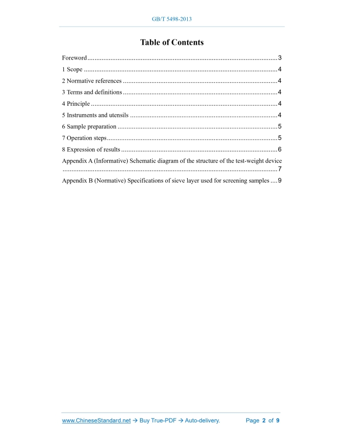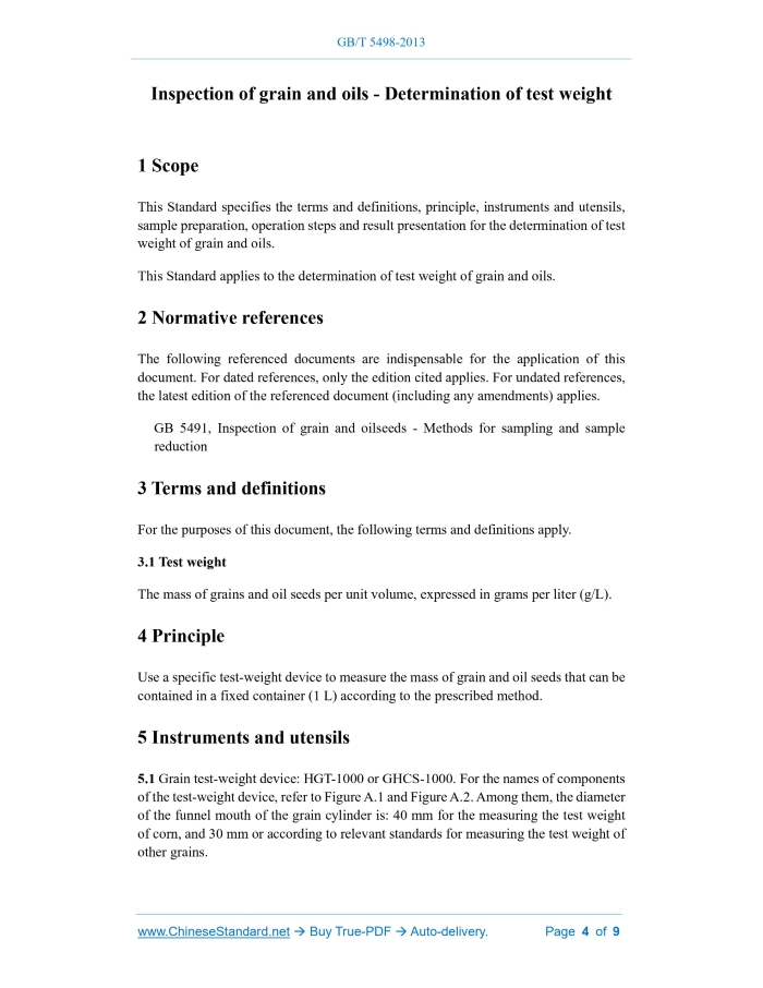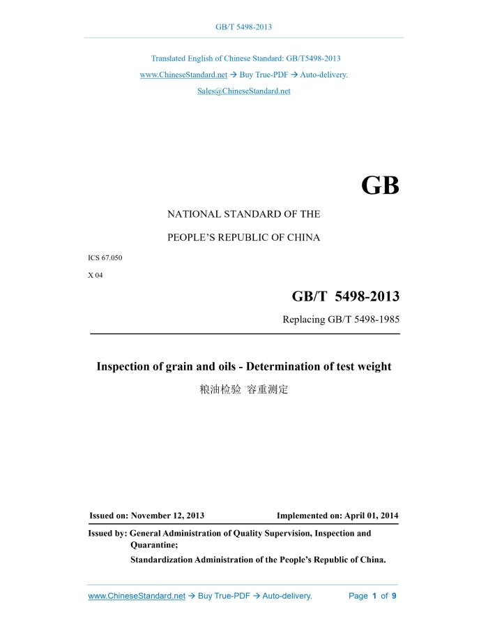 GB/T 5498-2013: Inspection of grain and oils -- Determination of test weight Delivery: 9 seconds. True-PDF full-copy in English & invoice will be downloaded + auto-delivered via email. See step-by-step procedure Status: Valid GB/T 5498: Historical versions