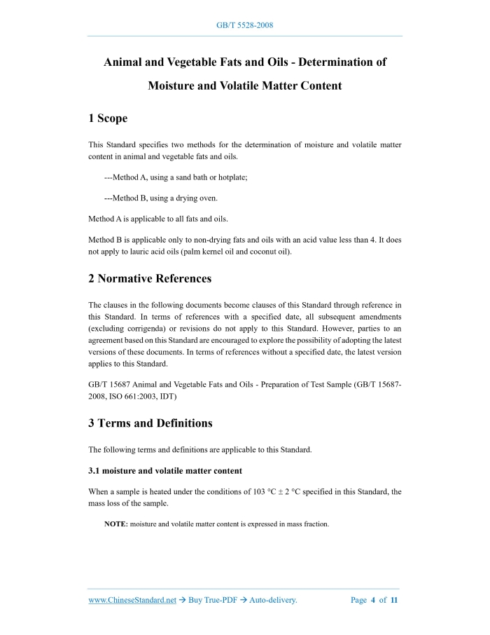 GB/T 5528-2008: Animal and vegetable fats and oils -- Determination of moisture and volatile matter content---This is an excerpt. Full copy of true-PDF in English version (including equations, symbols, images, flow-chart, tables, and figures etc.), auto-downloaded/delivered in 9 seconds, can be purchased online: https://www.ChineseStandard.net/PDF.aspx/GBT5528-2008 GB NATIONAL STANDARD OF THE PEOPLE’S REPUBLIC OF CHINA ICS 67.200.10 X 14 GB/T 5528-2008 / ISO 662:1998 Replacing GB/T 5528-1995 Animal and Vegetable Fats and Oils - Determination of Moisture and Volatile Matter Content (ISO 662:1998, IDT) Replaced ISSUED ON: NOVEMBER 4, 2008 IMPLEMENTED ON: JANUARY 20, 2009 Issued by: General Administration of Quality Supervision, Inspection and Quarantine of the People’s Republic of China; Standardization Administration of the People’s Republic of China. Table of ContentsForeword ... 3 1 Scope ... 4 2 Normative References ... 4 3 Terms and Definitions ... 4 4 Principle ... 5 5 Sampling ... 5 6 Preparation of Test Sample ... 5 7 Method A ... 5 8 Method B ... 6 9 Result Calculation ... 7 10 Precision ... 7 11 Test Report ... 8 Appendix A (informative) Test Results of International Laboratories ... 9 Bibliography ... 11 Animal and Vegetable Fats and Oils - Determination of Moisture and Volatile Matter Content1 ScopeThis Standard specifies two methods for the determination of moisture and volatile matter content in animal and vegetable fats and oils. ---Method A, using a sand bath or hotplate; ---Method B, using a drying oven. Method A is applicable to all fats and oils. Method B is applicable only to non-drying fats and oils with an acid value less than 4. It does not apply to lauric acid oils (palm kernel oil and coconut oil).2 Normative ReferencesThe clauses in the following documents become clauses of this Standard through reference in this Standard. In terms of references with a specified date, all subsequent amendments (excluding corrigenda) or revisions do not apply to this Standard. However, parties to an agreement based on this Standard are encouraged to explore the possibility of adopting the latest versions of these documents. In terms of references without a specified date, the latest version applies to this Standard. GB/T 15687 Animal and Vegetable Fats and Oils - Preparation of Test Sample (GB/T 15687- 2008, ISO 661:2003, IDT)3 Terms and DefinitionsThe following terms and definitions are applicable to this Standard. 3.1 moisture and volatile matter content When a sample is heated under the conditions of 103 C 2 C specified in this Standard, the mass loss of the sample. NOTE: moisture and volatile matter content is expressed in mass fraction.4 PrincipleUnder the conditions of 103 C 2 C, heat the test sample, until the moisture and volatile matter are completely dissipated, and determine the mass loss of the sample.5 SamplingThis Standard does not stipulate the sampling method. It is recommended to adopt the method of GB/T 5524. Samples received by the laboratory shall be representative and shall not be damaged or deteriorated during transportation and storage.6 Preparation of Test SampleComply with the method specified in GB/T 15687.7 Method A7.1 Instruments Commonly used laboratory instruments, as well as the following. 7.1.1 Analytical balance: with a division value of 0.0001 g. 7.1.2 Dish, made of porcelain or glass, with a flat bottom, 80 mm ~ 90 mm in diameter, about 30 mm in depth. 7.1.3 Thermometer, with a scale range of at least 80 C ~ 110 C, about 100 mm in length, with a reinforced mercury bulb and with an expansion chamber at its upper end. 7.1.4 Sand bath or electric hotplate. 7.1.5 Desiccator, containing an efficient desiccant. 7.2 Operating Procedures 7.2.1 Preparation of test sample In a dish (7.1.2) that has been pre-dried and weighed together with the thermometer (7.1.3), weigh-take about 20 g of the test sample, accurate to 0.001 g. 7.2.2 Determination Heat the dish containing the test sample (7.2.1) to 90 C on a sand bath or electric hotplate (7.1.4), and control the heating rate at about 10 C/min. While heating, use the thermometer to stir it. Reduce the heating rate and observe the rise of bubbles at the bottom of the dish. Control the temperature to rise to 103 C 2 C, and make sure it does not exceed 105 C. Continue stirring, until no bubbles are released from the bottom of the dish. To ensure that the moisture is completely dissipated, repeat the steps of heating to 103 C 2 C and cool to 90 C several times. Place the dish and thermometer in the desiccator (7.1.5), cool to room temperature, and weigh it, accurate to 0.001 g. Repeat the above operation, until two consecutive results do not exceed 2 mg. 7.2.3 Number of determinations For the same test sample, conduct two determinations.8 Method B8.1 Instruments Commonly used laboratory instruments, as well as the following. 8.1.1 Analytical balance: with a division value of 0.001 g. 8.1.2 Glass container: with a flat bottom, about 50 m in diameter, and about 30 mm in height. 8.1.3 Electric drying oven: with the main control temperature of 103 C 2 C. 8.1.4 Desiccator, containing an efficient desiccant. 8.2 Operating Procedures 8.2.1 Preparation of test sample In a pre-dried and weighed glass container (8.1.2), in accordance with the expected moisture and volatile matter content of the test sample, weigh-take 5 g or 10 g of test sample, accurate to 0.001 g. 8.2.2 Determination Place the glass container containing the test sample (8.2.1) in the electric drying oven (8.1.3) at 103 C 2 C for 1 hour, then, transfer it into the desiccator (8.1.4), cool to room temperature, and weigh it, accurate to 0.001 g. Repeat the steps of heating, cooling and weighing. Each re- baking time is 30 minutes, until the difference between two consecutive weighings respectively does not exceed 2 mg or 4 mg, depending on the mass of the test sample (8.2.1). NOTE: the mass of the sample increases after repeated heating, indicating tha