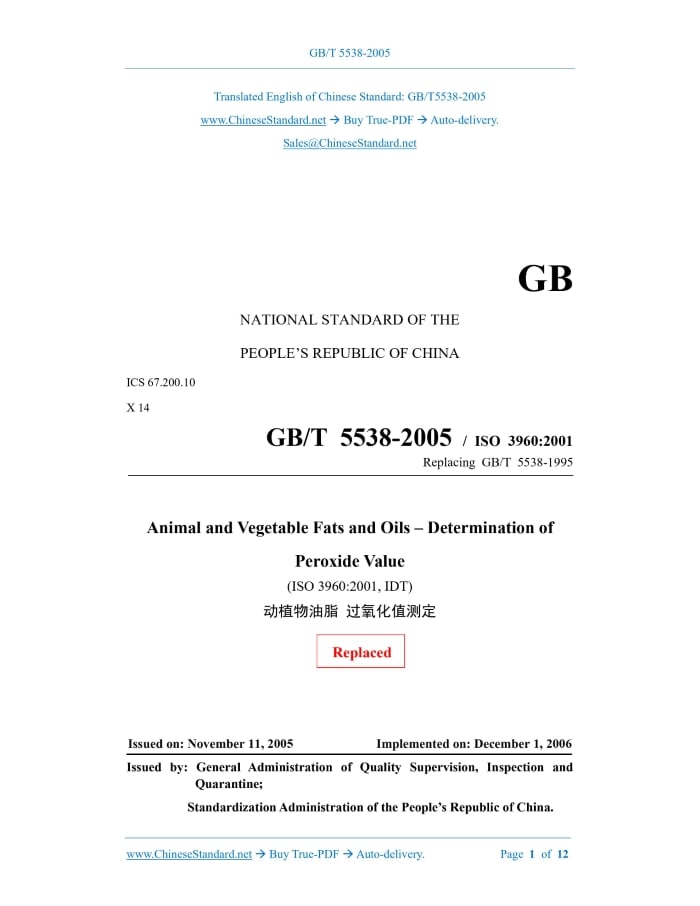 GB/T 5538-2005: Animal and vegetable fats and oils -- Determination of peroxide value Delivery: 9 seconds. True-PDF full-copy in English & invoice will be downloaded + auto-delivered via email. See step-by-step procedure Status: Obsolete GB/T 5538: Historical versions