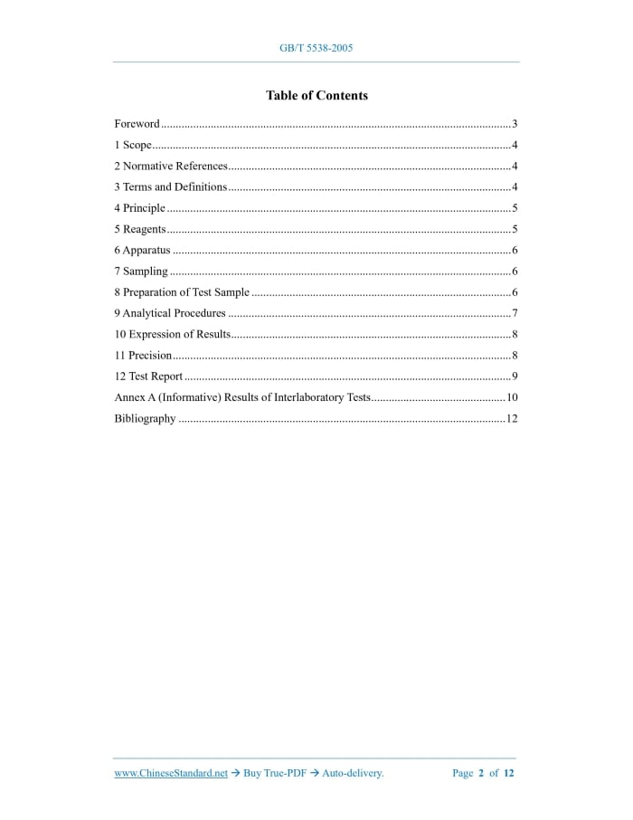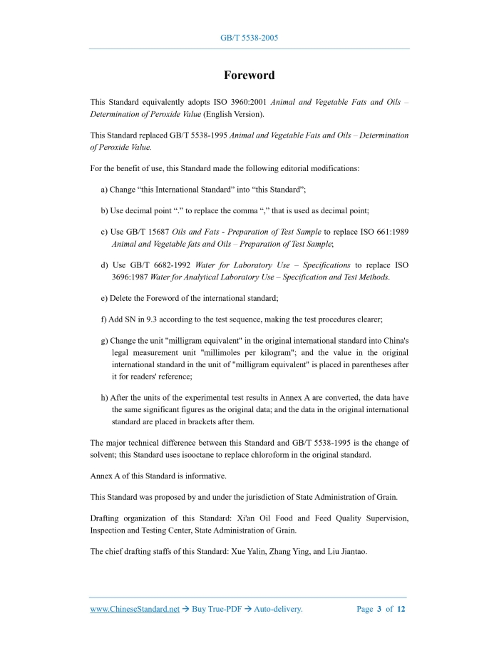 Similar standardsGB/T 5538-2005: Animal and vegetable fats and oils -- Determination of peroxide value---This is an excerpt. Full copy of true-PDF in English version (including equations, symbols, images, flow-chart, tables, and figures etc.), auto-downloaded/delivered in 9 seconds, can be purchased online: https://www.ChineseStandard.net/PDF.aspx/GBT5538-2005GB NATIONAL STANDARD OF THE PEOPLE’S REPUBLIC OF CHINA ICS 67.200.10 X 14 GB/T 5538-2005 / ISO 3960:2001 Replacing GB/T 5538-1995 Animal and Vegetable Fats and Oils – Determination of Peroxide Value (ISO 3960:2001, IDT) ISSUED ON: NOVEMBER 11, 2005 IMPLEMENTED ON: DECEMBER 1, 2006 Issued by: General Administration of Quality Supervision, Inspection and Quarantine; Standardization Administration of the People’s Republic of China. Replaced Table of ContentsForeword ... 3 1 Scope ... 4 2 Normative References ... 4 3 Terms and Definitions ... 4 4 Principle ... 5 5 Reagents ... 5 6 Apparatus ... 6 7 Sampling ... 6 8 Preparation of Test Sample ... 6 9 Analytical Procedures ... 7 10 Expression of Results ... 8 11 Precision ... 8 12 Test Report ... 9 Annex A (Informative) Results of Interlaboratory Tests ... 10 Bibliography ... 12ForewordThis Standard equivalently adopts ISO 3960:2001 Animal and Vegetable Fats and Oils – Determination of Peroxide Value (English Version). This Standard replaced GB/T 5538-1995 Animal and Vegetable Fats and Oils – Determination of Peroxide Value. For the benefit of use, this Standard made the following editorial modifications: a) Change “this International Standard” into “this Standard”; b) Use decimal point “.” to replace the comma “,” that is used as decimal point; c) Use GB/T 15687 Oils and Fats - Preparation of Test Sample to replace ISO 661:1989 Animal and Vegetable fats and Oils – Preparation of Test Sample; d) Use GB/T 6682-1992 Water for Laboratory Use – Specifications to replace ISO 3696:1987 Water for Analytical Laboratory Use – Specification and Test Methods. e) Delete the Foreword of the international standard; f) Add SN in 9.3 according to the test sequence, making the test procedures clearer; g) Change the unit "milligram equivalent" in the original international standard into China's legal measurement unit "millimoles per kilogram"; and the value in the original international standard in the unit of "milligram equivalent" is placed in parentheses after it for readers' reference; h) After the units of the experimental test results in Annex A are converted, the data have the same significant figures as the original data; and the data in the original international standard are placed in brackets after them. The major technical difference between this Standard and GB/T 5538-1995 is the change of solvent; this Standard uses isooctane to replace chloroform in the original standard. Annex A of this Standard is informative. This Standard was proposed by and under the jurisdiction of State Administration of Grain. Drafting organization of this Standard: Xi'an Oil Food and Feed Quality Supervision, Inspection and Testing Center, State Administration of Grain. The chief drafting staffs of this Standard: Xue Yalin, Zhang Ying, and Liu Jiantao. Animal and Vegetable Fats and Oils – Determination of Peroxide Value1 ScopeThis Standard specifies a method for the determination of the peroxide value of animal and vegetable fats and oils.2 Normative ReferencesThe provisions in the following documents become the provisions of this Standard through reference in this Standard. For dated references, the subsequent amendments (excluding corrigendum) or revisions do not apply to this Standard, however, parties who reach an agreement based on this Standard are encouraged to study if the latest versions of these documents are applicable. For undated references, the latest edition of the referenced document applies. GB/T 6682-1992 Water for laboratory use – Specifications (neq ISO 3696:1987) GB/T 15687 Oils and fats - Preparation of test sample (GB/T 15687-1995, eqv ISO 661:1989)3 Terms and DefinitionsFor the purposes of this Document, the following terms and definitions apply. 3.1 Peroxide value Quantity of those substances in the sample, expressed in terms of active oxygen, which oxidize potassium iodide under the conditions specified in this Standard, divided by the mass of the test portion. NOTE 1: Peroxide value is usually expressed in industry as milliequivalents per kilogram. NOTE 2: Peroxide value may also be expressed (in SI units) as millimoles per kilogram. The value expressed in millimoles per kilogram is half that expressed in milliequivalents per kilogram (see Clause 10). 5.8 Starch solution, 5 g/L. Mix 1 g of starch and a small amount of cold distilled water. Add this mixture, while stirring, to 200 mL of boiling water. Add 250 mg of salicylic acid as preservative and boil for 3 min. Immediately remove from the heat and cool. If long storage is required, keep the solution in a refrigerator at between 4 °C and 10 °C for 2 weeks to 3weeks. A fresh starch solution shall be prepared when the endpoint of the titration from blue to colorless fails to be sharp. The sensitivity of the starch solution may be tested as follows. To 5 mL of the starch solution in 100 mL of water; add 0.05 % of potassium iodide solution (5.5) and 1 drop of 0.05 % sodium hypochlorite solution. When titrating more than 0.05mL of sodium thiosulfate solution (5.6), if the deep blue color disappears, it shall indicate that the sensitivity is insufficient.6 ApparatusAll used equipment shall be free from reducing or oxidizing substances. Do not grease ground glass surfaces. Usual laboratory apparatus and, in particular, the following. 6.1 Conical flasks, of 250 mL capacity, with ground glass stoppers.7 SamplingIt is important that the laboratory receive a sample that is truly representative and has not been damaged or changed during transport or storage. Sampling is not part of the method specified in this S