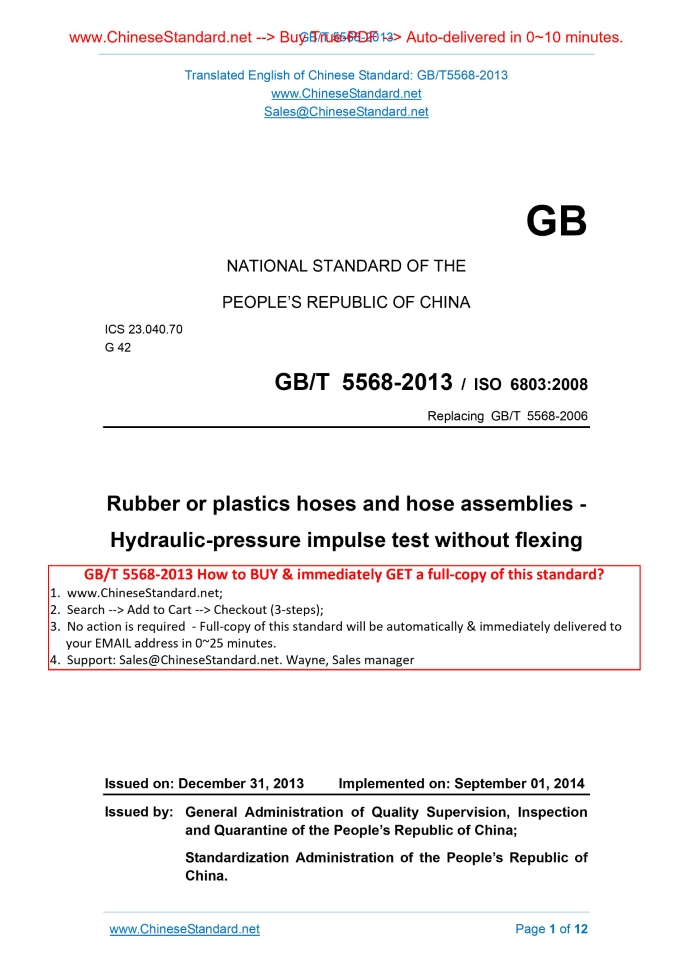 GB/T 5568-2013: Rubber or plastics hoses and hose assemblies -- Hydraulic-pressure impulse test without flexing Delivery: 9 seconds. True-PDF full-copy in English & invoice will be downloaded + auto-delivered via email. See step-by-step procedure Status: Obsolete GB/T 5568: Historical versions