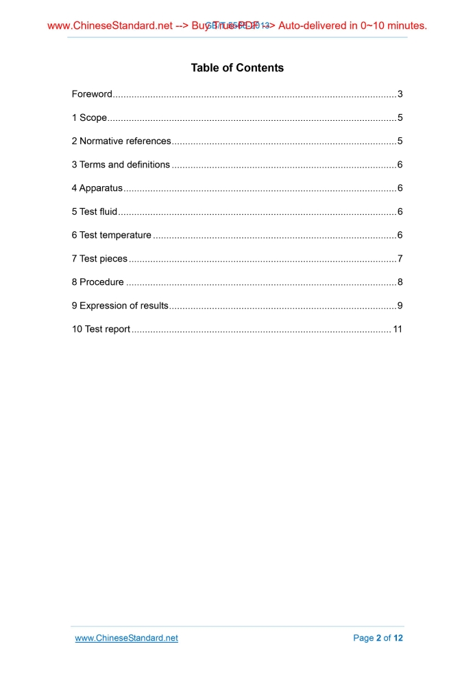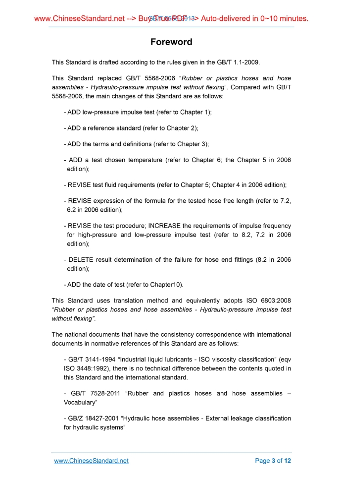 Similar standardsGB/T 5568-2013: Rubber or plastics hoses and hose assemblies -- Hydraulic-pressure impulse test without flexing---This is an excerpt. Full copy of true-PDF in English version (including equations, symbols, images, flow-chart, tables, and figures etc.), auto-downloaded/delivered in 9 seconds, can be purchased online: https://www.ChineseStandard.net/PDF.aspx/GBT5568-2013 GB NATIONAL STANDARD OF THE PEOPLE’S REPUBLIC OF CHINA ICS 23.040.70 G 42 GB/T 5568-2013 / ISO 6803.2008 Replacing GB/T 5568-2006 Rubber or plastics hoses and hose assemblies - Hydraulic-pressure impulse test without flexing (ISO 6803.2008, IDT) Issued on: DECEMBER 31, 2013 Implemented on: SEPTEMBER 01, 2014 Issued by. General Administration of Quality Supervision, Inspection and Quarantine of the People’s Republic of China; Standardization Administration of the People’s Republic of China. GB/T 5568-2013 Table of ContentsForeword... 3 1 Scope... 5 2 Normative references... 5 3 Terms and definitions... 6 4 Apparatus... 6 5 Test fluid... 6 6 Test temperature... 6 7 Test pieces... 7 8 Procedure... 8 9 Expression of results... 9 10 Test report... 11 GB/T 5568-2013ForewordThis Standard is drafted according to the rules given in the GB/T 1.1-2009. This Standard replaced GB/T 5568-2006 “Rubber or plastics hoses and hose assemblies - Hydraulic-pressure impulse test without flexing”. Compared with GB/T 5568-2006, the main changes of this Standard are as follows. - ADD low-pressure impulse test (refer to Chapter 1); - ADD a reference standard (refer to Chapter 2); - ADD the terms and definitions (refer to Chapter 3); - ADD a test chosen temperature (refer to Chapter 6; the Chapter 5 in 2006 edition); - REVISE test fluid requirements (refer to Chapter 5; Chapter 4 in 2006 edition); - REVISE expression of the formula for the tested hose free length (refer to 7.2, 6.2 in 2006 edition); - REVISE the test procedure; INCREASE the requirements of impulse frequency for high-pressure and low-pressure impulse test (refer to 8.2, 7.2 in 2006 edition); - DELETE result determination of the failure for hose end fittings (8.2 in 2006 edition); - ADD the date of test (refer to Chapter10). This Standard uses translation method and equivalently adopts ISO 6803.2008 “Rubber or plastics hoses and hose assemblies - Hydraulic-pressure impulse test without flexing”. The national documents that have the consistency correspondence with international documents in normative references of this Standard are as follows. - GB/T 3141-1994 “Industrial liquid lubricants - ISO viscosity classification” (eqv ISO 3448.1992), there is no technical difference between the contents quoted in this Standard and the international standard. - GB/T 7528-2011 “Rubber and plastics hoses and hose assemblies – Vocabulary” - GB/Z 18427-2001 “Hydraulic hose assemblies - External leakage classification for hydraulic systems” GB/T 5568-2013 The Standard was proposed by China Petroleum and Chemical Industry Federation. This Standard shall be under the jurisdiction of National Technical Committee on Rubber and Products of Standardization Administration of China (SAC/TC 35/SC 1). Drafting organizations of this Standard. Hebei Yutong Special Rubber Hose Co., Ltd., Luohe Letong Rubber Co., Ltd, Hengshui Administration of Quality and Technical Supervision, Inspection, Qingdao Xiangliu Rubber Hose Co., Ltd., Tianjin Ge Tesi Detection Equipment Technology Development Co., Ltd., and Shenyang Rubber Research & Design Institute. The main drafters of this Standard. Hao Wei, Zhong Weijiang, Li Jinsheng, Wang Yongfu, Cai Zhixiong, Zhao Hongliang, Liu Hongbin, and Zhang Yanfen. The historical versions replaced by this Standard are as follows. - GB/T 5568-1985, GB/T 5568-1994, GB/T 5568-2006. GB/T 5568-2013 Rubber or plastics hoses and hose assemblies - Hydraulic-pressure impulse test without flexing WARNING - Personnel who uses this Standard shall have the experience working in the regular laboratory. This Standard does not refer to all the possible safety problems. Users have the responsibility for appropriate safety and health measures and shall guarantee that all the measures shall comply with the conditions specified by national related regulations.1 ScopeThis Standard specifies hose impulse test, without flexing, of rubber or plastics hydraulic hose assemblies at both high and low impulse pressures. The high-pressure testing is carried out at pressures more than 3MPa and the low-pressure test at pressures from 1.5 MPa to 3 MPa. The test procedure applies to hydraulic hose assemblies that are subject to pulsating pressures in service which are included in the product requirements. Note. Impulse test procedures with flexing can be found in ISO 6802, "Rubber and plastics hoses and hose assemblies with wire reinforcements - Hydraulic impulse test with flexing".2 Normative referencesThe following documents are essential to the application of this document. For the dated documents, only the versions with the dates indicated are applicable to this document; for the undated documents, only the latest version (including all the amendments) are applicable to this Standard. ISO 3448 Industrial liquid lubricants - ISO viscosity classification ISO 8330 Rubber and plastics hoses and hose assemblies - Vocabulary ISO/TR 11340 Rubber and rubber products - Hydraulic hose assemblies - External leakage classification for hydraulic systems GB/T 5568-20133 Terms and definitionsThe terms and definitions given in ISO 8330 apply to this document.4 Apparatus4.1 Pressure-application apparatus It is capable of applying an internal pulsating pressure to the test piece at a rate of 1 Hz ± 0.25 Hz using a hydraulic fluid circulating through the test hose, while the fluid is maintained at the required test temperature. Each pressure cycle shall be within the tolerances shown in Figure 2 (for high-pressure test) or Figure 3 (for low-pressure test). The nominal rate of pressure rise 