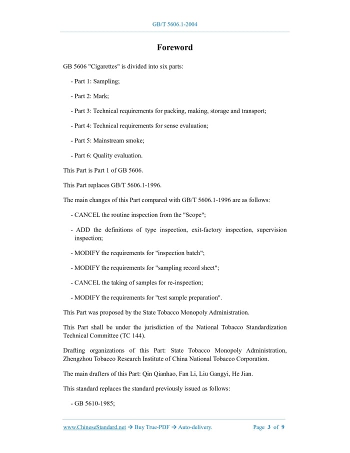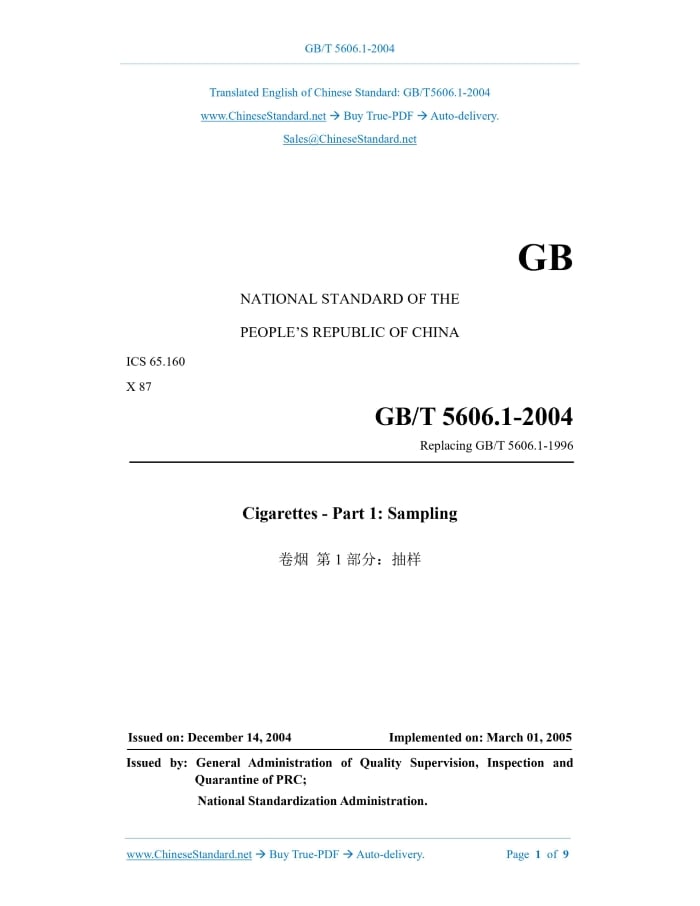 GB/T 5606.1-2004: Cigarettes -- Part 1: Sampling Delivery: 9 seconds. True-PDF full-copy in English & invoice will be downloaded + auto-delivered via email. See step-by-step procedure Status: Valid GB/T 5606.1: Historical versions