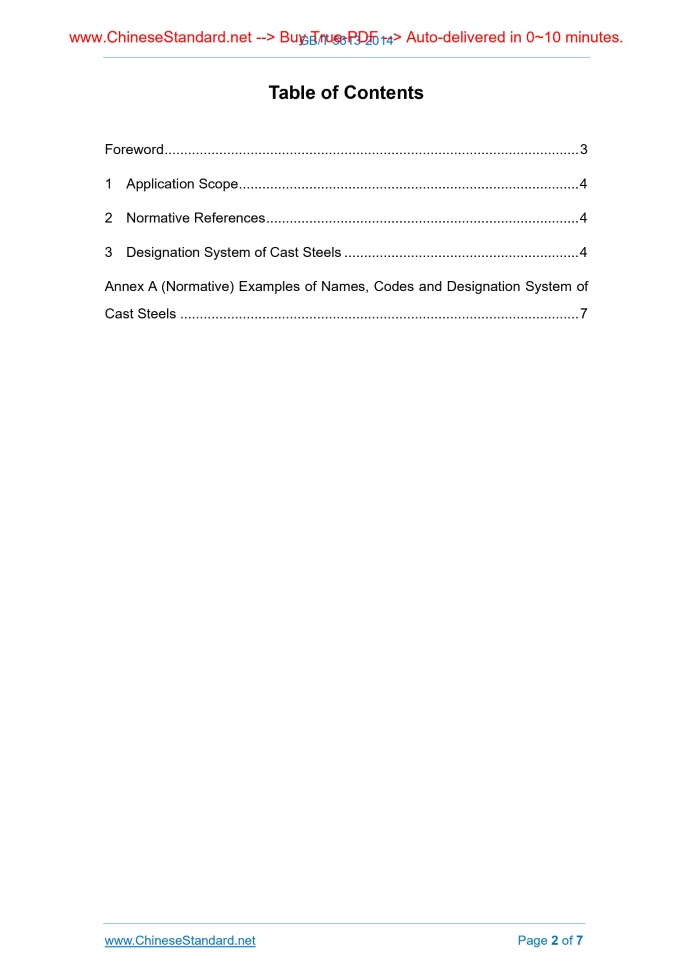 GB/T 5613-2014: Designation for cast steels---This is an excerpt. Full copy of true-PDF in English version (including equations, symbols, images, flow-chart, tables, and figures etc.), auto-downloaded/delivered in 9 seconds, can be purchased online: https://www.ChineseStandard.net/PDF.aspx/GBT5613-2014GB NATIONAL STANDARD OF THE PEOPLE’S REPUBLIC OF CHINA ICS 77.140.80 J 31 Replacing GB/T 5613-1995 Designation for Cast Steels Issued on: SEPTEMBER 3, 2014 Implemented on: JUNE 1, 2015 Issued by. General Administration of Quality Supervision, Inspection and Quarantine of the People's Republic of China; Standardization Administration of the People's Republic of China. Table of ContentsForeword ... 3 1 Application Scope ... 4 2 Normative References ... 4 3 Designation System of Cast Steels ... 4 Annex A (Normative) Examples of Names, Codes and Designation System of Cast Steels ... 7ForewordThis Standard was drafted in accordance with the rules given in GB/T 1.1-2009. This Standard replaces GB/T 5613-1995, Designation for Cast Steels. Compared with GB/T 5613-1995, the major changes of technical content in this Standard are as follows. -- it adds the codes for cast steels with special properties; -- it modifies the expression method for the alloying elements and contents of cast steel designations; -- it modifies the examples of cast steel designations; -- it adds Normative Reference A. This Standard was proposed by and shall be under the jurisdiction of the National Standardization Technical Committee on Foundry (SAC/TC 54). The responsible drafting organizations of this Standard. Shenyang Research Institute of Foundry, Jinan University. The contributory drafting organizations of this Standard. Anhui Mechanical Engineering Research Institute, Zhejiang Mayang Industries Co., Ltd., Lanzhou Lanshi Foundry Co., Ltd., Anhui Ningguo Xinning Equipment Manufacture Technological Development Co., Ltd., Ningguo Dungan Wear-Resistant Material Co., Ltd., Xi’an Jiaotong University, Jinan University Shaoguan Research Institute. The main drafters of this Standard. Li Wei, Ge Chenguang, Cai Yongwu, Li Lailong, Jiang Chunhong, Liu Caixian, Zhou Daohong, Zhao Jinbin, Gao Yimin, Liu Ying, Song Liang. The previous editions of the standard replaced by this Standard are as follows. -- GB/T 5613-1985, GB/T 5613-1995. Designation for Cast Steels1 Application ScopeThis Standard specifies the methods for the expression of codes, chemical element symbols, nominal contents and mechanical properties of cast steel designations. This Standard applies to all types of cast steels.2 Normative ReferencesThe following referenced documents are indispensable for the application of this document. For dated references, only the edition dated applies to this document. For undated references, the latest edition of the referenced documents (including all amendments) applies to this Standard. GB/T 8170, Rules of Rounding off for Numerical Values and Expression and Judgement of Limiting Values3 Designation System of Cast Steels3.1 Cast steel code 3.1.1 The code of cast steels is represented by the capitalized standard initials of Chinese pinyin “Zhu” and “Gang”. 3.1.2 When it needs to represent a special property of cast steels, the capitalized standard initials of Chinese pinyin representing the special property of cast steels may be used behind the code of cast steels. 3.1.3 See Annex A for the codes and examples of cast steels. 3.2 Element symbols, nominal contents and mechanical properties The major alloying element symbols in the designations of cast steels are represented by the international chemical element symbols; misch metal elements are represented with symbol “RE”. Nominal contents and mechanical properties are represented by Arabic numerals. The rounding rules of their contents are as specified in GB/T 8170. 3.3 Cast steel designation represented by mechanical properties The two group of numbers behind “ZG” in designation represent mechanical properties. The first group of numbers represent the minimum yield strength of the cast steel designation; the second group of numbers represent the minimum tensile strength, ......Source: Above contents are excerpted from the full-copy PDF -- translated/reviewed by: www.ChineseStandard.net / Wayne Zheng et al. Tips & Frequently Asked Questions:Question 1: How long will the true-PDF of English version of GB/T 5613-2014 be delivered?Answer: The full copy PDF of English version of GB/T 5613-2014 can be downloaded in 9 seconds, and it will also be emailed to you in 9 seconds (double mechanisms to ensure the delivery reliably), with PDF-invoice.Question 2: Can I share the purchased PDF of GB/T 5613-2014_English with my colleagues?Answer: Yes. The purchased PDF of GB/T 5613-2014_English will be deemed to be sold to your employer/organization who actually paid for it, including your colleagues and your employer's intranet.Question 3: Does the price include tax/VAT?Answer: Yes. Our tax invoice, downloaded/delivered in 9 seconds, includes all tax/VAT and complies with 100+ countries' tax regulations (tax exempted in 100+ countries) -- See Avoidance of Double Taxation Agreements (DTAs): List of DTAs signed between Singapore and 100+ countriesQuestion 4: Do you accept my currency other than USD?Answer: Yes. www.ChineseStandard.us -- GB/T 5613-2014 -- Click this link and select your country/currency to pay, the exact amount in your currency will be printed on the invoice. Full PDF will also be downloaded/emailed in 9 seconds.Question 5: Should I purchase the latest version GB/T 5613-2014?Answer: Yes. Unless special scenarios such as technical constraints or academic study, you should always prioritize to purchase the latest version GB/T 5613-2014 even if the enforcement date is in future. Complying with the latest version means that, by default, it also complies with all the earlier versions, technically.How to buy and download a true PDF of English version of GB/T 5613-2014?A 