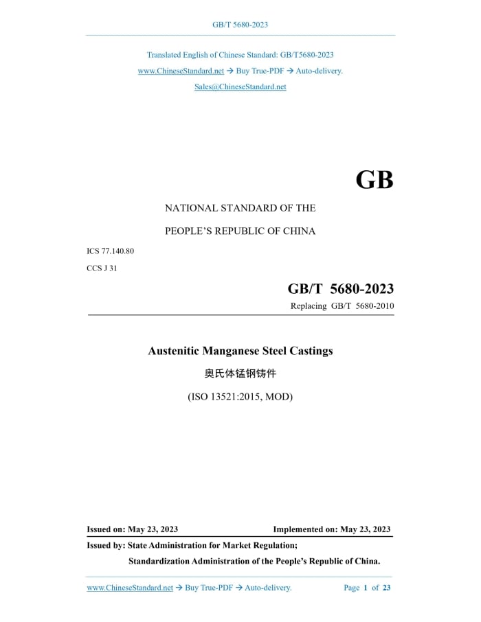 GB/T 5680-2023: Austenitic manganese steel castings Delivery: 9 seconds. True-PDF full-copy in English & invoice will be downloaded + auto-delivered via email. See step-by-step procedure Status: Valid GB/T 5680: Historical versions