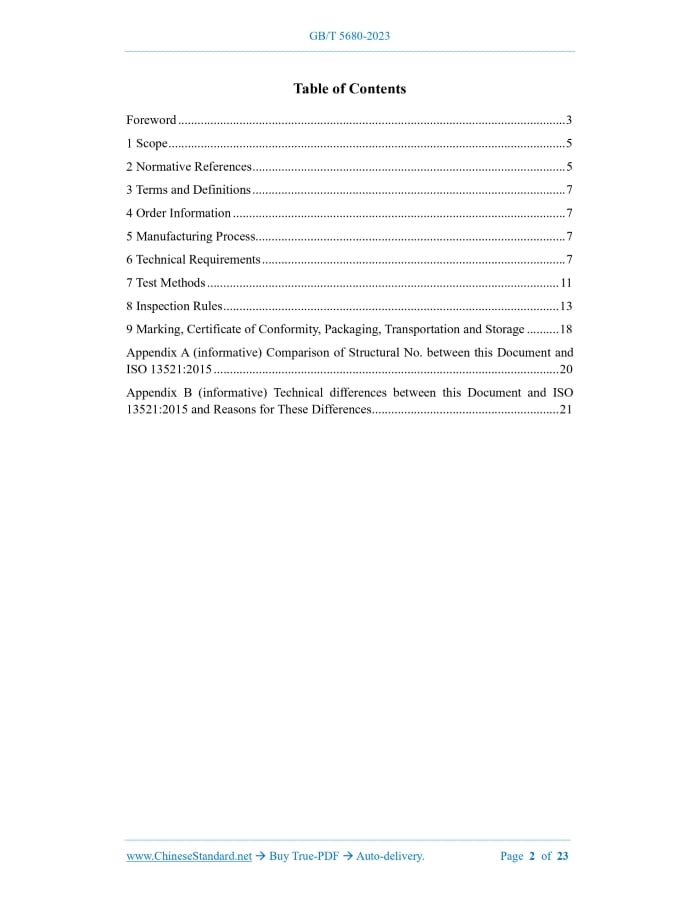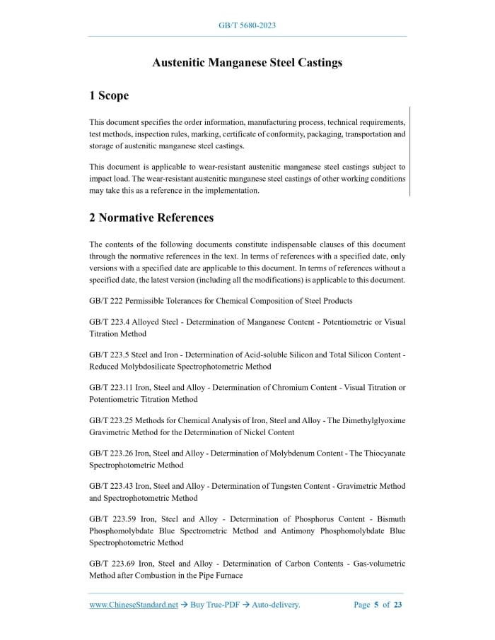 GB/T 5680-2023: Austenitic manganese steel castings---This is an excerpt. Full copy of true-PDF in English version (including equations, symbols, images, flow-chart, tables, and figures etc.), auto-downloaded/delivered in 9 seconds, can be purchased online: https://www.ChineseStandard.net/PDF.aspx/GBT5680-2023GB NATIONAL STANDARD OF THE PEOPLE’S REPUBLIC OF CHINA ICS 77.140.80 CCS J 31 Replacing GB/T 5680-2010 Austenitic Manganese Steel Castings (ISO 13521.2015, MOD) Issued on. MAY 23, 2023 Implemented on. MAY 23, 2023 Issued by. State Administration for Market Regulation; Standardization Administration of the People’s Republic of China. Table of ContentsForeword... 3 1 Scope... 5 2 Normative References... 5 3 Terms and Definitions... 7 4 Order Information... 7 5 Manufacturing Process... 7 6 Technical Requirements... 7 7 Test Methods... 11 8 Inspection Rules... 13 9 Marking, Certificate of Conformity, Packaging, Transportation and Storage... 18 Appendix A (informative) Comparison of Structural No. between this Document and ISO 13521.2015... 20 Appendix B (informative) Technical differences between this Document and ISO 13521.2015 and Reasons for These Differences... 21ForewordThis document was drafted in accordance with the rules provided in GB/T 1.1-2020 Directives for Standardization - Part 1.Rules for the Structure and Drafting of Standardizing Documents. This document serves as a replacement of GB/T 5680-2010 Austenitic Manganese Steel Castings. In comparison with GB/T 5680-2010, apart from structural adjustments and editorial modifications, the main technical changes are as follows. a) The expression method of five designations is modified (see Table 1; Table 1 of Version 2010); b) A designation of chromium-molybdenum austenitic manganese steel casting is added (see Table 1); c) The tensile properties and impact properties of some designations of manganese steel specimens are added (see Table 2); d) Metallographic structure and the corresponding test methods and inspection rules are added (see 6.4, 7.3 and 8.8); e) Room-temperature tensile properties and impact properties, and the corresponding test methods and inspection rules are added (see 6.6, 7.4 and 8.9); f) Bending properties and the corresponding test methods and inspection rules are added (see 6.6, 7.5 and 8.10); g) Test blocks are added to the inspection rules (see 8.4); h) The validity of tests is added to the inspection rules (see 8.5); i) Appendix A and Appendix B of Version 2010 are deleted (see Appendix A and Appendix B of Version 2010). This document modifies and adopts ISO 13521.2015 Austenitic Manganese Steel Castings. In comparison with ISO 13521.2015, this document has many structural adjustments. See Appendix A for a table of comparison of structural No. changes between the two documents. In comparison with ISO 13521.2015, this document has many technical differences, which are marked with a vertical single line () in the outer margin of the clauses involved. See Appendix B for a table of these technical differences and the reasons for these differences. Please be noted that certain content of this document may involve patents. The institution issuing this document does not undertake the responsibility of identifying these patents. This document was proposed by and shall be under the jurisdiction of National Technical Committee 54 on Foundry of Standardization Administration of China (SAC/TC 54). The drafting organizations of this document. Jinan University; Zhengzhou Dingsheng High- tech Energy Engineering Technology Co., Ltd.; Zhejiang Huasheng Metal Products Co., Ltd.; Zhejiang Wujing Machinery Manufacturing Co., Ltd.; Harbin Bo Shen Technology Development Co., Ltd.; Guangdong Torch Test Co., Ltd.; Jiangxi Copper Group (Dexing) Casting Co., Ltd.; Guangxi Great Wall Machinery Co., Ltd.; Zhejiang Yu Rong Industries Co., Ltd.; Shaoguan Qujiang Jinyang Wear-resistant Materials Co., Ltd.; Zhongtie Baoqiao Group Co., Ltd.; Hunan Zijing New Material Technology Co., Ltd.; Chengde Rongmao Cast Steel Co., Ltd.; Sanming Jinsheng Special Steel Co., Ltd.; Ningguo Dongfang Milling Material Co., Ltd.; Yunnan Kungang Wear-resistant Material Technology Co., Ltd.; Shaoguan Qirui Environmental Protection Equipment Co., Ltd.; Guangdong Jin Zhi Li Technology Co., Ltd.; Shandong Tianli Machinery Casting Co., Ltd.; Zhejiang Kaicheng Foundry Co., Ltd.; Shenyang Research Institute of Casting. The main drafters of this document. Li Wei, Lu Hongbo, Fang Dequan, Bin Yuanhong, Shan Yuhua, Zhu Jianfeng, Chen Jinxiang, Zhou Zheng, Li Wenzheng, Hu Yong, Zhao Dongkai, Feng Haibin, Xue Wenfeng, Wang Hanchao, Wang Jingrong, Liu Guobing, Cui Shaogang, Song Liang, Tu Xiaohui, Wang Jinghui, Qin Yanping, Fang Debiao, Jiang Qingwei, Li Echeng, Li Canhui, Yang Shangguang, Chen Hongjun, Cheng Jingchang. This document was firstly issued in 1985, firstly revised in 1998 and secondly revised in 2010. This is the third revision. Austenitic Manganese Steel Castings1 ScopeThis document specifies the order information, manufacturing process, technical requirements, test methods, inspection rules, marking, certificate of conformity, packaging, transportation and storage of austenitic manganese steel castings.2 Normative ReferencesThe contents of the following documents constitute indispensable clauses of this document through the normative references in the text. In terms of references with a specified date, only versions with a specified date are applicable to this document. In terms of references without a specified date, the latest version (including all the modifications) is applicable to this document. GB/T 222 Permissible Tolerances for Chemical Composition of Steel Products GB/T 223.4 Alloyed Steel - Determination of Manganese Content - Potentiometric or Visual Titration Method3 Terms and DefinitionsThe terms and definitions defined in GB/T 5611 are applicable to this document.4 Order Information4.1 The demand-side should specify the material desi