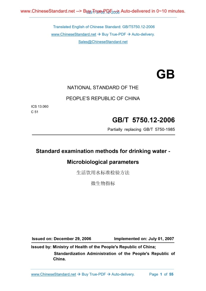 GB/T 5750.12-2006: Standard examination methods for drinking water -- Microbiological parameters Delivery: 9 seconds. True-PDF full-copy in English & invoice will be downloaded + auto-delivered via email. See step-by-step procedure Status: Obsolete GB/T 5750.12: Historical versions