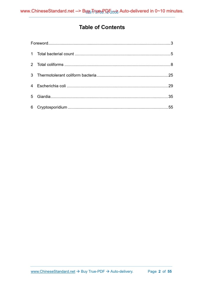 Similar standardsGB/T 5750.12-2006: Standard examination methods for drinking water -- Microbiological parameters---This is an excerpt. Full copy of true-PDF in English version (including equations, symbols, images, flow-chart, tables, and figures etc.), auto-downloaded/delivered in 9 seconds, can be purchased online: https://www.ChineseStandard.net/PDF.aspx/GBT5750.12-2006GB NATIONAL STANDARD OF THE PEOPLE’S REPUBLIC OF CHINA ICS 13.060 C 51 Partially replacing GB/T 5750-1985 Standard examination methods for drinking water - Microbiological parameters Issued on: DECEMBER 29, 2006 Implemented on: JULY 01, 2007 Issued by. Ministry of Health of the People's Republic of China; Standardization Administration of the People's Republic of China. Table of ContentsForeword. 3 1 Total bacterial count. 5 2 Total coliforms. 8 3 Thermotolerant coliform bacteria.. 25 4 Escherichia coli.. 29 5 Giardia.. 35 6 Cryptosporidium.. 55ForewordGB/T 5750 "Standard Test Method for Drinking Water" is divided into the following parts. - General principles; - Collection and preservation of water samples; - Water analysis quality control; - Organoleptic and physical parameters; - Nonmetal parameters; - Metal parameters; - Aggregate organic parameters; - Organic parameters; - Pesticides parameters; - Disinfection by-products parameters; - Disinfectants parameter; - Microbiological parameters; - Radiological parameters. This standard replaces total number of bacteria and total coliforms in the part II of GB/T 5750-1985 “Standard examination methods for drinking water”. As compared with GB/T 5750-1985, the main changes are as follows. - ADJUST the structure in accordance with GB/T 1.1-2000 “Directives for standardization - Part 1.Rules for the structure and drafting of standards”; - ADD 7 testing methods for 4 indicators including thermotolerant coliform bacteria, Escherichia coli, Giardia, and Cryptosporidium in drinking water.; This standard is proposed by and shall be under the jurisdiction of the Ministry of Health of the People's Republic of China. The responsible drafting organizations of this standard. China Center for Disease Control and Prevention Safety Institute for Environment and Health- related Product. Standard examination methods for drinking water - Microbiological parameters 1 Total bacterial count 1.1 Plate counting method 1.1.1 Scope This standard specifies the use of plate counting method for the determination of total bacterial counts in drinking water and its source water. This method applies to the determination of total bacterial counts in drinking water and its source water. 1.1.2 Terms and definitions The following terms and definitions apply to this standard. 1.1.2.1 Standard plate-count bacteria The total number of bacteria contained in 1 mL of water sample obtained after 48 h incubation at 37°C under aerobic conditions on nutrient agar. 1.1.3 Culture media and reagents 1.1.3.1 Nutrient agar 1.1.3.1.1 Ingredients. A Peptone 10 g B Beef paste 3 g C Sodium chloride 5 g D Agar 10 g ~ 20 g E Distilled water 1000 mL 1.1.3.1.2 Preparation method. After mixing above components, HEAT to dissolve it, ADJUST the pH to 7.4 ~ 7.6, CONTAIN it into glass containers (if 1.1.5.2.3 USE the sterile pipette to take undiluted water samples and two ~ three 1 mL of water samples of the appropriate dilution degree, respectively INJECT it into the sterilized plate. The following operation is the same as the drinking water testing procedure. 1.1.6 Colony counting and reporting methods When doing plate colony counting, it can use naked eye to directly observe it, if necessary, it shall make inspection with a magnifying glass to prevent omission. After recording the number of colonies in each plate, it shall calculate the average count of colonies in the same dilution, which is used for the calculation of next step. When obtaining the average of the dilutions, if one of the plates has more platelet-like colonies, it should not be used, but the plates without platelet colonies shall be used to calculate the average count of colonies of this dilution. If the platelet colonies are less than half of the plate, whilst the distribution of colony count on this other half is very even, the colonies of this half of plate is counted and multiplied by 2 to get the count of colonies of the entire plate. Then the average count of colonies of this dilution is calculated. 1.1.7 Selection and reporting methods for different dilutions 1.1.7.1 First SELECT the average count of colonies between 30 ~ 300 to make calculation, if the average count of colonies of only one dilution meet this range, then MULTIPLY the count of colonies by the dilution factor and REPORT it (SEE example 1 in Table 1). 1.1.7.2 If there are two dilutions, the count of colonies grown is between 30 ~ 300, it is determined depending on the ratio of the two, if the ratio is less than 2, it shall report the average of the two (such as example 2in Table 1). If the ratio is more than 2, it shall report the total count of colonies with a small dilution (example 3 in Table 1). If it is equal to 2, it shall also report the count of colonies of smaller dilution (SEE example 4 in Table 1). 1.1.7.3 If the average count of colonies of all dilutions is greater than 300, then it shall multiply the average count of colonies of the highest dilution by the dilution factor and report it (see Example 5 in Table 1). 1.1.7.4 If the average count of colonies of all dilutions is smaller than 30, then it shall multiply the average count of colonies of the lowest dilution by the dilution factor and report it (see Example 6 in Table 1). 1.1.7.5 If the average count of colonies of all dilutions is not between 30 ~ 300, then it shall multiply the average count of colonies closest to 30 or 300 by the dilution factor and report it (see Example 7 in Table 1). 1.1.7.6 If the plates of all dilutions are free from colony growth, it shall be reported as “undetected”. 2.1.4.9 Small inv