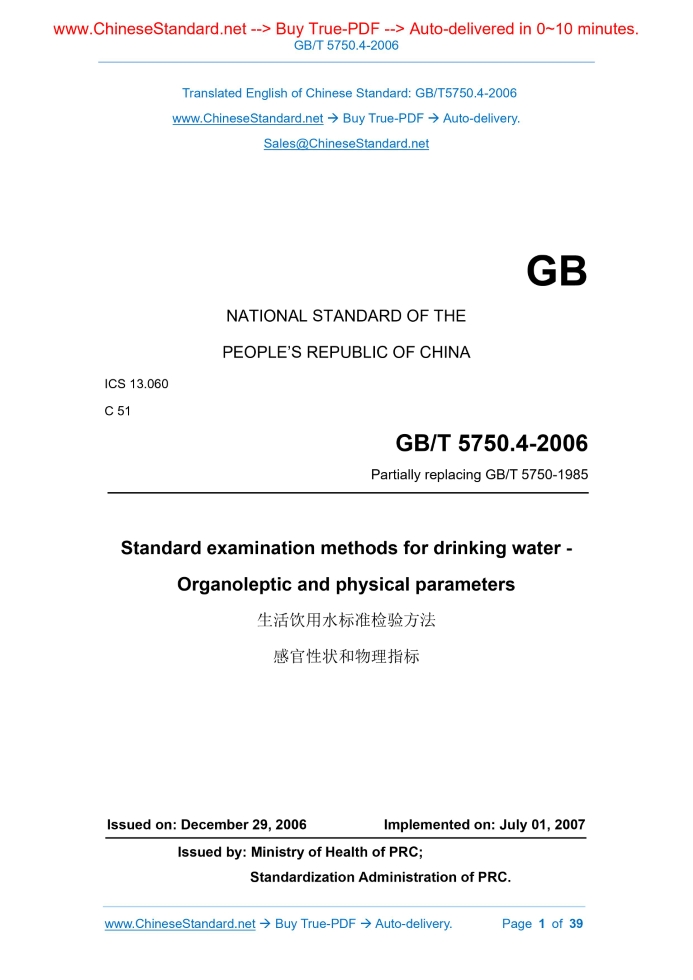 GB/T 5750.4-2006: Standard examination methods for drinking water -- Organoleptic and physical parameters Delivery: 9 seconds. True-PDF full-copy in English & invoice will be downloaded + auto-delivered via email. See step-by-step procedure Status: Obsolete GB/T 5750.4: Historical versions