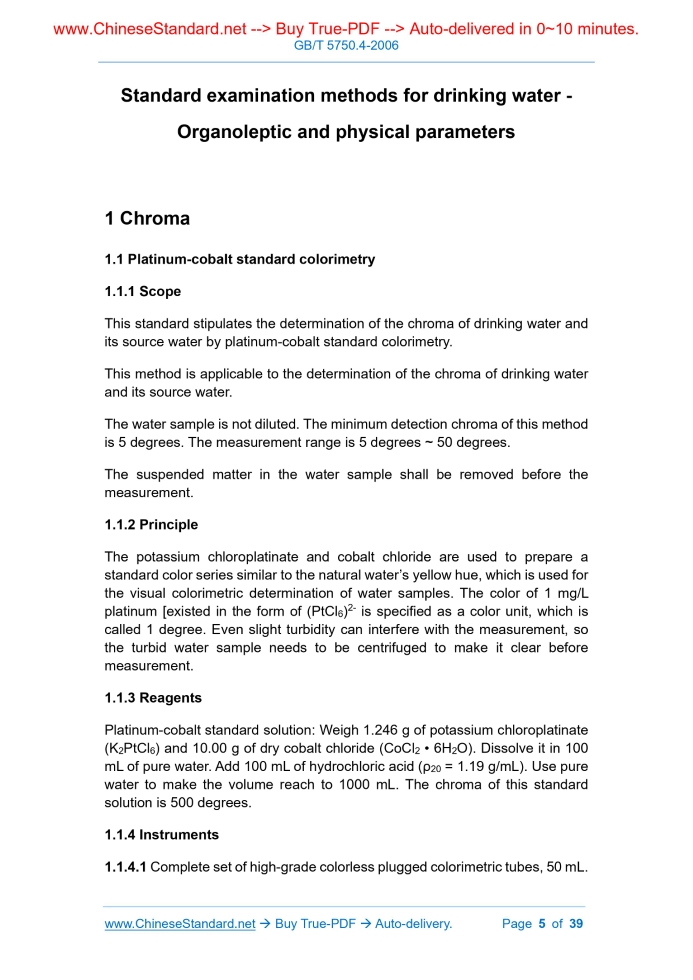 Similar standardsGB/T 5750.4-2006: Standard examination methods for drinking water -- Organoleptic and physical parameters---This is an excerpt. Full copy of true-PDF in English version (including equations, symbols, images, flow-chart, tables, and figures etc.), auto-downloaded/delivered in 9 seconds, can be purchased online: https://www.ChineseStandard.net/PDF.aspx/GBT5750.4-2006 NATIONAL STANDARD OF THE PEOPLE’S REPUBLIC OF CHINA ICS 13.060 C 51 Partially replacing GB/T 5750-1985 Standard examination methods for drinking water - Organoleptic and physical parameters Issued on: DECEMBER 29, 2006 Implemented on: JULY 01, 2007 Issued by. Ministry of Health of PRC; Standardization Administration of PRC. Table of ContentsForeword... 3 1 Chroma... 5 2 Turbidity... 6 3 Odor and taste... 9 4 Visible substances to the naked eye... 10 5 pH... 10 6 Conductivity... 18 7 Total hardness... 21 8 Total dissolved solids... 25 9 Volatile phenols... 27 10 Anionic synthetic detergent... 34 Standard examination methods for drinking water - Organoleptic and physical parameters1 Chroma1.1 Platinum-cobalt standard colorimetry 1.1.1 Scope This standard stipulates the determination of the chroma of drinking water and its source water by platinum-cobalt standard colorimetry. This method is applicable to the determination of the chroma of drinking water and its source water. The water sample is not diluted. The minimum detection chroma of this method is 5 degrees. The measurement range is 5 degrees ~ 50 degrees. The suspended matter in the water sample shall be removed before the measurement. 1.1.2 Principle The potassium chloroplatinate and cobalt chloride are used to prepare a standard color series similar to the natural water’s yellow hue, which is used for the visual colorimetric determination of water samples. The color of 1 mg/L platinum [existed in the form of (PtCl6)2- is specified as a color unit, which is called 1 degree. Even slight turbidity can interfere with the measurement, so the turbid water sample needs to be centrifuged to make it clear before measurement. 1.1.3 Reagents Platinum-cobalt standard solution. Weigh 1.246 g of potassium chloroplatinate (K2PtCl6) and 10.00 g of dry cobalt chloride (CoCl2 • 6H2O). Dissolve it in 100 mL of pure water. Add 100 mL of hydrochloric acid (ρ20 = 1.19 g/mL). Use pure water to make the volume reach to 1000 mL. The chroma of this standard solution is 500 degrees. 1.1.4 Instruments 1.1.4.1 Complete set of high-grade colorless plugged colorimetric tubes, 50 mL. The minimum detection turbidity of this method is 0.5 nephelometric turbidity unit (NTU). Turbidity is an indicator that reflects the physical characteristics of water source and drinking water. The turbidity of the source water is caused by optical scattering or absorption behavior due to suspended solids or colloidal substances, or both. 2.1.2 Principle Under the same conditions, the intensity of the scattered light of the Formazine standard suspension is compared with the intensity of scattered light of the water sample. The greater the intensity of the scattered light, the higher the turbidity. 2.1.3 Reagents 2.1.3.1 Pure water. Take distilled water and filter through a 0.2 μm membrane filter. 2.1.3.2 Hydrazine sulfate solution (10 g/L). Weigh 1.000 g of hydrazine sulfate [(NH2)2 • H2SO4, also known as hydrazine sulfate]. Dissolve it in pure water and make its volume reach to the mark in a 100 mL volumetric flask. Note. Hydrazine sulfate is carcinogenic. Avoid inhalation, ingestion, or skin contact! 2.1.3.3 Cyclo-hexamethylenetetramine solution (100 g/L). Weigh 10.00 g of cyclo-hexamethylenetetramine [(CH2)6N4]. Dissolve it in pure water and make its volume reach to the mark in a 100 mL volumetric flask. 2.1.3.4 Standard suspension of Formazine. Respectively pipette 5.00 mL of hydrazine sulfate solution and 5.00 mL of cyclo-hexamethylenetetramine solution in a 100 mL volumetric flask. Mix it uniformly. After placing at 25 °C ± 3 °C for 24 h. Add pure water to the mark and mix it uniformly. This standard suspension has a turbidity of 400 NTU and can be used for about one month. 2.1.3.5 Formazine turbidity standard use solution. Use pure water to dilute the Formazine turbidity standard suspension (2.1.3.4) 10 times. The turbidity of this suspension is 40 NTU. It shall be appropriately diluted during use according to the need. 2.1.4 Instruments Scattering turbidity meter. 2.1.5 Analytical procedures 5.1.1 Scope This standard specifies the determination of the pH value of domestic drinking water and its source water by the glass electrode method. This method is applicable to the determination of the pH value of domestic drinking water and its source water. The pH value determined by this method can be accurate to 0.01. The pH value is the logarithm of the reciprocal of hydrogen ion’s activity in water. The chroma, turbidity, free chlorine, oxidant, reducing agent, higher salt content of water does not interfere with the measurement. However, in a strong alkaline solution, when a large amount of sodium ions is present, an error will occur, which will make the reading relatively low. 5.1.2 Principle The glass electrode is used as the indicator electrode, the saturated calomel electrode is used as the reference electrode, which are inserted into the solution to form a primary battery. When the hydrogen ion’s concentration changes, the electromotive force between the glass electrode and the calomel electrode also changes. At 25 °C, each unit of the pH scale is equivalent to 59.1 mV electromotive force’s change, directly represented by the pH reading on the instrument. There is a temperature difference compensation device on the instrument. 5.1.3 Reagents 5.1.3.1 Potassium hydrogen phthalate standard buffer solution. Weigh 10.21 g of potassium hydrogen phthalate (KHC8H4O4) which had been dried at 105 °C for 2 h. Dissolve it in pure water and dilute to 1000 mL. The pH value of this solution 