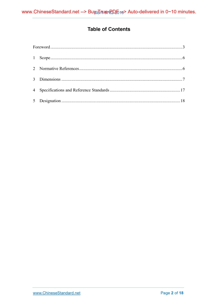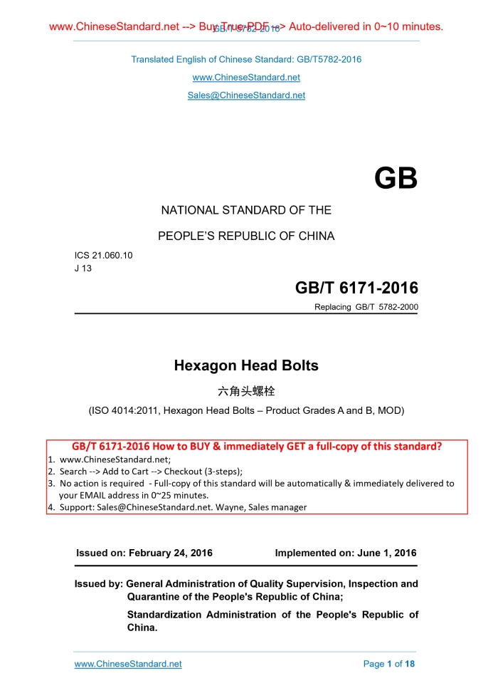GB/T 5782-2016: Hexagon head bolts---This is an excerpt. Full copy of true-PDF in English version (including equations, symbols, images, flow-chart, tables, and figures etc.), auto-downloaded/delivered in 9 seconds, can be purchased online: https://www.ChineseStandard.net/PDF.aspx/GBT5782-2016GB NATIONAL STANDARD OF THE PEOPLE’S REPUBLIC OF CHINA ICS 21.060.10 J 13 GB/T 6171-2016 Replacing GB/T 5782-2000 Hexagon Head Bolts (ISO 4014.2011, Hexagon Head Bolts – Product Grades A and B, MOD) Issued on. FEBRUARY 24, 2016 Implemented on. JUNE 1, 2016 Issued by. General Administration of Quality Supervision, Inspection and Quarantine of the People's Republic of China; Standardization Administration of the People's Republic of China. Table of ContentsForeword... 3 1 Scope... 6 2 Normative References... 6 3 Dimensions... 7 4 Specifications and Reference Standards... 17 5 Designation... 18ForewordThis Standard belongs to a national standards series “Hexagon Nuts (Part)”. The series comprises the following. -- GB/T 27 Hexagon Fit Shank Bolts -- GB/T 28 Hexagon Fit Shank Bolts with Split Pin Hole on Shank -- GB/T 29.1 Hexagon Bolts with Slot on Head -- GB/T 29.2 Hexagon Bolts with Cross Recess on Head -- GB/T 31.1 Hexagon Bolts with Split Pin Hole on Shank -- GB/T 31.2 Hexagon Bolts with Split Pin Hole on Shank – Reduced Shank – Product Grade B -- GB/T 31.3 Hexagon Bolts with Split Pin Hole on Shank – Fine Pitch Thread - Product Grades A and B -- GB/T 32.1 Hexagon bolts with wire holes on head – Product Grades A and B -- GB/T 32.2 Hexagon Bolts with Wire Holes on Head – Reduced Shank – Product Grade B -- GB/T 32.3 Hexagon Bolts with Wire Holes on Head – Fine Pitch Thread – Product Grades A and B -- GB/T 5780 Hexagon Head Bolts – Product Grade C -- GB/T 5781 Hexagon Head Bolts – Full Thread – Product Grade C -- GB/T 5782 Hexagon Head Bolts -- GB/T 5783 Hexagon Head Bolts – Full Thread -- GB/T 5784 Hexagon Head Bolts – Reduced Shank – Product Grade B -- GB/T 5785 Hexagon Head Bolts – Fine Pitch Thread -- GB/T 5786 Hexagon Head Bolts with Fine Pitch Thread – Full Thread This Standard was drafted in accordance with the rules given in GB/T 1.1-2009. This Standard replaces GB/T 5782-2000, Hexagon Head Bolts. Compared with GB/T 5782-2000, the main technical differences are as follows. -- it deletes “If, in special cases, specifications other than those listed in this Standard are required, they can be selected from existing Standards,... GB/T 3098.6 and GB/T 3103.1.” (Chapter 1, Edition 2000); -- it unifies reference thread standards into GB/T 193 and GB/T 9145 (Chapter 2); -- it specifies the surface defects only for the steel products. GB/T 5779.1 (Table 3); -- it adds that the surface of steel bolts is as processed and deletes oxidized (Table 3); -- it adds the technical requirements of non-electrolytically applied zinc flake coatings of steel bolts (Table 3); -- it adds the technical requirements of passivating treatment of stainless steel nuts in accordance with GB/T 5267.4 (Table 3); -- it adds the technical requirements of electroplating of non-ferrous metal bolts in accordance with GB/T 5267.1; and -- it is only allowed to omit Designation that the surface is as processed (5.2). This Standard was redrafted by reference to ISO 4014.2011, Hexagon Head Bolts – Product Grades A and B (English edition). The technical differences between this Standard and ISO 4014.2011 and their reasons are as follows. -- it deletes the specification of ISO 4014, “If, in special cases, specifications other than those listed in this International Standard are required, they can be selected from existing International Standards,... ISO 4753 and 4759-1” (Chapter 1), which does not belong to the content of this Standard; -- in the Normative References, it uses Chinese standards to replace the international standards (Chapter 2), adds the references of GB/T 90.2 (Table 3), GB/T 193 (Table 3), GB/T 9145 (Table 3), GB/T 5267.4 (Table 3) and GB/T 1237 (5.1), and deletes the references of ISO 724 and ISO 965-1, in order to meet Chinese basic standards of fasteners; -- it adds the technical requirements of passivating treatment of stainless steel bolts (Table 3) and extend the scope of product use; -- it adds the technical requirements of packaging (Table 3), in order to meet Chinese basic standards of fasteners; and -- it modifies the Example of Designation into the Simplified Example of Designation (5.2), in order to meet the specifications of GB/T 1237. The following editorial modifications are made in this Standard. -- it changes the name of the standard; and -- it deletes the Bibliography of ISO 4014. This Standard was proposed by China Machinery Industry Federation. This Standard shall be under the jurisdiction of the National Standardization Technical Committee on Fasteners (SAC/TC 85). The responsible drafting organizations of this Standard. China Productivity Center for Machinery. The participating drafting organizations of this Standard. Ningbo Ningli High-Strength Fastener Industrial Co., Ltd., Hangzhou Hualing Steel Structure High-tensile Bolts Co., Ltd., Shanghai Shenguang High Strength Bolts Co., Ltd., Zhejiang Rixing Standard Parts Co., Ltd., Zhejiang Haili Co., Ltd., Xuzhou Ruida High Strength Fastener Factory, Zhejiang Tong Ming Stainless-steel Products Co., Ltd., Shanghai Biao Wu High Tensile Fasteners Co., Ltd., Shaoxing Sunny High Strength Fasteners Co., Ltd., Ningbo Jiulong Fasteners Manufacture Co., Ltd., Shanghai Jinma High Strength Fastener Co., Ltd., Shangdong Tengda Stainless Steel Products, Co., Ltd. and Wenzhou Xinde Electric Power Fittings Co.,Ltd. This Standard shall be interpreted by the Secretariat of the National Standardization Technical Committee on Fasteners. The previous editions replaced by this Standards are as follows. -- GB 30-1958, GB 21-1958, GB 22-1958, GB 30-1966, GB 21-1966, GB 22-1966, GB30-1976, GB21-1976, GB22-1976; -- GB/T 5782-1986